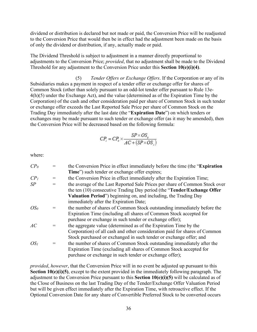 36 dividend or distribution is declared but not made or paid, the Conversion Price will be readjusted to the Conversion Price that would then be in effect had the adjustment been made on the basis of only the dividend or distribution, if any, actually made or paid. The Dividend Threshold is subject to adjustment in a manner directly proportional to adjustments to the Conversion Price; provided, that no adjustment shall be made to the Dividend Threshold for any adjustment to the Conversion Price under this Section 10(e)(i)(4). (5) Tender Offers or Exchange Offers. If the Corporation or any of its Subsidiaries makes a payment in respect of a tender offer or exchange offer for shares of Common Stock (other than solely pursuant to an odd-lot tender offer pursuant to Rule 13e- 4(h)(5) under the Exchange Act), and the value (determined as of the Expiration Time by the Corporation) of the cash and other consideration paid per share of Common Stock in such tender or exchange offer exceeds the Last Reported Sale Price per share of Common Stock on the Trading Day immediately after the last date (the “Expiration Date”) on which tenders or exchanges may be made pursuant to such tender or exchange offer (as it may be amended), then the Conversion Price will be decreased based on the following formula: where: CP0 = the Conversion Price in effect immediately before the time (the “Expiration Time”) such tender or exchange offer expires; CP1 = the Conversion Price in effect immediately after the Expiration Time; SP = the average of the Last Reported Sale Prices per share of Common Stock over the ten (10) consecutive Trading Day period (the “Tender/Exchange Offer Valuation Period”) beginning on, and including, the Trading Day immediately after the Expiration Date; OS0 = the number of shares of Common Stock outstanding immediately before the Expiration Time (including all shares of Common Stock accepted for purchase or exchange in such tender or exchange offer); AC = the aggregate value (determined as of the Expiration Time by the Corporation) of all cash and other consideration paid for shares of Common Stock purchased or exchanged in such tender or exchange offer; and OS1 = the number of shares of Common Stock outstanding immediately after the Expiration Time (excluding all shares of Common Stock accepted for purchase or exchange in such tender or exchange offer); provided, however, that the Conversion Price will in no event be adjusted up pursuant to this Section 10(e)(i)(5), except to the extent provided in the immediately following paragraph. The adjustment to the Conversion Price pursuant to this Section 10(e)(i)(5) will be calculated as of the Close of Business on the last Trading Day of the Tender/Exchange Offer Valuation Period but will be given effect immediately after the Expiration Time, with retroactive effect. If the Optional Conversion Date for any share of Convertible Preferred Stock to be converted occurs