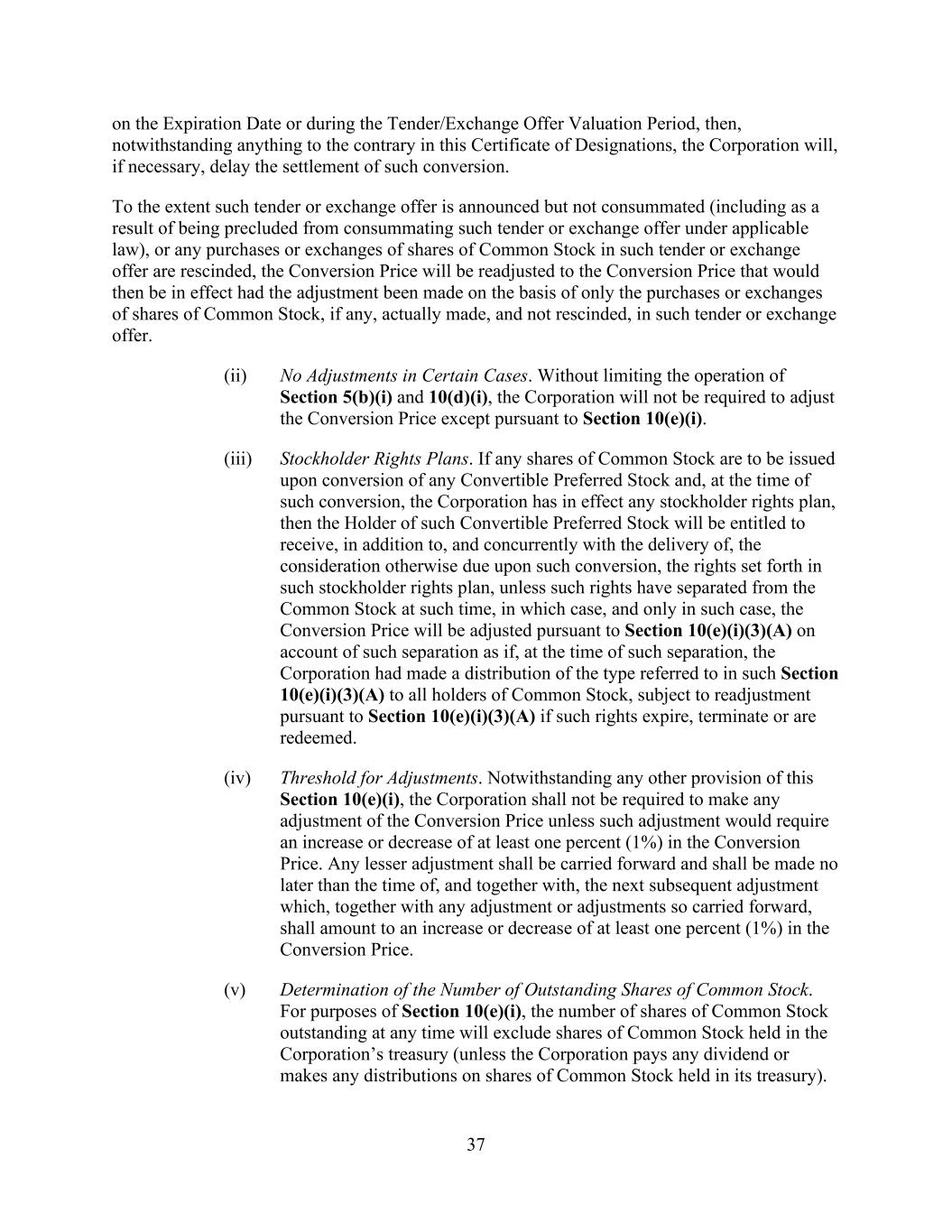 37 on the Expiration Date or during the Tender/Exchange Offer Valuation Period, then, notwithstanding anything to the contrary in this Certificate of Designations, the Corporation will, if necessary, delay the settlement of such conversion. To the extent such tender or exchange offer is announced but not consummated (including as a result of being precluded from consummating such tender or exchange offer under applicable law), or any purchases or exchanges of shares of Common Stock in such tender or exchange offer are rescinded, the Conversion Price will be readjusted to the Conversion Price that would then be in effect had the adjustment been made on the basis of only the purchases or exchanges of shares of Common Stock, if any, actually made, and not rescinded, in such tender or exchange offer. (ii) No Adjustments in Certain Cases. Without limiting the operation of Section 5(b)(i) and 10(d)(i), the Corporation will not be required to adjust the Conversion Price except pursuant to Section 10(e)(i). (iii) Stockholder Rights Plans. If any shares of Common Stock are to be issued upon conversion of any Convertible Preferred Stock and, at the time of such conversion, the Corporation has in effect any stockholder rights plan, then the Holder of such Convertible Preferred Stock will be entitled to receive, in addition to, and concurrently with the delivery of, the consideration otherwise due upon such conversion, the rights set forth in such stockholder rights plan, unless such rights have separated from the Common Stock at such time, in which case, and only in such case, the Conversion Price will be adjusted pursuant to Section 10(e)(i)(3)(A) on account of such separation as if, at the time of such separation, the Corporation had made a distribution of the type referred to in such Section 10(e)(i)(3)(A) to all holders of Common Stock, subject to readjustment pursuant to Section 10(e)(i)(3)(A) if such rights expire, terminate or are redeemed. (iv) Threshold for Adjustments. Notwithstanding any other provision of this Section 10(e)(i), the Corporation shall not be required to make any adjustment of the Conversion Price unless such adjustment would require an increase or decrease of at least one percent (1%) in the Conversion Price. Any lesser adjustment shall be carried forward and shall be made no later than the time of, and together with, the next subsequent adjustment which, together with any adjustment or adjustments so carried forward, shall amount to an increase or decrease of at least one percent (1%) in the Conversion Price. (v) Determination of the Number of Outstanding Shares of Common Stock. For purposes of Section 10(e)(i), the number of shares of Common Stock outstanding at any time will exclude shares of Common Stock held in the Corporation’s treasury (unless the Corporation pays any dividend or makes any distributions on shares of Common Stock held in its treasury).