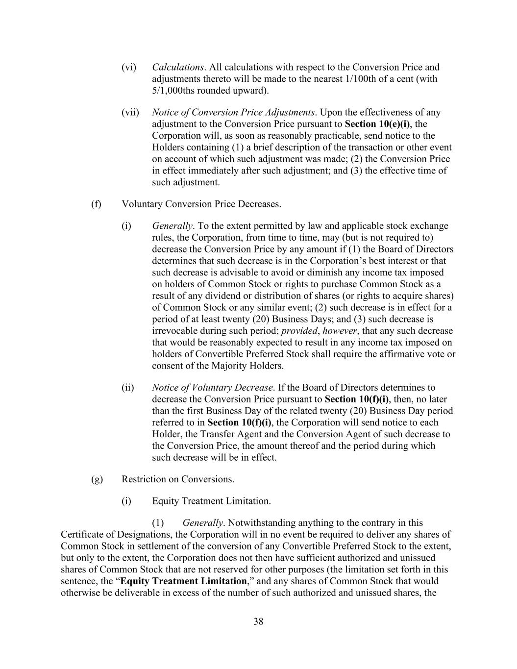 38 (vi) Calculations. All calculations with respect to the Conversion Price and adjustments thereto will be made to the nearest 1/100th of a cent (with 5/1,000ths rounded upward). (vii) Notice of Conversion Price Adjustments. Upon the effectiveness of any adjustment to the Conversion Price pursuant to Section 10(e)(i), the Corporation will, as soon as reasonably practicable, send notice to the Holders containing (1) a brief description of the transaction or other event on account of which such adjustment was made; (2) the Conversion Price in effect immediately after such adjustment; and (3) the effective time of such adjustment. (f) Voluntary Conversion Price Decreases. (i) Generally. To the extent permitted by law and applicable stock exchange rules, the Corporation, from time to time, may (but is not required to) decrease the Conversion Price by any amount if (1) the Board of Directors determines that such decrease is in the Corporation’s best interest or that such decrease is advisable to avoid or diminish any income tax imposed on holders of Common Stock or rights to purchase Common Stock as a result of any dividend or distribution of shares (or rights to acquire shares) of Common Stock or any similar event; (2) such decrease is in effect for a period of at least twenty (20) Business Days; and (3) such decrease is irrevocable during such period; provided, however, that any such decrease that would be reasonably expected to result in any income tax imposed on holders of Convertible Preferred Stock shall require the affirmative vote or consent of the Majority Holders. (ii) Notice of Voluntary Decrease. If the Board of Directors determines to decrease the Conversion Price pursuant to Section 10(f)(i), then, no later than the first Business Day of the related twenty (20) Business Day period referred to in Section 10(f)(i), the Corporation will send notice to each Holder, the Transfer Agent and the Conversion Agent of such decrease to the Conversion Price, the amount thereof and the period during which such decrease will be in effect. (g) Restriction on Conversions. (i) Equity Treatment Limitation. (1) Generally. Notwithstanding anything to the contrary in this Certificate of Designations, the Corporation will in no event be required to deliver any shares of Common Stock in settlement of the conversion of any Convertible Preferred Stock to the extent, but only to the extent, the Corporation does not then have sufficient authorized and unissued shares of Common Stock that are not reserved for other purposes (the limitation set forth in this sentence, the “Equity Treatment Limitation,” and any shares of Common Stock that would otherwise be deliverable in excess of the number of such authorized and unissued shares, the
