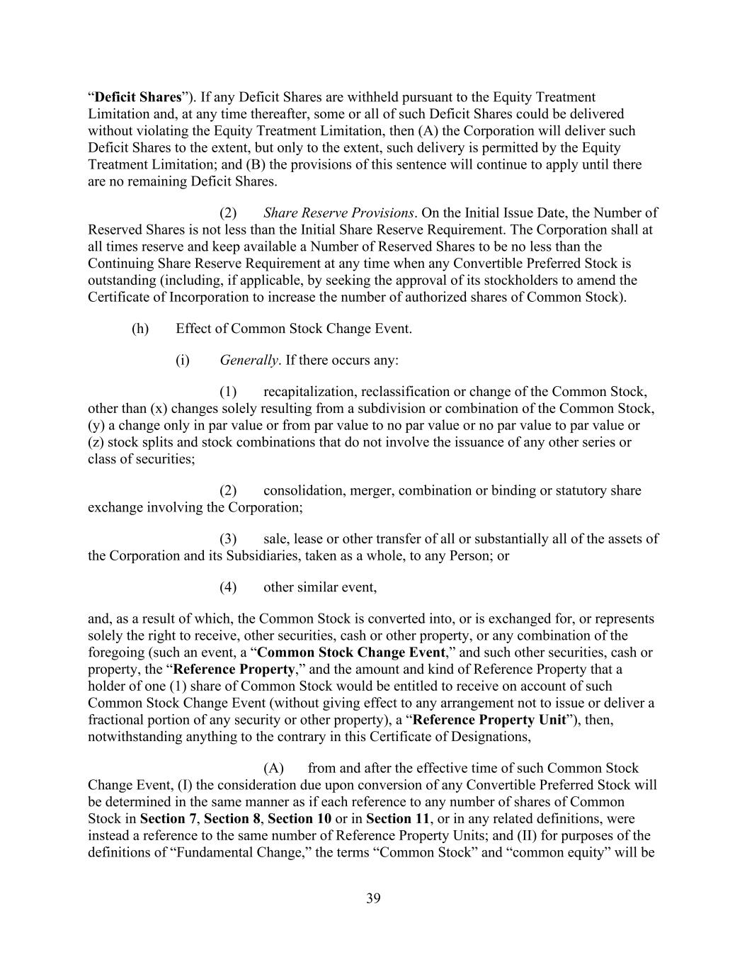 39 “Deficit Shares”). If any Deficit Shares are withheld pursuant to the Equity Treatment Limitation and, at any time thereafter, some or all of such Deficit Shares could be delivered without violating the Equity Treatment Limitation, then (A) the Corporation will deliver such Deficit Shares to the extent, but only to the extent, such delivery is permitted by the Equity Treatment Limitation; and (B) the provisions of this sentence will continue to apply until there are no remaining Deficit Shares. (2) Share Reserve Provisions. On the Initial Issue Date, the Number of Reserved Shares is not less than the Initial Share Reserve Requirement. The Corporation shall at all times reserve and keep available a Number of Reserved Shares to be no less than the Continuing Share Reserve Requirement at any time when any Convertible Preferred Stock is outstanding (including, if applicable, by seeking the approval of its stockholders to amend the Certificate of Incorporation to increase the number of authorized shares of Common Stock). (h) Effect of Common Stock Change Event. (i) Generally. If there occurs any: (1) recapitalization, reclassification or change of the Common Stock, other than (x) changes solely resulting from a subdivision or combination of the Common Stock, (y) a change only in par value or from par value to no par value or no par value to par value or (z) stock splits and stock combinations that do not involve the issuance of any other series or class of securities; (2) consolidation, merger, combination or binding or statutory share exchange involving the Corporation; (3) sale, lease or other transfer of all or substantially all of the assets of the Corporation and its Subsidiaries, taken as a whole, to any Person; or (4) other similar event, and, as a result of which, the Common Stock is converted into, or is exchanged for, or represents solely the right to receive, other securities, cash or other property, or any combination of the foregoing (such an event, a “Common Stock Change Event,” and such other securities, cash or property, the “Reference Property,” and the amount and kind of Reference Property that a holder of one (1) share of Common Stock would be entitled to receive on account of such Common Stock Change Event (without giving effect to any arrangement not to issue or deliver a fractional portion of any security or other property), a “Reference Property Unit”), then, notwithstanding anything to the contrary in this Certificate of Designations, (A) from and after the effective time of such Common Stock Change Event, (I) the consideration due upon conversion of any Convertible Preferred Stock will be determined in the same manner as if each reference to any number of shares of Common Stock in Section 7, Section 8, Section 10 or in Section 11, or in any related definitions, were instead a reference to the same number of Reference Property Units; and (II) for purposes of the definitions of “Fundamental Change,” the terms “Common Stock” and “common equity” will be