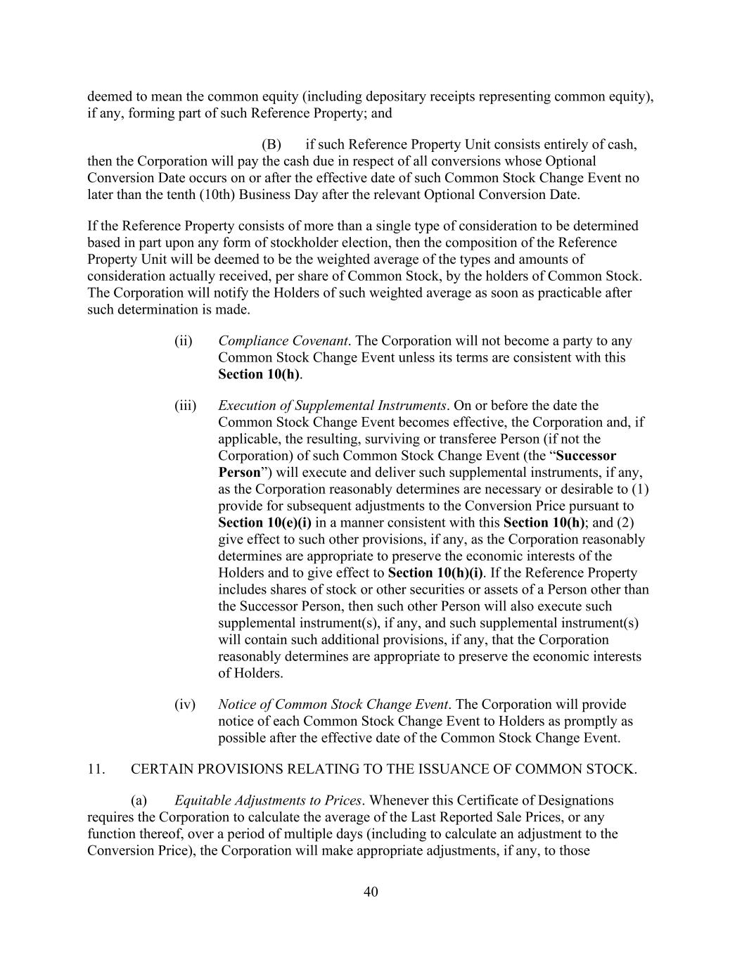 40 deemed to mean the common equity (including depositary receipts representing common equity), if any, forming part of such Reference Property; and (B) if such Reference Property Unit consists entirely of cash, then the Corporation will pay the cash due in respect of all conversions whose Optional Conversion Date occurs on or after the effective date of such Common Stock Change Event no later than the tenth (10th) Business Day after the relevant Optional Conversion Date. If the Reference Property consists of more than a single type of consideration to be determined based in part upon any form of stockholder election, then the composition of the Reference Property Unit will be deemed to be the weighted average of the types and amounts of consideration actually received, per share of Common Stock, by the holders of Common Stock. The Corporation will notify the Holders of such weighted average as soon as practicable after such determination is made. (ii) Compliance Covenant. The Corporation will not become a party to any Common Stock Change Event unless its terms are consistent with this Section 10(h). (iii) Execution of Supplemental Instruments. On or before the date the Common Stock Change Event becomes effective, the Corporation and, if applicable, the resulting, surviving or transferee Person (if not the Corporation) of such Common Stock Change Event (the “Successor Person”) will execute and deliver such supplemental instruments, if any, as the Corporation reasonably determines are necessary or desirable to (1) provide for subsequent adjustments to the Conversion Price pursuant to Section 10(e)(i) in a manner consistent with this Section 10(h); and (2) give effect to such other provisions, if any, as the Corporation reasonably determines are appropriate to preserve the economic interests of the Holders and to give effect to Section 10(h)(i). If the Reference Property includes shares of stock or other securities or assets of a Person other than the Successor Person, then such other Person will also execute such supplemental instrument(s), if any, and such supplemental instrument(s) will contain such additional provisions, if any, that the Corporation reasonably determines are appropriate to preserve the economic interests of Holders. (iv) Notice of Common Stock Change Event. The Corporation will provide notice of each Common Stock Change Event to Holders as promptly as possible after the effective date of the Common Stock Change Event. 11. CERTAIN PROVISIONS RELATING TO THE ISSUANCE OF COMMON STOCK. (a) Equitable Adjustments to Prices. Whenever this Certificate of Designations requires the Corporation to calculate the average of the Last Reported Sale Prices, or any function thereof, over a period of multiple days (including to calculate an adjustment to the Conversion Price), the Corporation will make appropriate adjustments, if any, to those