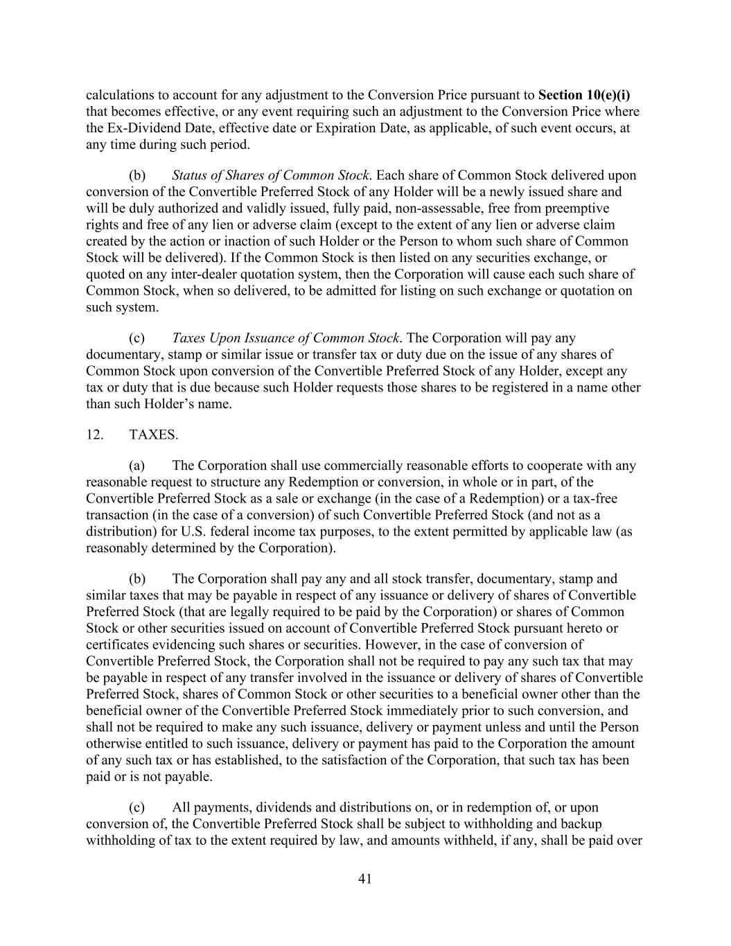 41 calculations to account for any adjustment to the Conversion Price pursuant to Section 10(e)(i) that becomes effective, or any event requiring such an adjustment to the Conversion Price where the Ex-Dividend Date, effective date or Expiration Date, as applicable, of such event occurs, at any time during such period. (b) Status of Shares of Common Stock. Each share of Common Stock delivered upon conversion of the Convertible Preferred Stock of any Holder will be a newly issued share and will be duly authorized and validly issued, fully paid, non-assessable, free from preemptive rights and free of any lien or adverse claim (except to the extent of any lien or adverse claim created by the action or inaction of such Holder or the Person to whom such share of Common Stock will be delivered). If the Common Stock is then listed on any securities exchange, or quoted on any inter-dealer quotation system, then the Corporation will cause each such share of Common Stock, when so delivered, to be admitted for listing on such exchange or quotation on such system. (c) Taxes Upon Issuance of Common Stock. The Corporation will pay any documentary, stamp or similar issue or transfer tax or duty due on the issue of any shares of Common Stock upon conversion of the Convertible Preferred Stock of any Holder, except any tax or duty that is due because such Holder requests those shares to be registered in a name other than such Holder’s name. 12. TAXES. (a) The Corporation shall use commercially reasonable efforts to cooperate with any reasonable request to structure any Redemption or conversion, in whole or in part, of the Convertible Preferred Stock as a sale or exchange (in the case of a Redemption) or a tax-free transaction (in the case of a conversion) of such Convertible Preferred Stock (and not as a distribution) for U.S. federal income tax purposes, to the extent permitted by applicable law (as reasonably determined by the Corporation). (b) The Corporation shall pay any and all stock transfer, documentary, stamp and similar taxes that may be payable in respect of any issuance or delivery of shares of Convertible Preferred Stock (that are legally required to be paid by the Corporation) or shares of Common Stock or other securities issued on account of Convertible Preferred Stock pursuant hereto or certificates evidencing such shares or securities. However, in the case of conversion of Convertible Preferred Stock, the Corporation shall not be required to pay any such tax that may be payable in respect of any transfer involved in the issuance or delivery of shares of Convertible Preferred Stock, shares of Common Stock or other securities to a beneficial owner other than the beneficial owner of the Convertible Preferred Stock immediately prior to such conversion, and shall not be required to make any such issuance, delivery or payment unless and until the Person otherwise entitled to such issuance, delivery or payment has paid to the Corporation the amount of any such tax or has established, to the satisfaction of the Corporation, that such tax has been paid or is not payable. (c) All payments, dividends and distributions on, or in redemption of, or upon conversion of, the Convertible Preferred Stock shall be subject to withholding and backup withholding of tax to the extent required by law, and amounts withheld, if any, shall be paid over