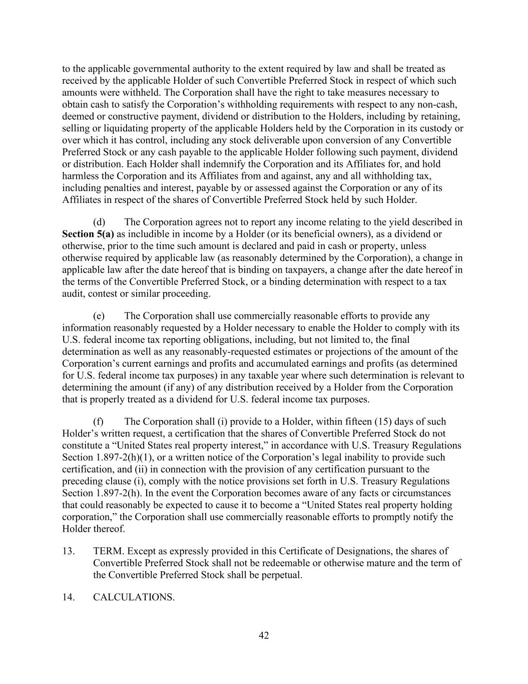 42 to the applicable governmental authority to the extent required by law and shall be treated as received by the applicable Holder of such Convertible Preferred Stock in respect of which such amounts were withheld. The Corporation shall have the right to take measures necessary to obtain cash to satisfy the Corporation’s withholding requirements with respect to any non-cash, deemed or constructive payment, dividend or distribution to the Holders, including by retaining, selling or liquidating property of the applicable Holders held by the Corporation in its custody or over which it has control, including any stock deliverable upon conversion of any Convertible Preferred Stock or any cash payable to the applicable Holder following such payment, dividend or distribution. Each Holder shall indemnify the Corporation and its Affiliates for, and hold harmless the Corporation and its Affiliates from and against, any and all withholding tax, including penalties and interest, payable by or assessed against the Corporation or any of its Affiliates in respect of the shares of Convertible Preferred Stock held by such Holder. (d) The Corporation agrees not to report any income relating to the yield described in Section 5(a) as includible in income by a Holder (or its beneficial owners), as a dividend or otherwise, prior to the time such amount is declared and paid in cash or property, unless otherwise required by applicable law (as reasonably determined by the Corporation), a change in applicable law after the date hereof that is binding on taxpayers, a change after the date hereof in the terms of the Convertible Preferred Stock, or a binding determination with respect to a tax audit, contest or similar proceeding. (e) The Corporation shall use commercially reasonable efforts to provide any information reasonably requested by a Holder necessary to enable the Holder to comply with its U.S. federal income tax reporting obligations, including, but not limited to, the final determination as well as any reasonably-requested estimates or projections of the amount of the Corporation’s current earnings and profits and accumulated earnings and profits (as determined for U.S. federal income tax purposes) in any taxable year where such determination is relevant to determining the amount (if any) of any distribution received by a Holder from the Corporation that is properly treated as a dividend for U.S. federal income tax purposes. (f) The Corporation shall (i) provide to a Holder, within fifteen (15) days of such Holder’s written request, a certification that the shares of Convertible Preferred Stock do not constitute a “United States real property interest,” in accordance with U.S. Treasury Regulations Section 1.897-2(h)(1), or a written notice of the Corporation’s legal inability to provide such certification, and (ii) in connection with the provision of any certification pursuant to the preceding clause (i), comply with the notice provisions set forth in U.S. Treasury Regulations Section 1.897-2(h). In the event the Corporation becomes aware of any facts or circumstances that could reasonably be expected to cause it to become a “United States real property holding corporation,” the Corporation shall use commercially reasonable efforts to promptly notify the Holder thereof. 13. TERM. Except as expressly provided in this Certificate of Designations, the shares of Convertible Preferred Stock shall not be redeemable or otherwise mature and the term of the Convertible Preferred Stock shall be perpetual. 14. CALCULATIONS.