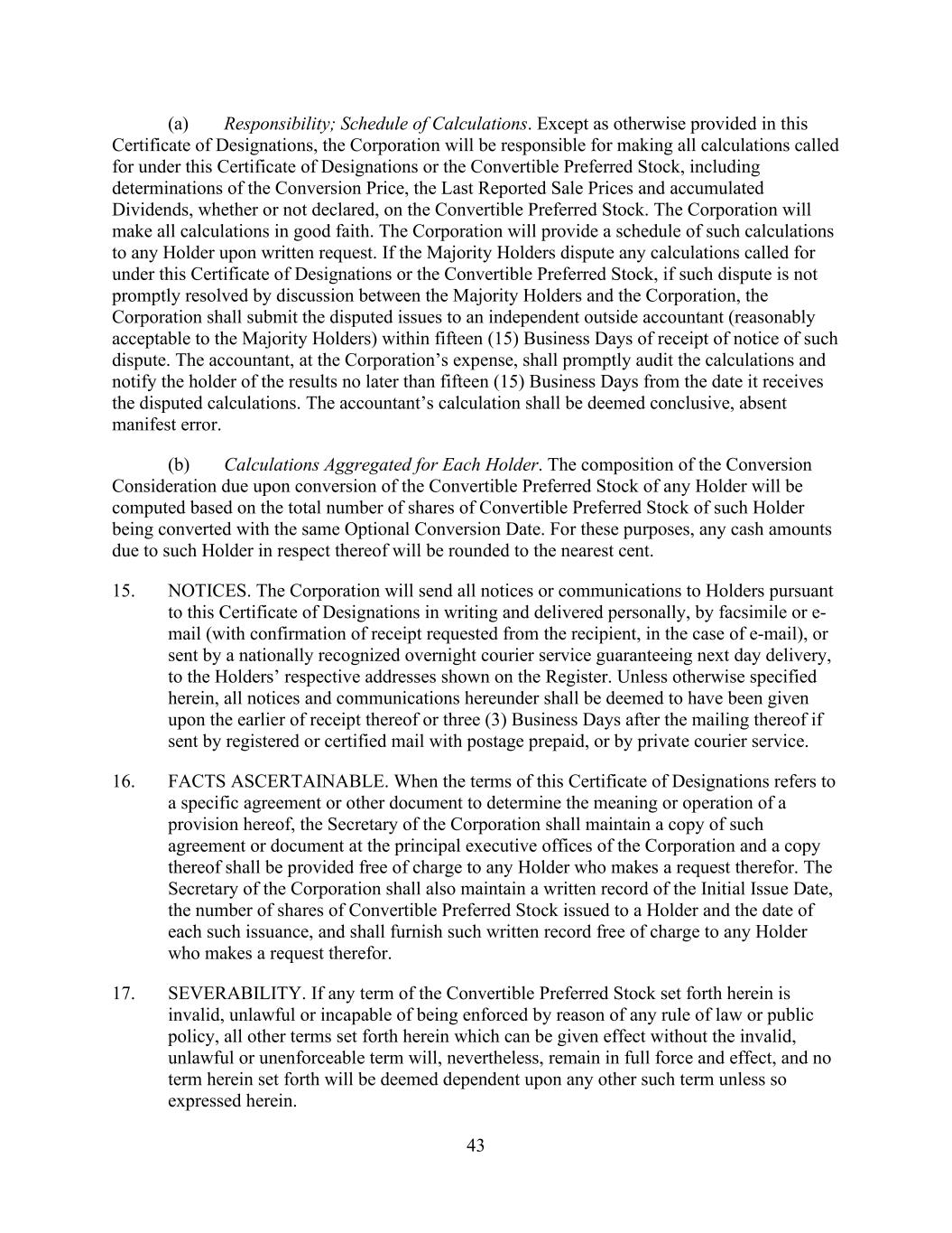 43 (a) Responsibility; Schedule of Calculations. Except as otherwise provided in this Certificate of Designations, the Corporation will be responsible for making all calculations called for under this Certificate of Designations or the Convertible Preferred Stock, including determinations of the Conversion Price, the Last Reported Sale Prices and accumulated Dividends, whether or not declared, on the Convertible Preferred Stock. The Corporation will make all calculations in good faith. The Corporation will provide a schedule of such calculations to any Holder upon written request. If the Majority Holders dispute any calculations called for under this Certificate of Designations or the Convertible Preferred Stock, if such dispute is not promptly resolved by discussion between the Majority Holders and the Corporation, the Corporation shall submit the disputed issues to an independent outside accountant (reasonably acceptable to the Majority Holders) within fifteen (15) Business Days of receipt of notice of such dispute. The accountant, at the Corporation’s expense, shall promptly audit the calculations and notify the holder of the results no later than fifteen (15) Business Days from the date it receives the disputed calculations. The accountant’s calculation shall be deemed conclusive, absent manifest error. (b) Calculations Aggregated for Each Holder. The composition of the Conversion Consideration due upon conversion of the Convertible Preferred Stock of any Holder will be computed based on the total number of shares of Convertible Preferred Stock of such Holder being converted with the same Optional Conversion Date. For these purposes, any cash amounts due to such Holder in respect thereof will be rounded to the nearest cent. 15. NOTICES. The Corporation will send all notices or communications to Holders pursuant to this Certificate of Designations in writing and delivered personally, by facsimile or e- mail (with confirmation of receipt requested from the recipient, in the case of e-mail), or sent by a nationally recognized overnight courier service guaranteeing next day delivery, to the Holders’ respective addresses shown on the Register. Unless otherwise specified herein, all notices and communications hereunder shall be deemed to have been given upon the earlier of receipt thereof or three (3) Business Days after the mailing thereof if sent by registered or certified mail with postage prepaid, or by private courier service. 16. FACTS ASCERTAINABLE. When the terms of this Certificate of Designations refers to a specific agreement or other document to determine the meaning or operation of a provision hereof, the Secretary of the Corporation shall maintain a copy of such agreement or document at the principal executive offices of the Corporation and a copy thereof shall be provided free of charge to any Holder who makes a request therefor. The Secretary of the Corporation shall also maintain a written record of the Initial Issue Date, the number of shares of Convertible Preferred Stock issued to a Holder and the date of each such issuance, and shall furnish such written record free of charge to any Holder who makes a request therefor. 17. SEVERABILITY. If any term of the Convertible Preferred Stock set forth herein is invalid, unlawful or incapable of being enforced by reason of any rule of law or public policy, all other terms set forth herein which can be given effect without the invalid, unlawful or unenforceable term will, nevertheless, remain in full force and effect, and no term herein set forth will be deemed dependent upon any other such term unless so expressed herein.