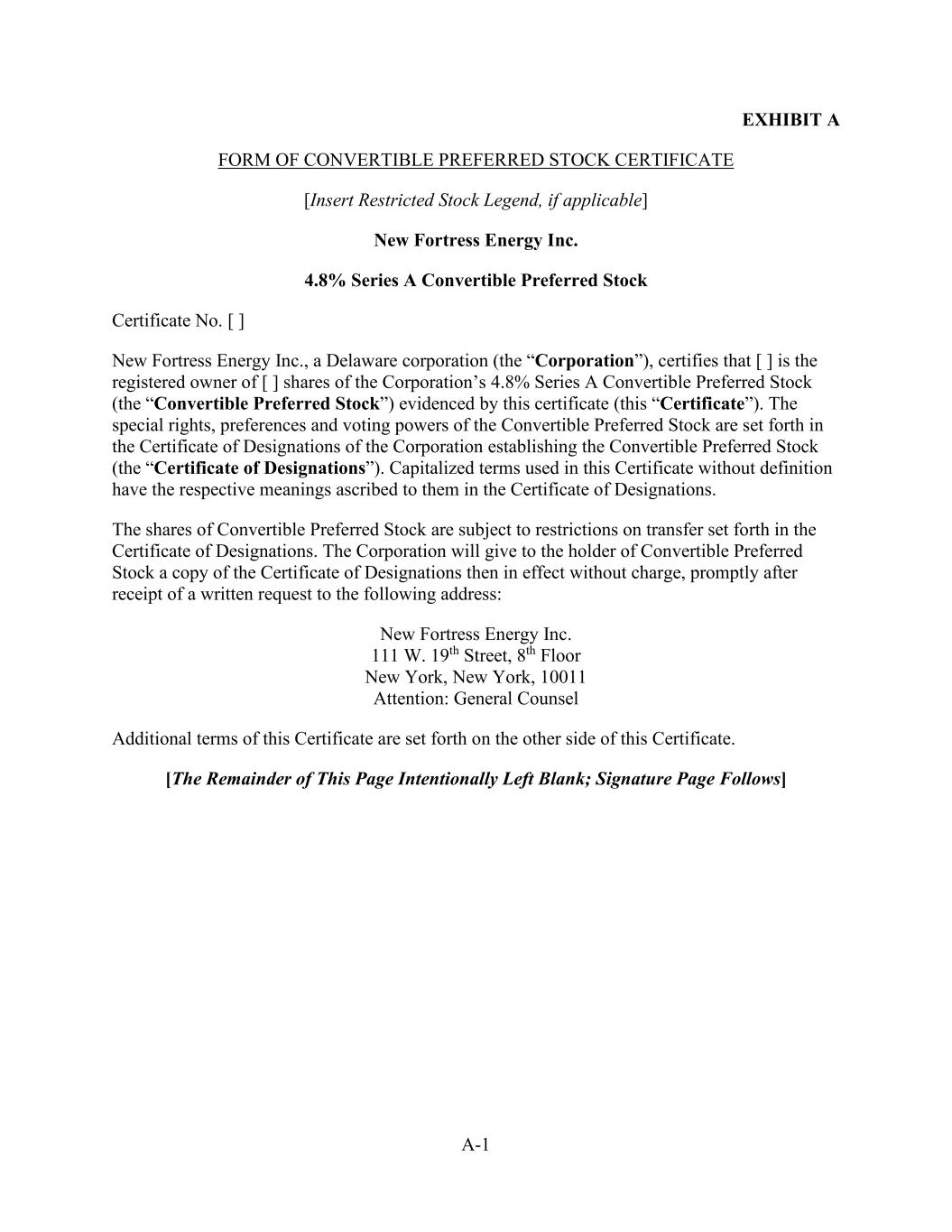 A-1 EXHIBIT A FORM OF CONVERTIBLE PREFERRED STOCK CERTIFICATE [Insert Restricted Stock Legend, if applicable] New Fortress Energy Inc. 4.8% Series A Convertible Preferred Stock Certificate No. [ ] New Fortress Energy Inc., a Delaware corporation (the “Corporation”), certifies that [ ] is the registered owner of [ ] shares of the Corporation’s 4.8% Series A Convertible Preferred Stock (the “Convertible Preferred Stock”) evidenced by this certificate (this “Certificate”). The special rights, preferences and voting powers of the Convertible Preferred Stock are set forth in the Certificate of Designations of the Corporation establishing the Convertible Preferred Stock (the “Certificate of Designations”). Capitalized terms used in this Certificate without definition have the respective meanings ascribed to them in the Certificate of Designations. The shares of Convertible Preferred Stock are subject to restrictions on transfer set forth in the Certificate of Designations. The Corporation will give to the holder of Convertible Preferred Stock a copy of the Certificate of Designations then in effect without charge, promptly after receipt of a written request to the following address: New Fortress Energy Inc. 111 W. 19th Street, 8th Floor New York, New York, 10011 Attention: General Counsel Additional terms of this Certificate are set forth on the other side of this Certificate. [The Remainder of This Page Intentionally Left Blank; Signature Page Follows]