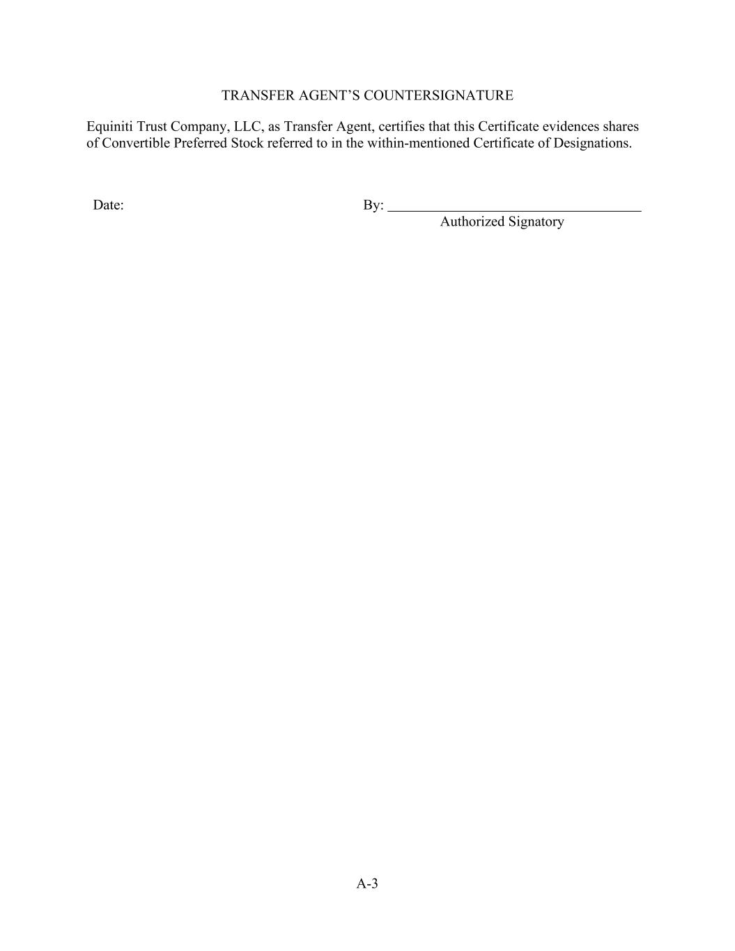 A-3 TRANSFER AGENT’S COUNTERSIGNATURE Equiniti Trust Company, LLC, as Transfer Agent, certifies that this Certificate evidences shares of Convertible Preferred Stock referred to in the within-mentioned Certificate of Designations. Date: By: Authorized Signatory