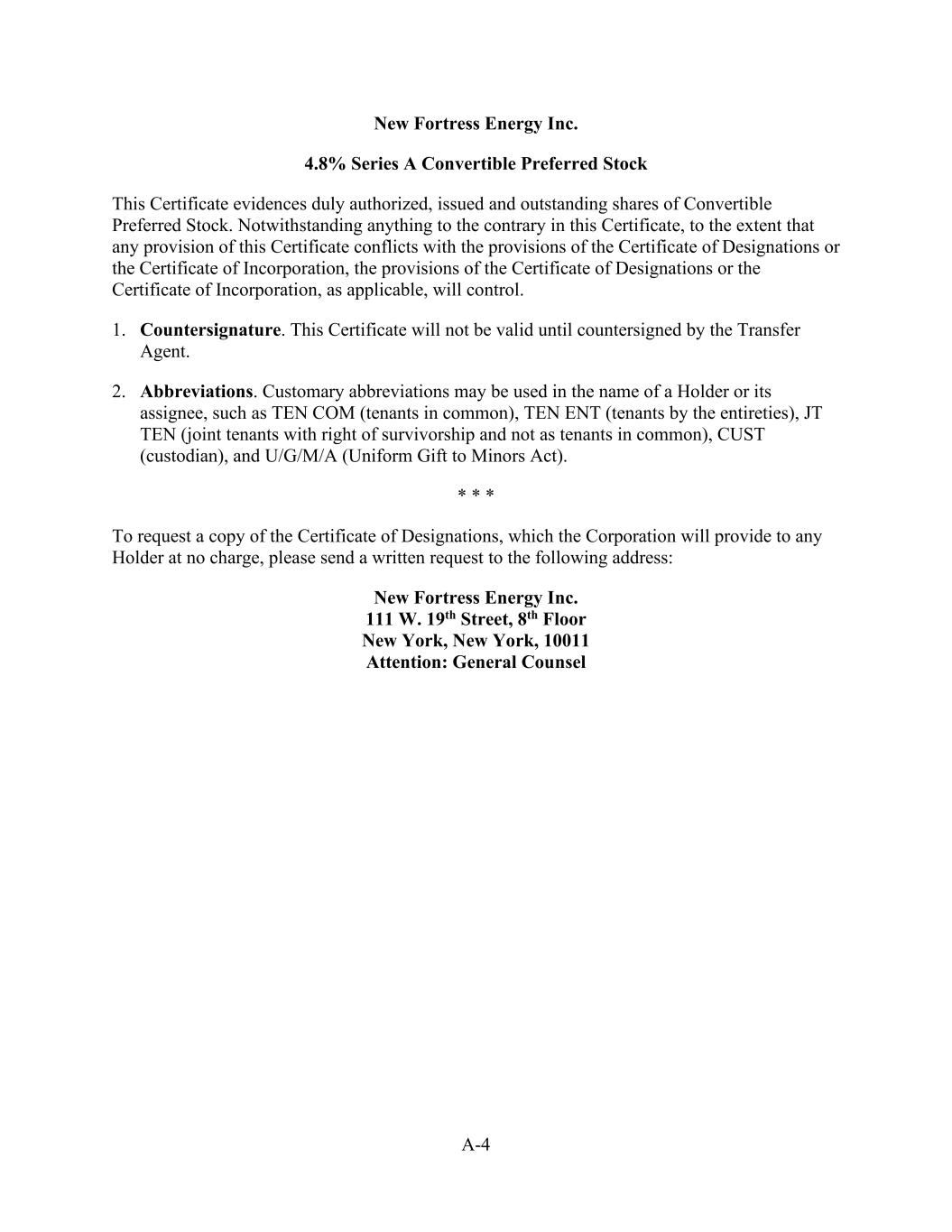 A-4 New Fortress Energy Inc. 4.8% Series A Convertible Preferred Stock This Certificate evidences duly authorized, issued and outstanding shares of Convertible Preferred Stock. Notwithstanding anything to the contrary in this Certificate, to the extent that any provision of this Certificate conflicts with the provisions of the Certificate of Designations or the Certificate of Incorporation, the provisions of the Certificate of Designations or the Certificate of Incorporation, as applicable, will control. 1. Countersignature. This Certificate will not be valid until countersigned by the Transfer Agent. 2. Abbreviations. Customary abbreviations may be used in the name of a Holder or its assignee, such as TEN COM (tenants in common), TEN ENT (tenants by the entireties), JT TEN (joint tenants with right of survivorship and not as tenants in common), CUST (custodian), and U/G/M/A (Uniform Gift to Minors Act). * * * To request a copy of the Certificate of Designations, which the Corporation will provide to any Holder at no charge, please send a written request to the following address: New Fortress Energy Inc. 111 W. 19th Street, 8th Floor New York, New York, 10011 Attention: General Counsel