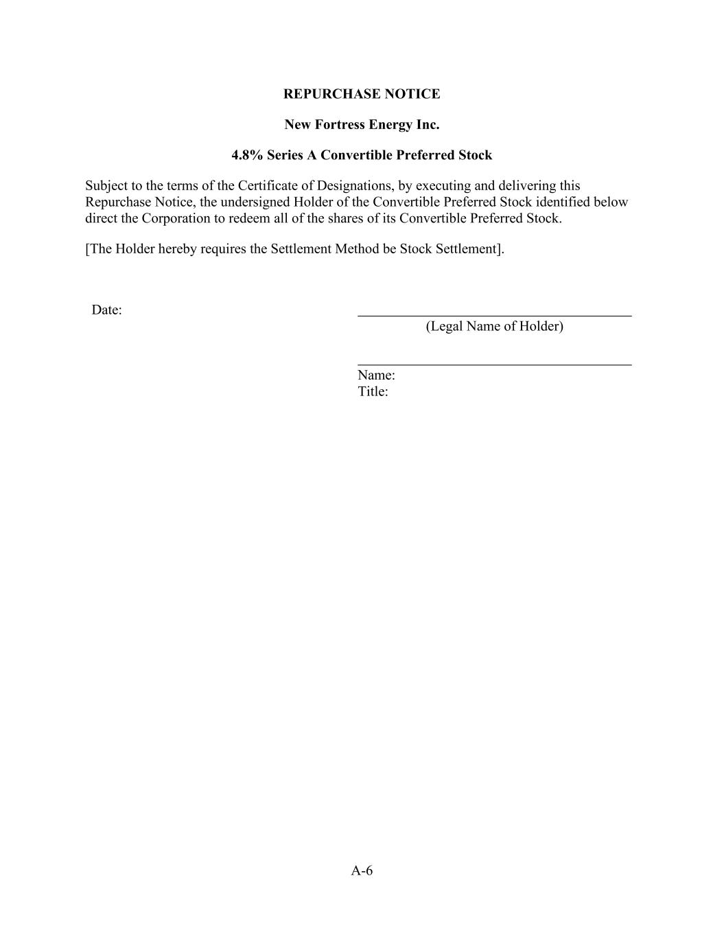 A-6 REPURCHASE NOTICE New Fortress Energy Inc. 4.8% Series A Convertible Preferred Stock Subject to the terms of the Certificate of Designations, by executing and delivering this Repurchase Notice, the undersigned Holder of the Convertible Preferred Stock identified below direct the Corporation to redeem all of the shares of its Convertible Preferred Stock. [The Holder hereby requires the Settlement Method be Stock Settlement]. Date: (Legal Name of Holder) Name: Title: