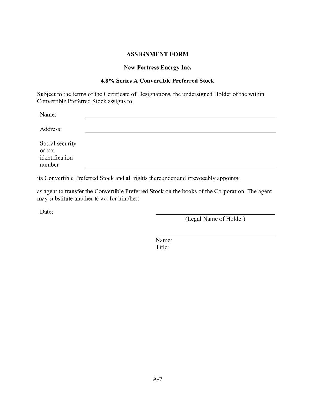 A-7 ASSIGNMENT FORM New Fortress Energy Inc. 4.8% Series A Convertible Preferred Stock Subject to the terms of the Certificate of Designations, the undersigned Holder of the within Convertible Preferred Stock assigns to: Name: Address: Social security or tax identification number its Convertible Preferred Stock and all rights thereunder and irrevocably appoints: as agent to transfer the Convertible Preferred Stock on the books of the Corporation. The agent may substitute another to act for him/her. Date: (Legal Name of Holder) Name: Title: