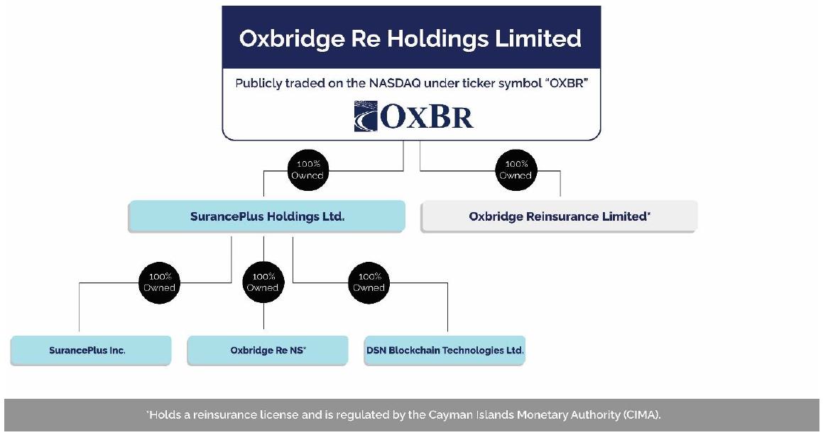 Unless the context dictates otherwise, references to “we,” “us,” “our,” “our company,” or “the Company” in this Annual Report on Form 10-K refer to Oxbridge Re Holdings Limited and its wholly-owned subsidiaries, Oxbridge Reinsurance Limited, SurancePlus Holdings Ltd., Oxbridge Re NS, SurancePlus Inc. and DSN Blockchain Technologies Ltd.