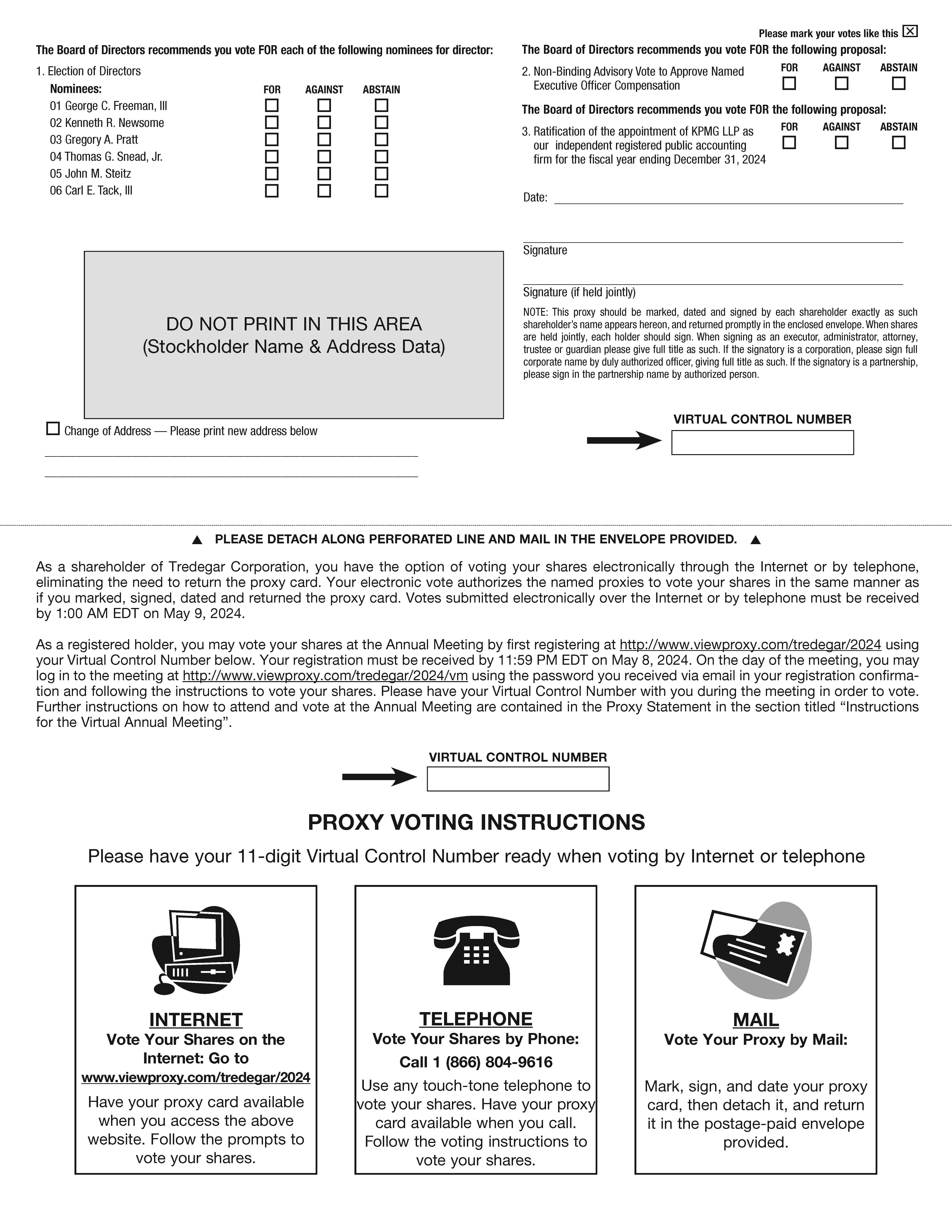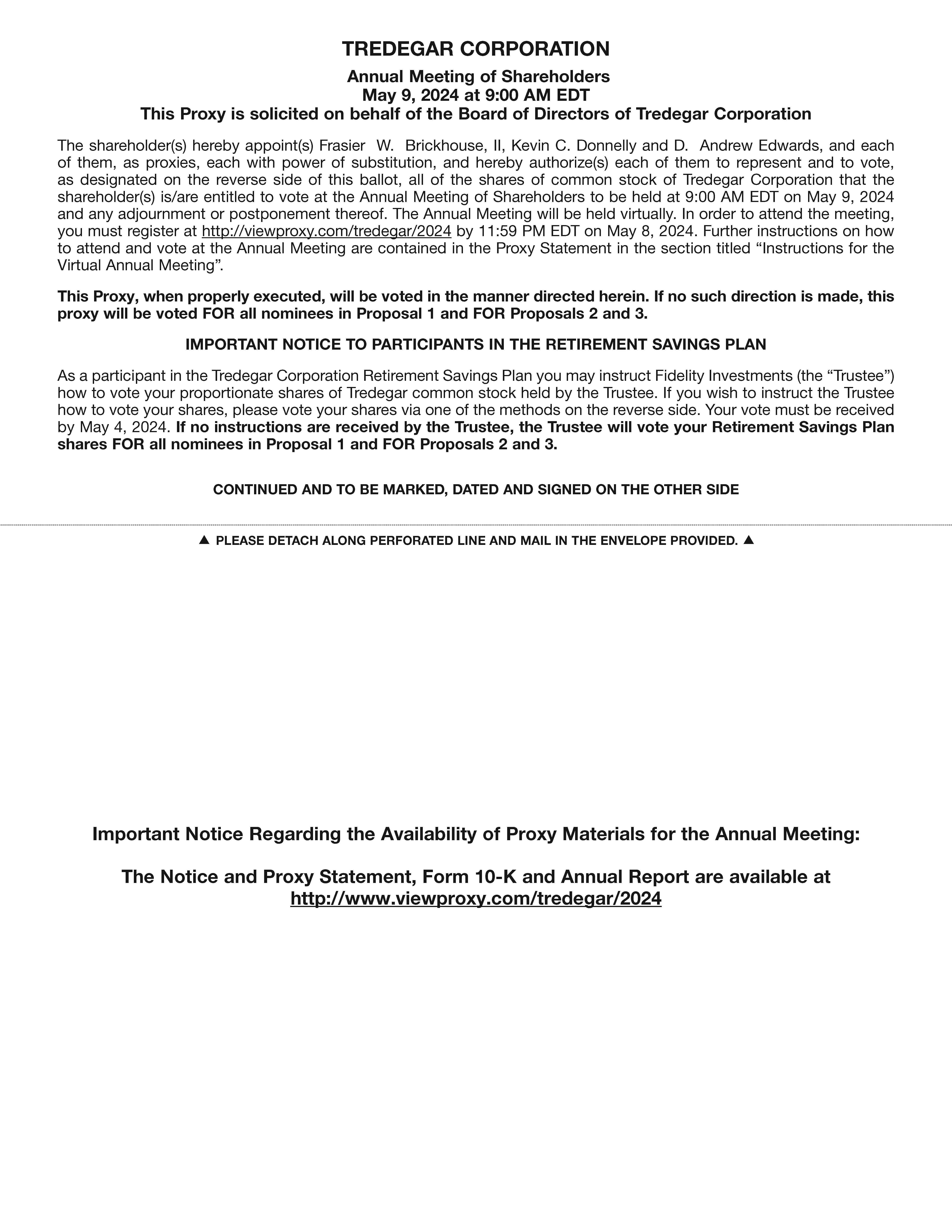The Board of Directors of Tredegar Corporation cordially invites you to attend the 2024 Annual Meeting of Shareholders. At the annual meeting, you will be asked: