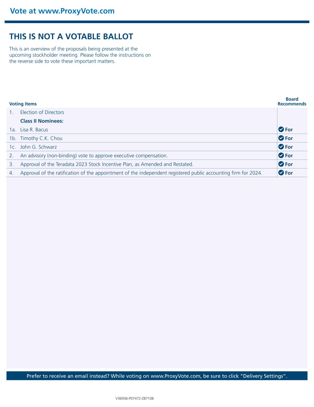 Vote at www.ProxyVote.com Prefer to receive an email instead? While voting on www.ProxyVote.com, be sure to click “Delivery Settings”. Voting Items Board Recommends V36936-P07472-Z87108 THIS IS NOT A VOTABLE BALLOT This is an overview of the proposals being presented at the upcoming stockholder meeting. Please follow the instructions on the reverse side to vote these important matters. 1. Election of Directors Class II Nominees: 1a. Lisa R. Bacus For 1b. Timothy C.K. Chou For 1c. John G. Schwarz For 2. An advisory (non-binding) vote to approve executive compensation. For 3. Approval of the Teradata 2023 Stock Incentive Plan, as Amended and Restated. For 4. Approval of the ratification of the appointment of the independent registered public accounting firm for 2024. For