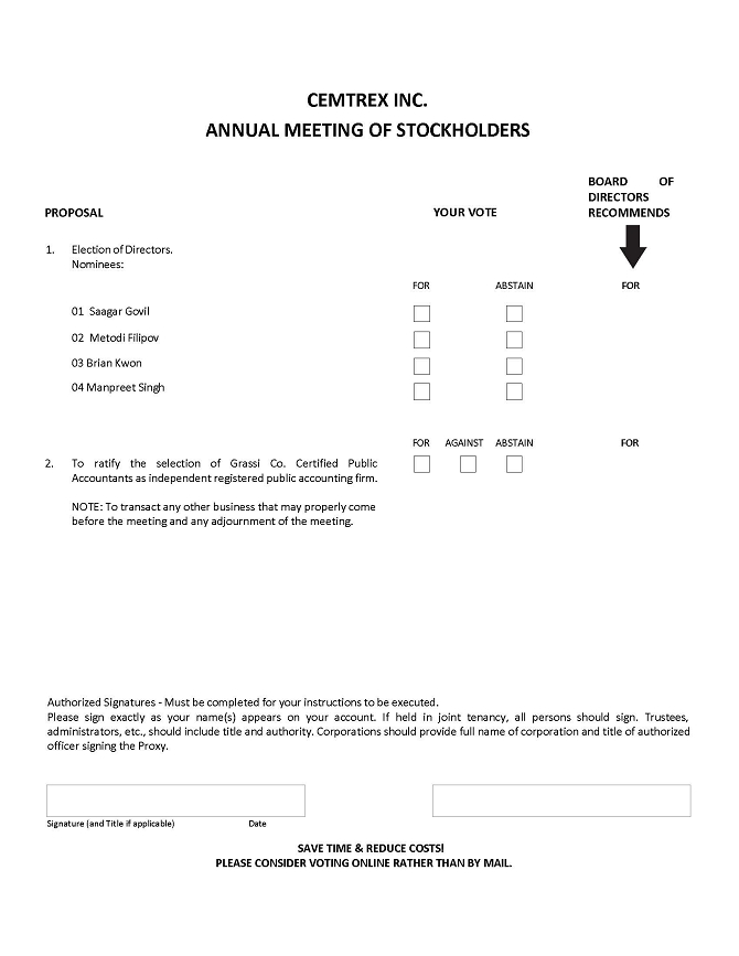 “FOR” the election of each of the four nominees, Saagar Govil, Metodi Filipov, Brian Kwon, and Manpreet Singh proposed by the Board of Directors to serve as directors, each for a term of one year or until Cemtrex’s 2024 Annual Meeting of Stockholders (Proposal 1);