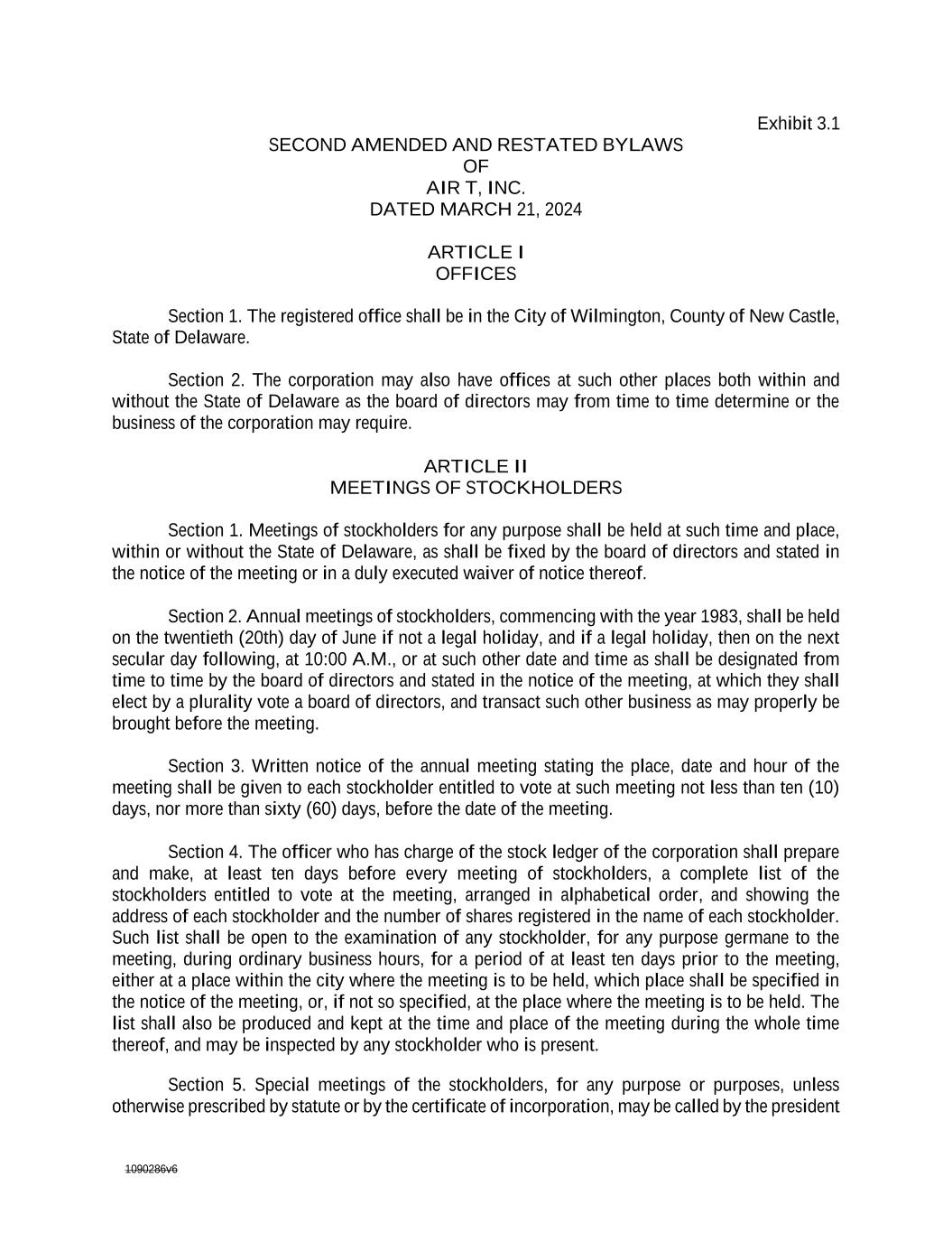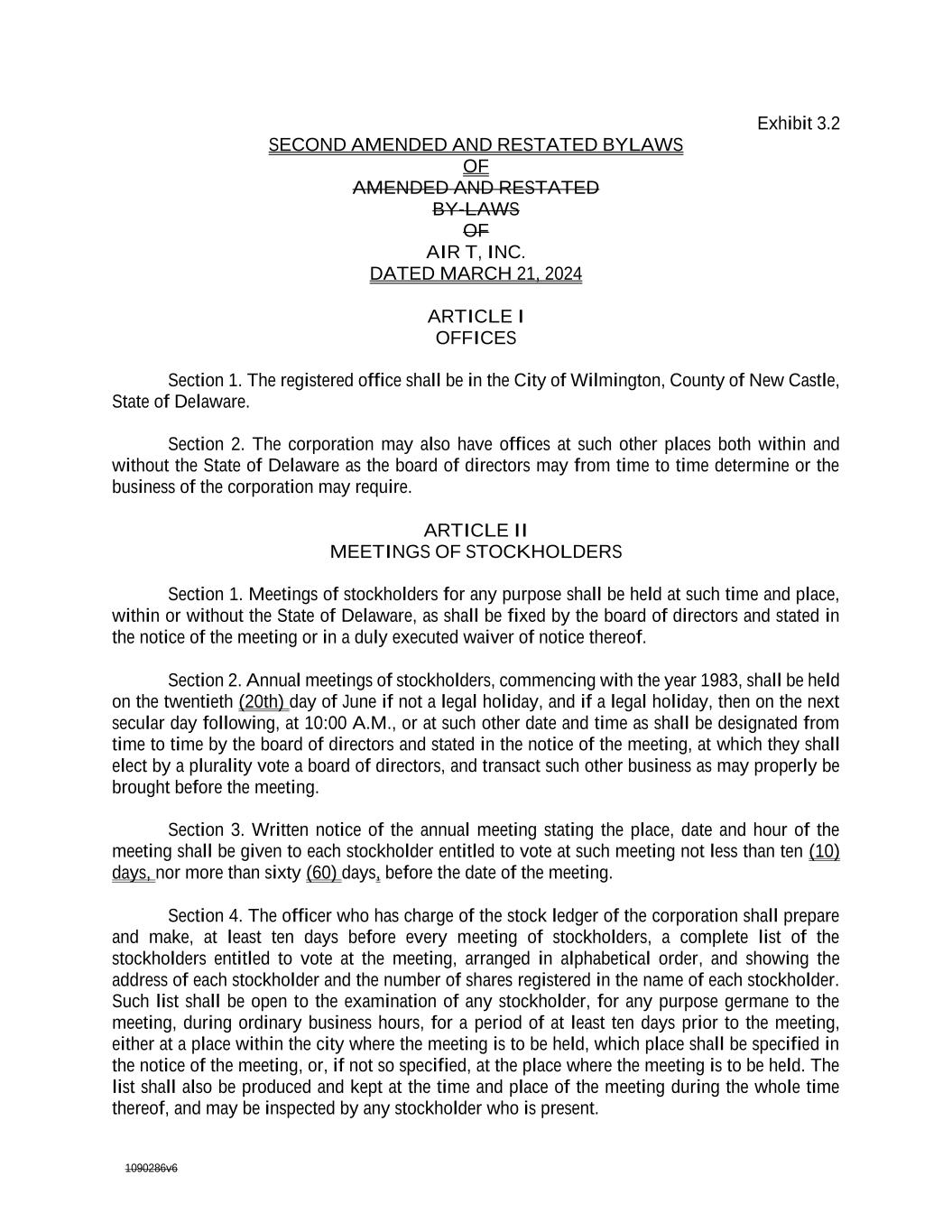 1090286v6 Exhibit 3.2 SECOND AMENDED AND RESTATED BYLAWS OF AMENDED AND RESTATED BY-LAWS OF AIR T, INC. DATED MARCH 21, 2024 ARTICLE I OFFICES Section 1. The registered office shall be in the City of Wilmington, County of New Castle, State of Delaware. Section 2. The corporation may also have offices at such other places both within and without the State of Delaware as the board of directors may from time to time determine or the business of the corporation may require. ARTICLE II MEETINGS OF STOCKHOLDERS Section 1. Meetings of stockholders for any purpose shall be held at such time and place, within or without the State of Delaware, as shall be fixed by the board of directors and stated in the notice of the meeting or in a duly executed waiver of notice thereof. Section 2. Annual meetings of stockholders, commencing with the year 1983, shall be held on the twentieth (20th) day of June if not a legal holiday, and if a legal holiday, then on the next secular day following, at 10:00 A.M., or at such other date and time as shall be designated from time to time by the board of directors and stated in the notice of the meeting, at which they shall elect by a plurality vote a board of directors, and transact such other business as may properly be brought before the meeting. Section 3. Written notice of the annual meeting stating the place, date and hour of the meeting shall be given to each stockholder entitled to vote at such meeting not less than ten (10) days, nor more than sixty (60) days, before the date of the meeting. Section 4. The officer who has charge of the stock ledger of the corporation shall prepare and make, at least ten days before every meeting of stockholders, a complete list of the stockholders entitled to vote at the meeting, arranged in alphabetical order, and showing the address of each stockholder and the number of shares registered in the name of each stockholder. Such list shall be open to the examination of any stockholder, for any purpose germane to the meeting, during ordinary business hours, for a period of at least ten days prior to the meeting, either at a place within the city where the meeting is to be held, which place shall be specified in the notice of the meeting, or, if not so specified, at the place where the meeting is to be held. The list shall also be produced and kept at the time and place of the meeting during the whole time thereof, and may be inspected by any stockholder who is present.