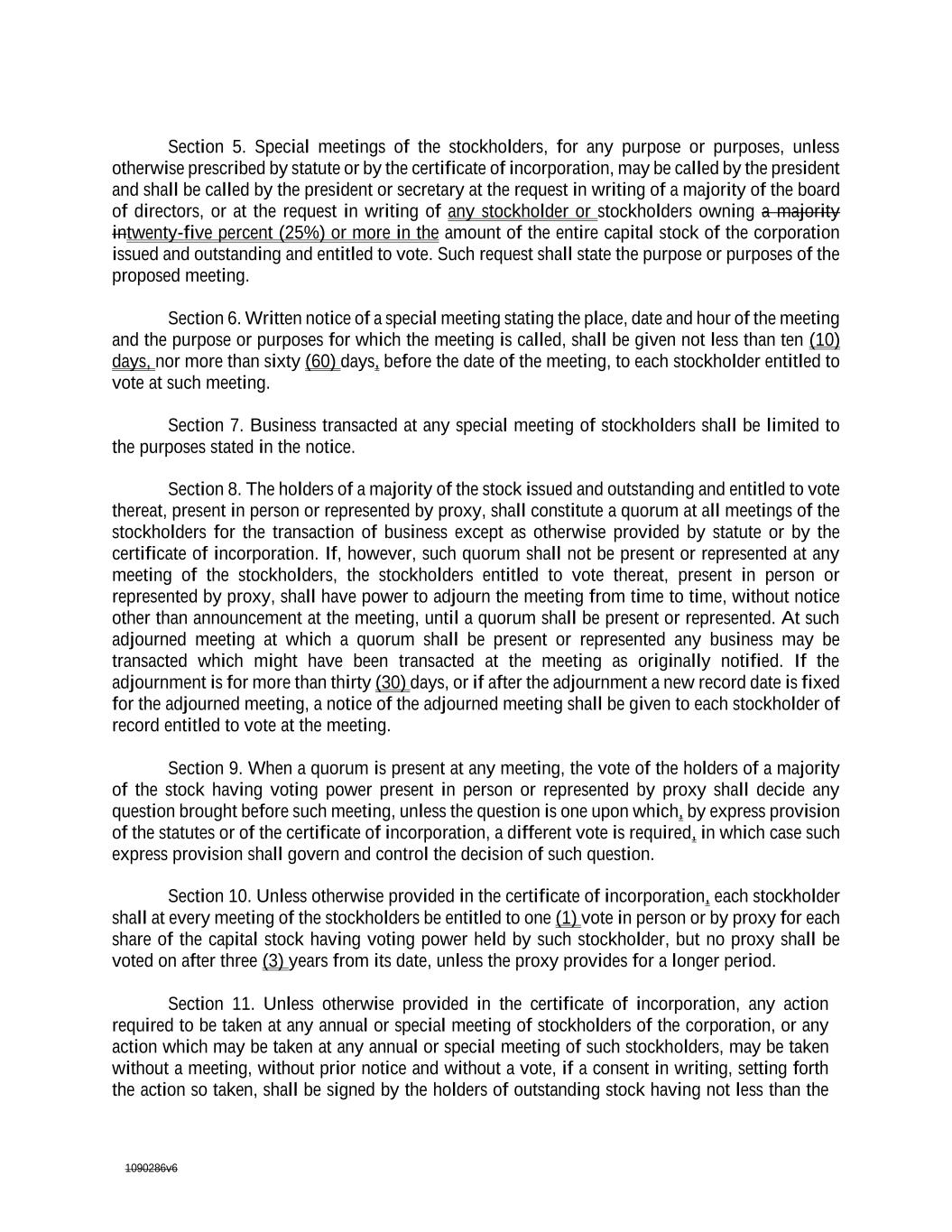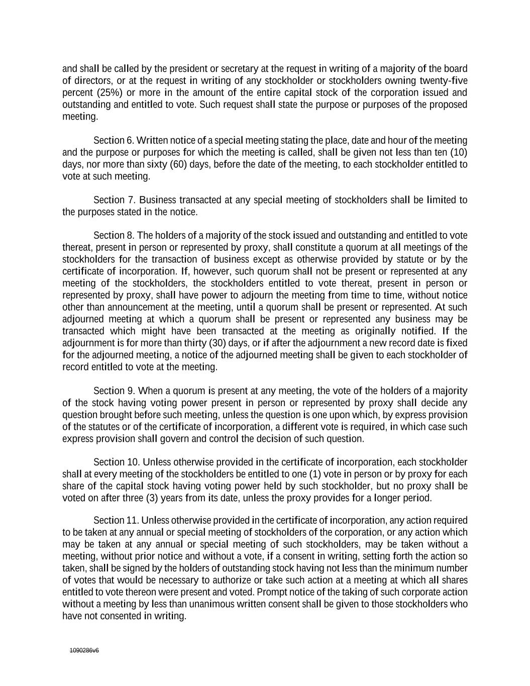 1090286v6 Section 5. Special meetings of the stockholders, for any purpose or purposes, unless otherwise prescribed by statute or by the certificate of incorporation, may be called by the president and shall be called by the president or secretary at the request in writing of a majority of the board of directors, or at the request in writing of any stockholder or stockholders owning a majority intwenty-five percent (25%) or more in the amount of the entire capital stock of the corporation issued and outstanding and entitled to vote. Such request shall state the purpose or purposes of the proposed meeting. Section 6. Written notice of a special meeting stating the place, date and hour of the meeting and the purpose or purposes for which the meeting is called, shall be given not less than ten (10) days, nor more than sixty (60) days, before the date of the meeting, to each stockholder entitled to vote at such meeting. Section 7. Business transacted at any special meeting of stockholders shall be limited to the purposes stated in the notice. Section 8. The holders of a majority of the stock issued and outstanding and entitled to vote thereat, present in person or represented by proxy, shall constitute a quorum at all meetings of the stockholders for the transaction of business except as otherwise provided by statute or by the certificate of incorporation. If, however, such quorum shall not be present or represented at any meeting of the stockholders, the stockholders entitled to vote thereat, present in person or represented by proxy, shall have power to adjourn the meeting from time to time, without notice other than announcement at the meeting, until a quorum shall be present or represented. At such adjourned meeting at which a quorum shall be present or represented any business may be transacted which might have been transacted at the meeting as originally notified. If the adjournment is for more than thirty (30) days, or if after the adjournment a new record date is fixed for the adjourned meeting, a notice of the adjourned meeting shall be given to each stockholder of record entitled to vote at the meeting. Section 9. When a quorum is present at any meeting, the vote of the holders of a majority of the stock having voting power present in person or represented by proxy shall decide any question brought before such meeting, unless the question is one upon which, by express provision of the statutes or of the certificate of incorporation, a different vote is required, in which case such express provision shall govern and control the decision of such question. Section 10. Unless otherwise provided in the certificate of incorporation, each stockholder shall at every meeting of the stockholders be entitled to one (1) vote in person or by proxy for each share of the capital stock having voting power held by such stockholder, but no proxy shall be voted on after three (3) years from its date, unless the proxy provides for a longer period. Section 11. Unless otherwise provided in the certificate of incorporation, any action required to be taken at any annual or special meeting of stockholders of the corporation, or any action which may be taken at any annual or special meeting of such stockholders, may be taken without a meeting, without prior notice and without a vote, if a consent in writing, setting forth the action so taken, shall be signed by the holders of outstanding stock having not less than the