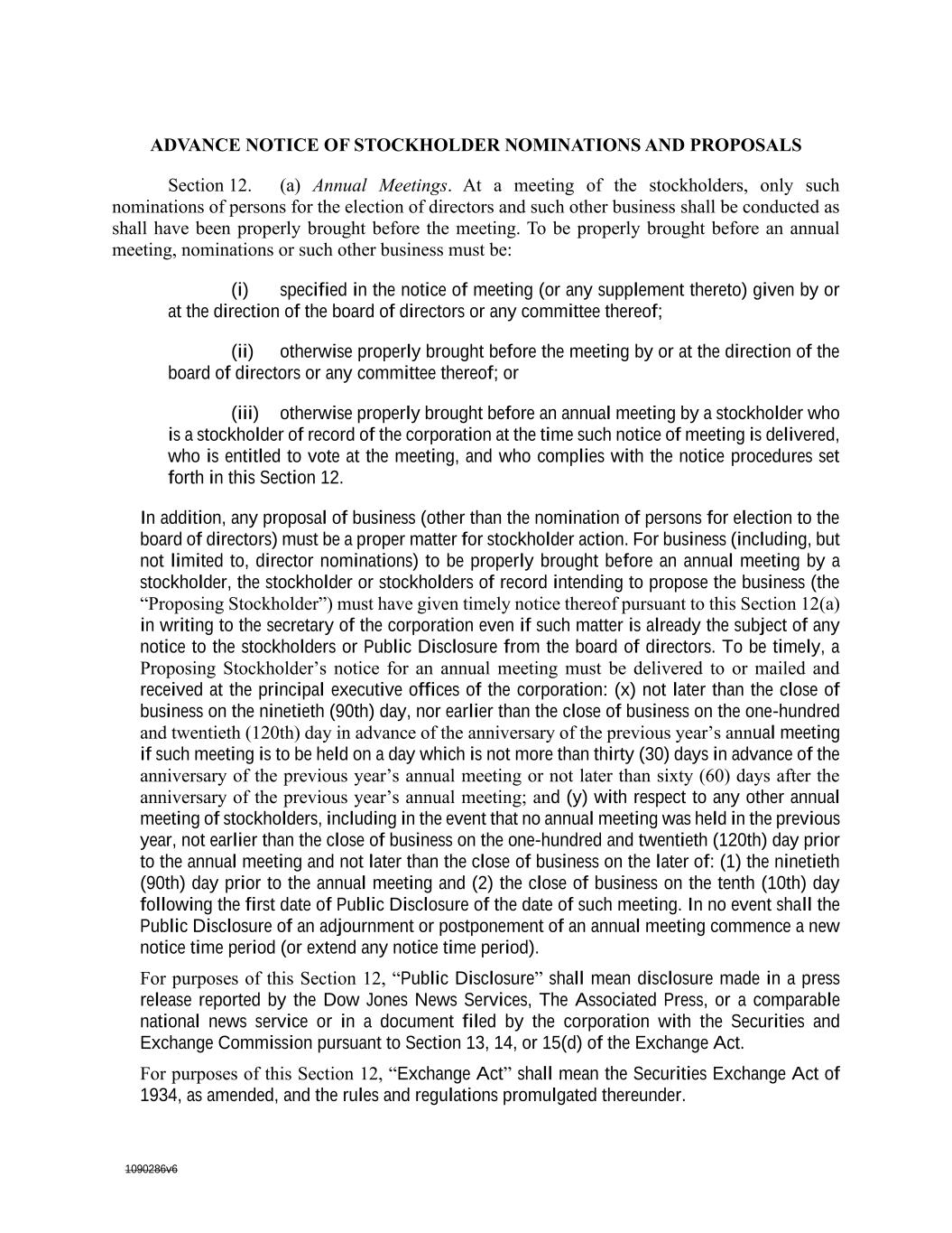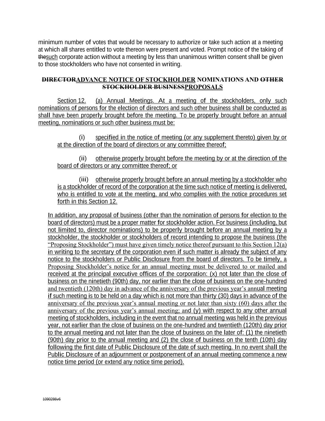 1090286v6 minimum number of votes that would be necessary to authorize or take such action at a meeting at which all shares entitled to vote thereon were present and voted. Prompt notice of the taking of thesuch corporate action without a meeting by less than unanimous written consent shall be given to those stockholders who have not consented in writing. DIRECTORADVANCE NOTICE OF STOCKHOLDER NOMINATIONS AND OTHER STOCKHOLDER BUSINESSPROPOSALS Section 12. (a) Annual Meetings. At a meeting of the stockholders, only such nominations of persons for the election of directors and such other business shall be conducted as shall have been properly brought before the meeting. To be properly brought before an annual meeting, nominations or such other business must be: (i) specified in the notice of meeting (or any supplement thereto) given by or at the direction of the board of directors or any committee thereof; (ii) otherwise properly brought before the meeting by or at the direction of the board of directors or any committee thereof; or (iii) otherwise properly brought before an annual meeting by a stockholder who is a stockholder of record of the corporation at the time such notice of meeting is delivered, who is entitled to vote at the meeting, and who complies with the notice procedures set forth in this Section 12. In addition, any proposal of business (other than the nomination of persons for election to the board of directors) must be a proper matter for stockholder action. For business (including, but not limited to, director nominations) to be properly brought before an annual meeting by a stockholder, the stockholder or stockholders of record intending to propose the business (the “Proposing Stockholder”) must have given timely notice thereof pursuant to this Section 12(a) in writing to the secretary of the corporation even if such matter is already the subject of any notice to the stockholders or Public Disclosure from the board of directors. To be timely, a Proposing Stockholder’s notice for an annual meeting must be delivered to or mailed and received at the principal executive offices of the corporation: (x) not later than the close of business on the ninetieth (90th) day, nor earlier than the close of business on the one-hundred and twentieth (120th) day in advance of the anniversary of the previous year’s annual meeting if such meeting is to be held on a day which is not more than thirty (30) days in advance of the anniversary of the previous year’s annual meeting or not later than sixty (60) days after the anniversary of the previous year’s annual meeting; and (y) with respect to any other annual meeting of stockholders, including in the event that no annual meeting was held in the previous year, not earlier than the close of business on the one-hundred and twentieth (120th) day prior to the annual meeting and not later than the close of business on the later of: (1) the ninetieth (90th) day prior to the annual meeting and (2) the close of business on the tenth (10th) day following the first date of Public Disclosure of the date of such meeting. In no event shall the Public Disclosure of an adjournment or postponement of an annual meeting commence a new notice time period (or extend any notice time period).