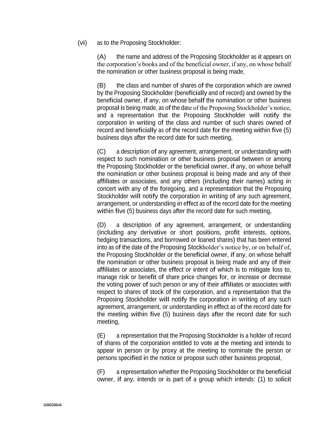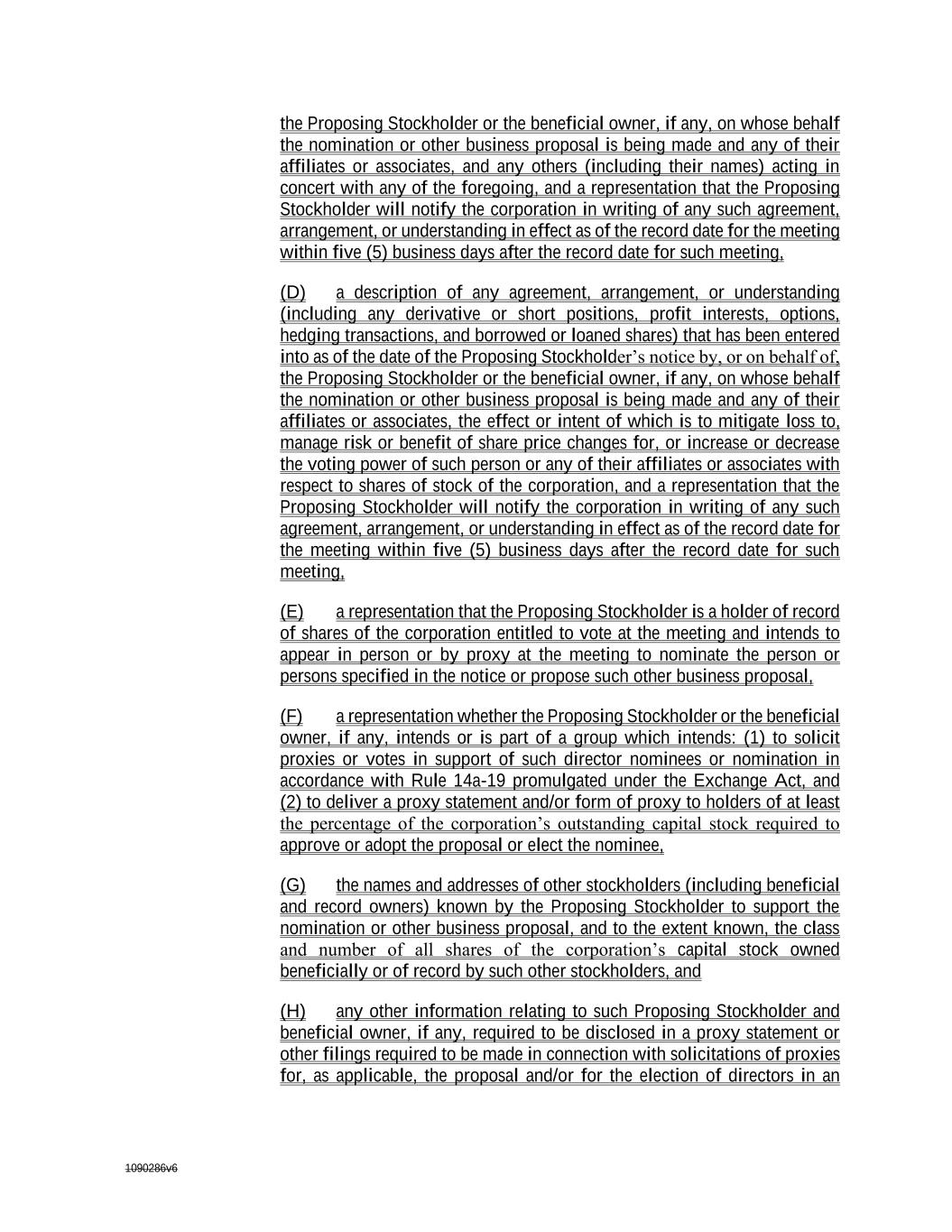 1090286v6 the Proposing Stockholder or the beneficial owner, if any, on whose behalf the nomination or other business proposal is being made and any of their affiliates or associates, and any others (including their names) acting in concert with any of the foregoing, and a representation that the Proposing Stockholder will notify the corporation in writing of any such agreement, arrangement, or understanding in effect as of the record date for the meeting within five (5) business days after the record date for such meeting, (D) a description of any agreement, arrangement, or understanding (including any derivative or short positions, profit interests, options, hedging transactions, and borrowed or loaned shares) that has been entered into as of the date of the Proposing Stockholder’s notice by, or on behalf of, the Proposing Stockholder or the beneficial owner, if any, on whose behalf the nomination or other business proposal is being made and any of their affiliates or associates, the effect or intent of which is to mitigate loss to, manage risk or benefit of share price changes for, or increase or decrease the voting power of such person or any of their affiliates or associates with respect to shares of stock of the corporation, and a representation that the Proposing Stockholder will notify the corporation in writing of any such agreement, arrangement, or understanding in effect as of the record date for the meeting within five (5) business days after the record date for such meeting, (E) a representation that the Proposing Stockholder is a holder of record of shares of the corporation entitled to vote at the meeting and intends to appear in person or by proxy at the meeting to nominate the person or persons specified in the notice or propose such other business proposal, (F) a representation whether the Proposing Stockholder or the beneficial owner, if any, intends or is part of a group which intends: (1) to solicit proxies or votes in support of such director nominees or nomination in accordance with Rule 14a-19 promulgated under the Exchange Act, and (2) to deliver a proxy statement and/or form of proxy to holders of at least the percentage of the corporation’s outstanding capital stock required to approve or adopt the proposal or elect the nominee, (G) the names and addresses of other stockholders (including beneficial and record owners) known by the Proposing Stockholder to support the nomination or other business proposal, and to the extent known, the class and number of all shares of the corporation’s capital stock owned beneficially or of record by such other stockholders, and (H) any other information relating to such Proposing Stockholder and beneficial owner, if any, required to be disclosed in a proxy statement or other filings required to be made in connection with solicitations of proxies for, as applicable, the proposal and/or for the election of directors in an