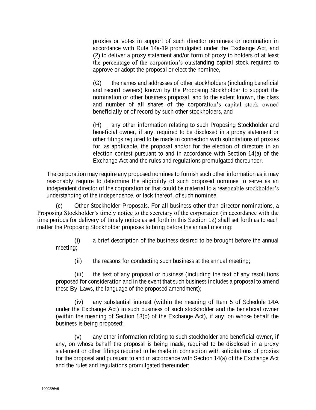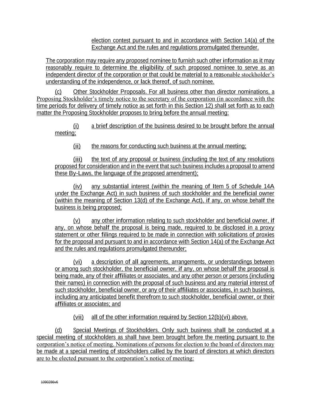 1090286v6 election contest pursuant to and in accordance with Section 14(a) of the Exchange Act and the rules and regulations promulgated thereunder. The corporation may require any proposed nominee to furnish such other information as it may reasonably require to determine the eligibility of such proposed nominee to serve as an independent director of the corporation or that could be material to a reasonable stockholder’s understanding of the independence, or lack thereof, of such nominee. (c) Other Stockholder Proposals. For all business other than director nominations, a Proposing Stockholder’s timely notice to the secretary of the corporation (in accordance with the time periods for delivery of timely notice as set forth in this Section 12) shall set forth as to each matter the Proposing Stockholder proposes to bring before the annual meeting: (i) a brief description of the business desired to be brought before the annual meeting; (ii) the reasons for conducting such business at the annual meeting; (iii) the text of any proposal or business (including the text of any resolutions proposed for consideration and in the event that such business includes a proposal to amend these By-Laws, the language of the proposed amendment); (iv) any substantial interest (within the meaning of Item 5 of Schedule 14A under the Exchange Act) in such business of such stockholder and the beneficial owner (within the meaning of Section 13(d) of the Exchange Act), if any, on whose behalf the business is being proposed; (v) any other information relating to such stockholder and beneficial owner, if any, on whose behalf the proposal is being made, required to be disclosed in a proxy statement or other filings required to be made in connection with solicitations of proxies for the proposal and pursuant to and in accordance with Section 14(a) of the Exchange Act and the rules and regulations promulgated thereunder; (vi) a description of all agreements, arrangements, or understandings between or among such stockholder, the beneficial owner, if any, on whose behalf the proposal is being made, any of their affiliates or associates, and any other person or persons (including their names) in connection with the proposal of such business and any material interest of such stockholder, beneficial owner, or any of their affiliates or associates, in such business, including any anticipated benefit therefrom to such stockholder, beneficial owner, or their affiliates or associates; and (vii) all of the other information required by Section 12(b)(vi) above. (d) Special Meetings of Stockholders. Only such business shall be conducted at a special meeting of stockholders as shall have been brought before the meeting pursuant to the corporation’s notice of meeting. Nominations of persons for election to the board of directors may be made at a special meeting of stockholders called by the board of directors at which directors are to be elected pursuant to the corporation’s notice of meeting: