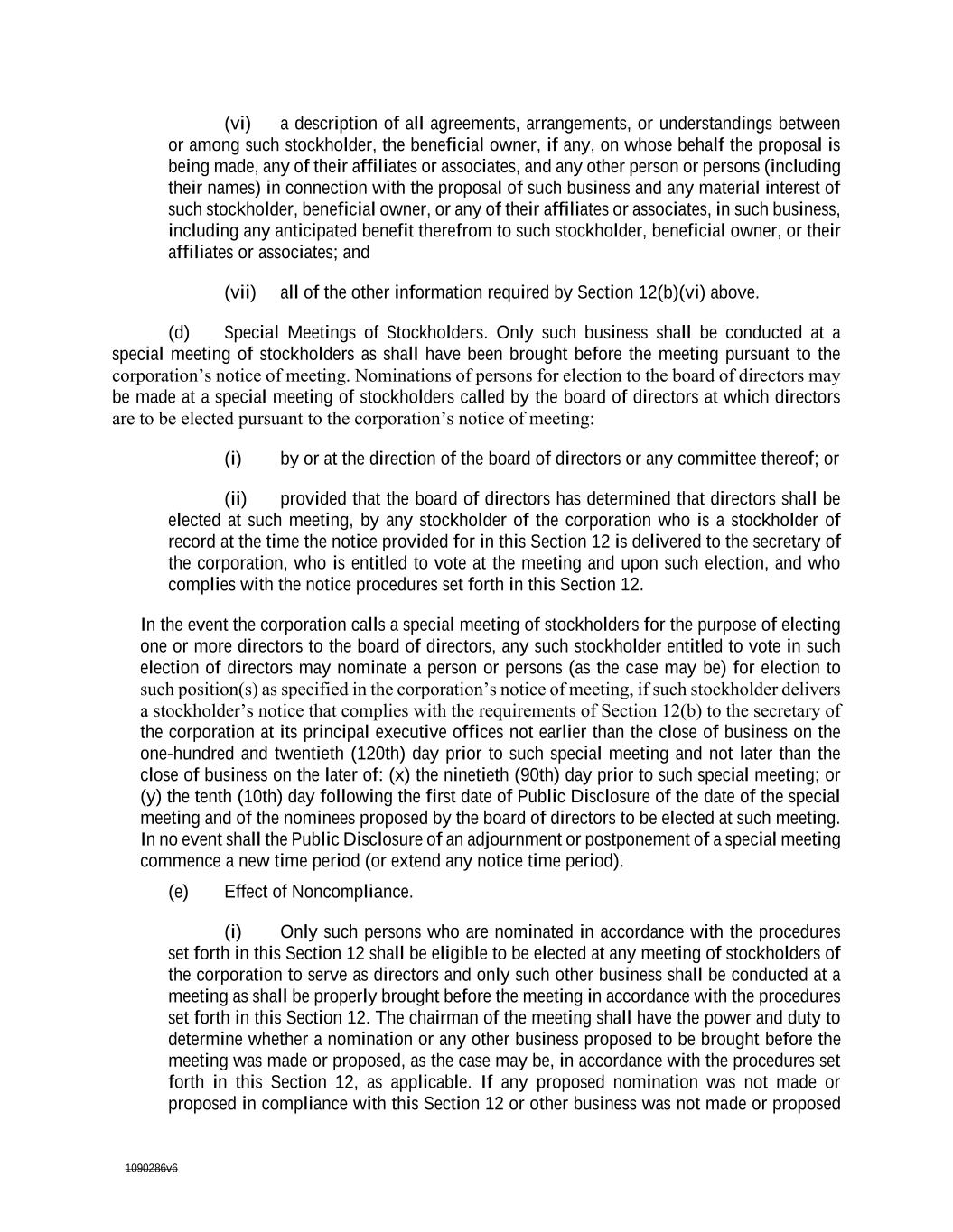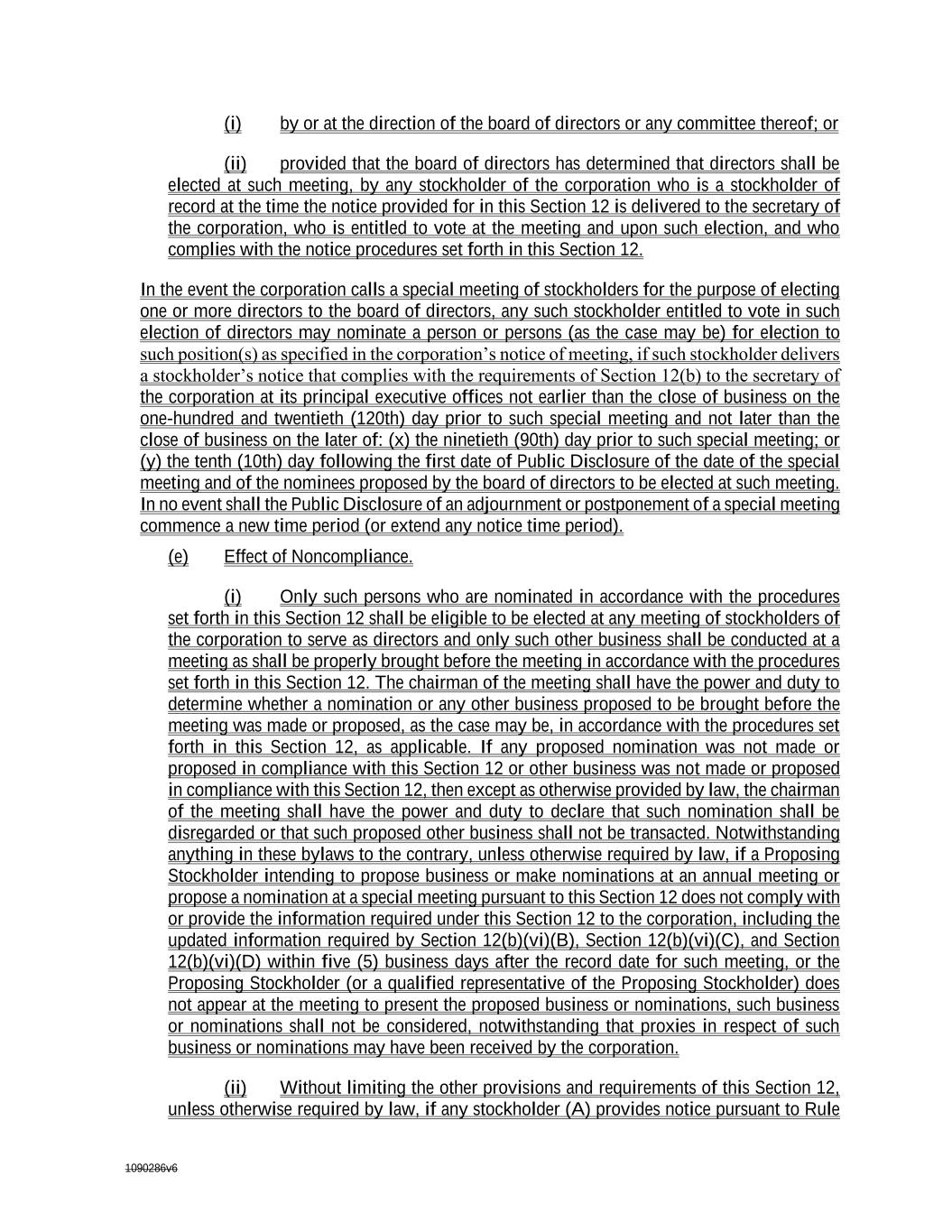 1090286v6 (i) by or at the direction of the board of directors or any committee thereof; or (ii) provided that the board of directors has determined that directors shall be elected at such meeting, by any stockholder of the corporation who is a stockholder of record at the time the notice provided for in this Section 12 is delivered to the secretary of the corporation, who is entitled to vote at the meeting and upon such election, and who complies with the notice procedures set forth in this Section 12. In the event the corporation calls a special meeting of stockholders for the purpose of electing one or more directors to the board of directors, any such stockholder entitled to vote in such election of directors may nominate a person or persons (as the case may be) for election to such position(s) as specified in the corporation’s notice of meeting, if such stockholder delivers a stockholder’s notice that complies with the requirements of Section 12(b) to the secretary of the corporation at its principal executive offices not earlier than the close of business on the one-hundred and twentieth (120th) day prior to such special meeting and not later than the close of business on the later of: (x) the ninetieth (90th) day prior to such special meeting; or (y) the tenth (10th) day following the first date of Public Disclosure of the date of the special meeting and of the nominees proposed by the board of directors to be elected at such meeting. In no event shall the Public Disclosure of an adjournment or postponement of a special meeting commence a new time period (or extend any notice time period). (e) Effect of Noncompliance. (i) Only such persons who are nominated in accordance with the procedures set forth in this Section 12 shall be eligible to be elected at any meeting of stockholders of the corporation to serve as directors and only such other business shall be conducted at a meeting as shall be properly brought before the meeting in accordance with the procedures set forth in this Section 12. The chairman of the meeting shall have the power and duty to determine whether a nomination or any other business proposed to be brought before the meeting was made or proposed, as the case may be, in accordance with the procedures set forth in this Section 12, as applicable. If any proposed nomination was not made or proposed in compliance with this Section 12 or other business was not made or proposed in compliance with this Section 12, then except as otherwise provided by law, the chairman of the meeting shall have the power and duty to declare that such nomination shall be disregarded or that such proposed other business shall not be transacted. Notwithstanding anything in these bylaws to the contrary, unless otherwise required by law, if a Proposing Stockholder intending to propose business or make nominations at an annual meeting or propose a nomination at a special meeting pursuant to this Section 12 does not comply with or provide the information required under this Section 12 to the corporation, including the updated information required by Section 12(b)(vi)(B), Section 12(b)(vi)(C), and Section 12(b)(vi)(D) within five (5) business days after the record date for such meeting, or the Proposing Stockholder (or a qualified representative of the Proposing Stockholder) does not appear at the meeting to present the proposed business or nominations, such business or nominations shall not be considered, notwithstanding that proxies in respect of such business or nominations may have been received by the corporation. (ii) Without limiting the other provisions and requirements of this Section 12, unless otherwise required by law, if any stockholder (A) provides notice pursuant to Rule