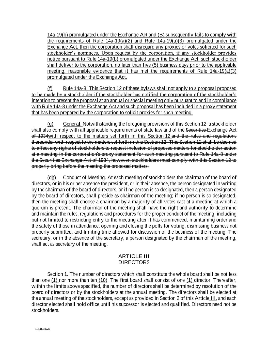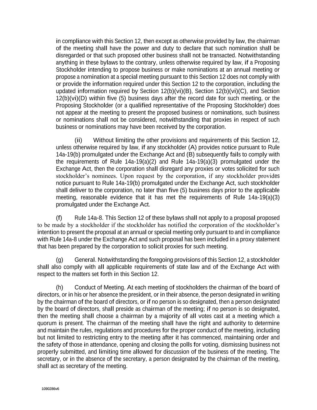 1090286v6 14a-19(b) promulgated under the Exchange Act and (B) subsequently fails to comply with the requirements of Rule 14a-19(a)(2) and Rule 14a-19(a)(3) promulgated under the Exchange Act, then the corporation shall disregard any proxies or votes solicited for such stockholder’s nominees. Upon request by the corporation, if any stockholder provides notice pursuant to Rule 14a-19(b) promulgated under the Exchange Act, such stockholder shall deliver to the corporation, no later than five (5) business days prior to the applicable meeting, reasonable evidence that it has met the requirements of Rule 14a-19(a)(3) promulgated under the Exchange Act. (f) Rule 14a-8. This Section 12 of these bylaws shall not apply to a proposal proposed to be made by a stockholder if the stockholder has notified the corporation of the stockholder’s intention to present the proposal at an annual or special meeting only pursuant to and in compliance with Rule 14a-8 under the Exchange Act and such proposal has been included in a proxy statement that has been prepared by the corporation to solicit proxies for such meeting. (g) General. Notwithstanding the foregoing provisions of this Section 12, a stockholder shall also comply with all applicable requirements of state law and of the Securities Exchange Act of 1934with respect to the matters set forth in this Section 12.and the rules and regulations thereunder with respect to the matters set forth in this Section 12. This Section 12 shall be deemed to affect any rights of stockholders to request inclusion of proposed matters for stockholder action at a meeting in the corporation's proxy statement for such meeting pursuant to Rule 14a-8 under the Securities Exchange Act of 1934, however, stockholders must comply with this Section 12 to properly bring before the meeting the proposed matters. (dh) Conduct of Meeting. At each meeting of stockholders the chairman of the board of directors, or in his or her absence the president, or in their absence, the person designated in writing by the chairman of the board of directors, or if no person is so designated, then a person designated by the board of directors, shall preside as chairman of the meeting; if no person is so designated, then the meeting shall choose a chairman by a majority of all votes cast at a meeting at which a quorum is present. The chairman of the meeting shall have the right and authority to determine and maintain the rules, regulations and procedures for the proper conduct of the meeting, including but not limited to restricting entry to the meeting after it has commenced, maintaining order and the safety of those in attendance, opening and closing the polls for voting, dismissing business not properly submitted, and limiting time allowed for discussion of the business of the meeting. The secretary, or in the absence of the secretary, a person designated by the chairman of the meeting, shall act as secretary of the meeting. ARTICLE III DIRECTORS Section 1. The number of directors which shall constitute the whole board shall be not less than one (1) nor more than ten (10). The first board shall consist of one (1) director. Thereafter, within the limits above specified, the number of directors shall be determined by resolution of the board of directors or by the stockholders at the annual meeting. The directors shall be elected at the annual meeting of the stockholders, except as provided in Section 2 of this Article III, and each director elected shall hold office until his successor is elected and qualified. Directors need not be stockholders.
