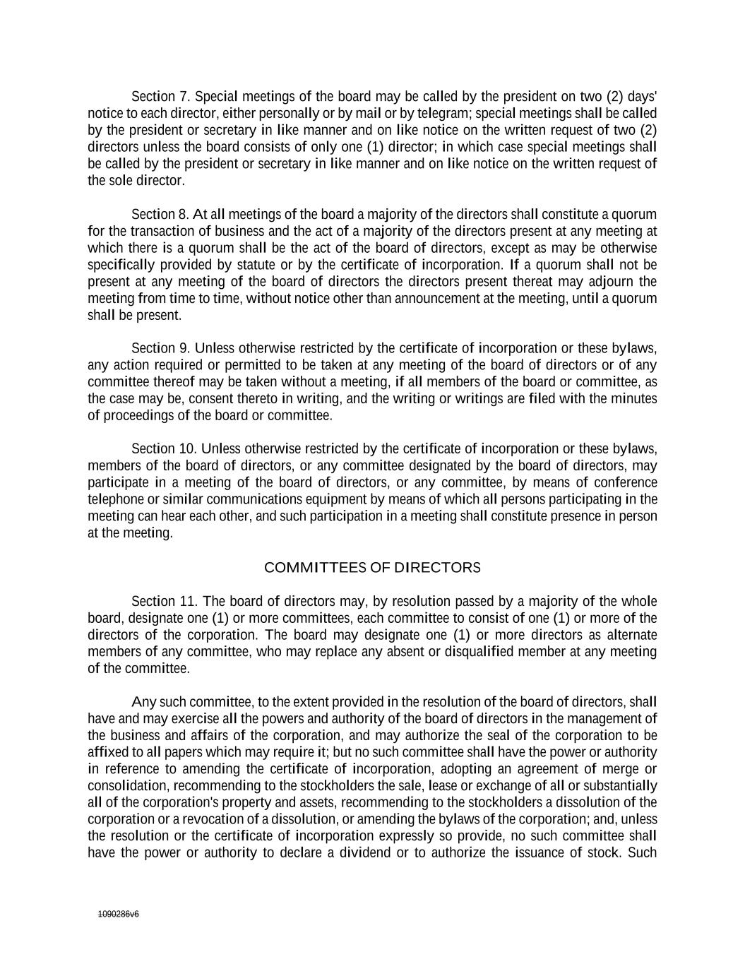 1090286v6 specifically provided by statute or by the certificate of incorporation. If a quorum shall not be present at any meeting of the board of directors the directors present thereat may adjourn the meeting from time to time, without notice other than announcement at the meeting, until a quorum shall be present. Section 9. Unless otherwise restricted by the certificate of incorporation or these bylaws, any action required or permitted to be taken at any meeting of the board of directors or of any committee thereof may be taken without a meeting, if all members of the board or committee, as the case may be, consent thereto in writing, and the writing or writings are filed with the minutes of proceedings of the board or committee. Section 10. Unless otherwise restricted by the certificate of incorporation or these bylaws, members of the board of directors, or any committee designated by the board of directors, may participate in a meeting of the board of directors, or any committee, by means of conference telephone or similar communications equipment by means of which all persons participating in the meeting can hear each other, and such participation in a meeting shall constitute presence in person at the meeting. COMMITTEES OF DIRECTORS Section 11. The board of directors may, by resolution passed by a majority of the whole board, designate one (1) or more committees, each committee to consist of one (1) or more of the directors of the corporation. The board may designate one (1) or more directors as alternate members of any committee, who may replace any absent or disqualified member at any meeting of the committee. Any such committee, to the extent provided in the resolution of the board of directors, shall have and may exercise all the powers and authority of the board of directors in the management of the business and affairs of the corporation, and may authorize the seal of the corporation to be affixed to all papers which may require it; but no such committee shall have the power or authority in reference to amending the certificate of incorporation, adopting an agreement of merge or consolidation, recommending to the stockholders the sale, lease or exchange of all or substantially all of the corporation's property and assets, recommending to the stockholders a dissolution of the corporation or a revocation of a dissolution, or amending the by-lawsbylaws of the corporation; and, unless the resolution or the certificate of incorporation expressly so provide, no such committee shall have the power or authority to declare a dividend or to authorize the issuance of stock. Such committee or committees shall have such name or names as may be determined from time to time by resolution adopted by the board of directors. Section 12. Each committee shall keep regular minutes of its meetings and report the same to the board of directors when required. COMPENSATION OF DIRECTORS Section 13. Unless otherwise restricted by the certificate of incorporation or these bylaws, the board of directors shall have the authority to fix the compensation of directors. The directors