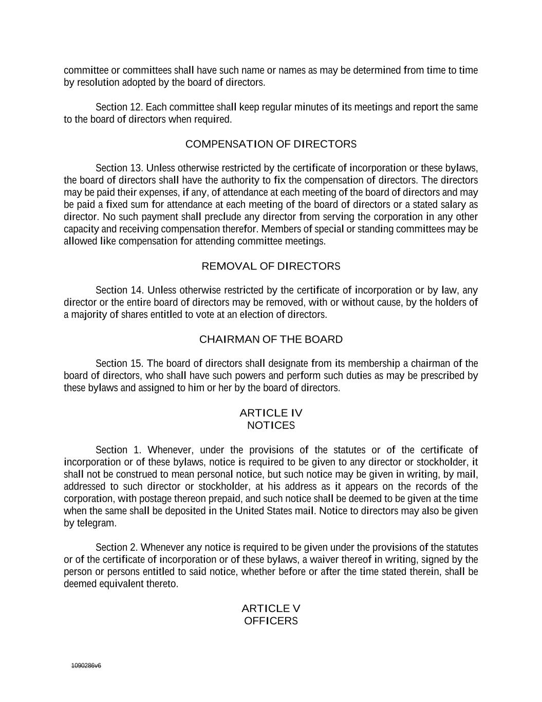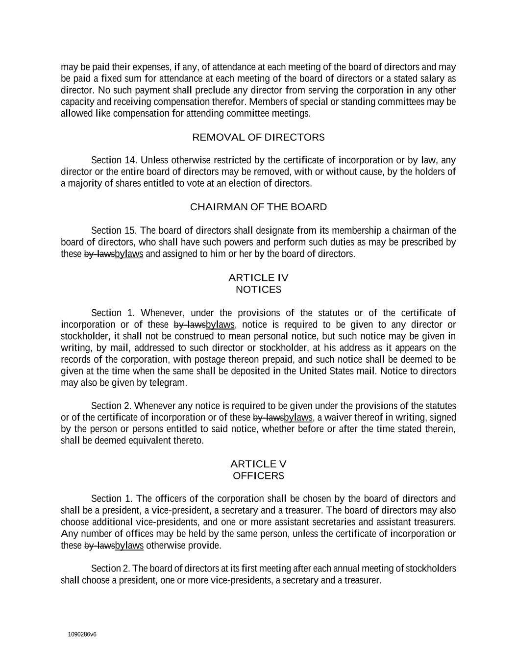 1090286v6 may be paid their expenses, if any, of attendance at each meeting of the board of directors and may be paid a fixed sum for attendance at each meeting of the board of directors or a stated salary as director. No such payment shall preclude any director from serving the corporation in any other capacity and receiving compensation therefor. Members of special or standing committees may be allowed like compensation for attending committee meetings. REMOVAL OF DIRECTORS Section 14. Unless otherwise restricted by the certificate of incorporation or by law, any director or the entire board of directors may be removed, with or without cause, by the holders of a majority of shares entitled to vote at an election of directors. CHAIRMAN OF THE BOARD Section 15. The board of directors shall designate from its membership a chairman of the board of directors, who shall have such powers and perform such duties as may be prescribed by these by-lawsbylaws and assigned to him or her by the board of directors. ARTICLE IV NOTICES Section 1. Whenever, under the provisions of the statutes or of the certificate of incorporation or of these by-lawsbylaws, notice is required to be given to any director or stockholder, it shall not be construed to mean personal notice, but such notice may be given in writing, by mail, addressed to such director or stockholder, at his address as it appears on the records of the corporation, with postage thereon prepaid, and such notice shall be deemed to be given at the time when the same shall be deposited in the United States mail. Notice to directors may also be given by telegram. Section 2. Whenever any notice is required to be given under the provisions of the statutes or of the certificate of incorporation or of these by-lawsbylaws, a waiver thereof in writing, signed by the person or persons entitled to said notice, whether before or after the time stated therein, shall be deemed equivalent thereto. ARTICLE V OFFICERS Section 1. The officers of the corporation shall be chosen by the board of directors and shall be a president, a vice-president, a secretary and a treasurer. The board of directors may also choose additional vice-presidents, and one or more assistant secretaries and assistant treasurers. Any number of offices may be held by the same person, unless the certificate of incorporation or these by-lawsbylaws otherwise provide. Section 2. The board of directors at its first meeting after each annual meeting of stockholders shall choose a president, one or more vice-presidents, a secretary and a treasurer.