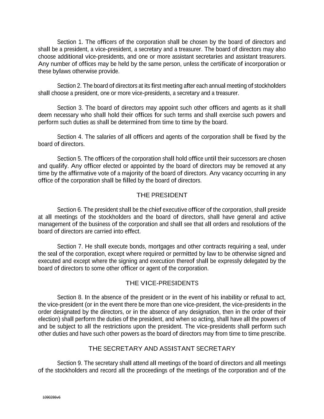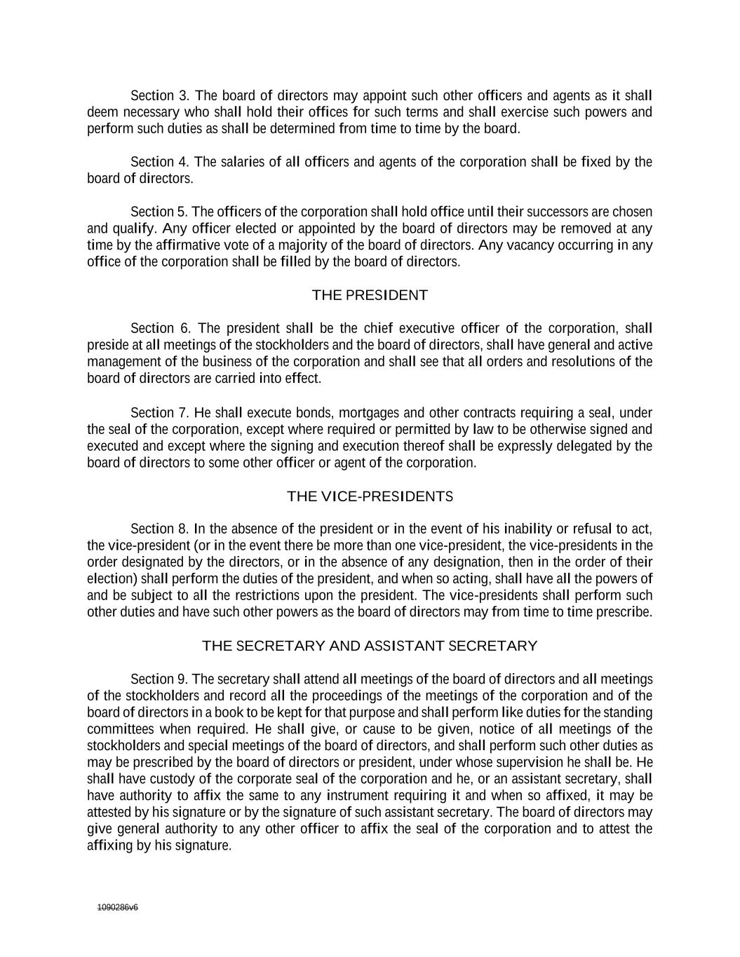 1090286v6 Section 3. The board of directors may appoint such other officers and agents as it shall deem necessary who shall hold their offices for such terms and shall exercise such powers and perform such duties as shall be determined from time to time by the board. Section 4. The salaries of all officers and agents of the corporation shall be fixed by the board of directors. Section 5. The officers of the corporation shall hold office until their successors are chosen and qualify. Any officer elected or appointed by the board of directors may be removed at any time by the affirmative vote of a majority of the board of directors. Any vacancy occurring in any office of the corporation shall be filled by the board of directors. THE PRESIDENT Section 6. The president shall be the chief executive officer of the corporation, shall preside at all meetings of the stockholders and the board of directors, shall have general and active management of the business of the corporation and shall see that all orders and resolutions of the board of directors are carried into effect. Section 7. He shall execute bonds, mortgages and other contracts requiring a seal, under the seal of the corporation, except where required or permitted by law to be otherwise signed and executed and except where the signing and execution thereof shall be expressly delegated by the board of directors to some other officer or agent of the corporation. THE VICE-PRESIDENTS Section 8. In the absence of the president or in the event of his inability or refusal to act, the vice-president (or in the event there be more than one vice-president, the vice-presidents in the order designated by the directors, or in the absence of any designation, then in the order of their election) shall perform the duties of the president, and when so acting, shall have all the powers of and be subject to all the restrictions upon the president. The vice-presidents shall perform such other duties and have such other powers as the board of directors may from time to time prescribe. THE SECRETARY AND ASSISTANT SECRETARY Section 9. The secretary shall attend all meetings of the board of directors and all meetings of the stockholders and record all the proceedings of the meetings of the corporation and of the board of directors in a book to be kept for that purpose and shall perform like duties for the standing committees when required. He shall give, or cause to be given, notice of all meetings of the stockholders and special meetings of the board of directors, and shall perform such other duties as may be prescribed by the board of directors or president, under whose supervision he shall be. He shall have custody of the corporate seal of the corporation and he, or an assistant secretary, shall have authority to affix the same to any instrument requiring it and when so affixed, it may be attested by his signature or by the signature of such assistant secretary. The board of directors may give general authority to any other officer to affix the seal of the corporation and to attest the affixing by his signature.