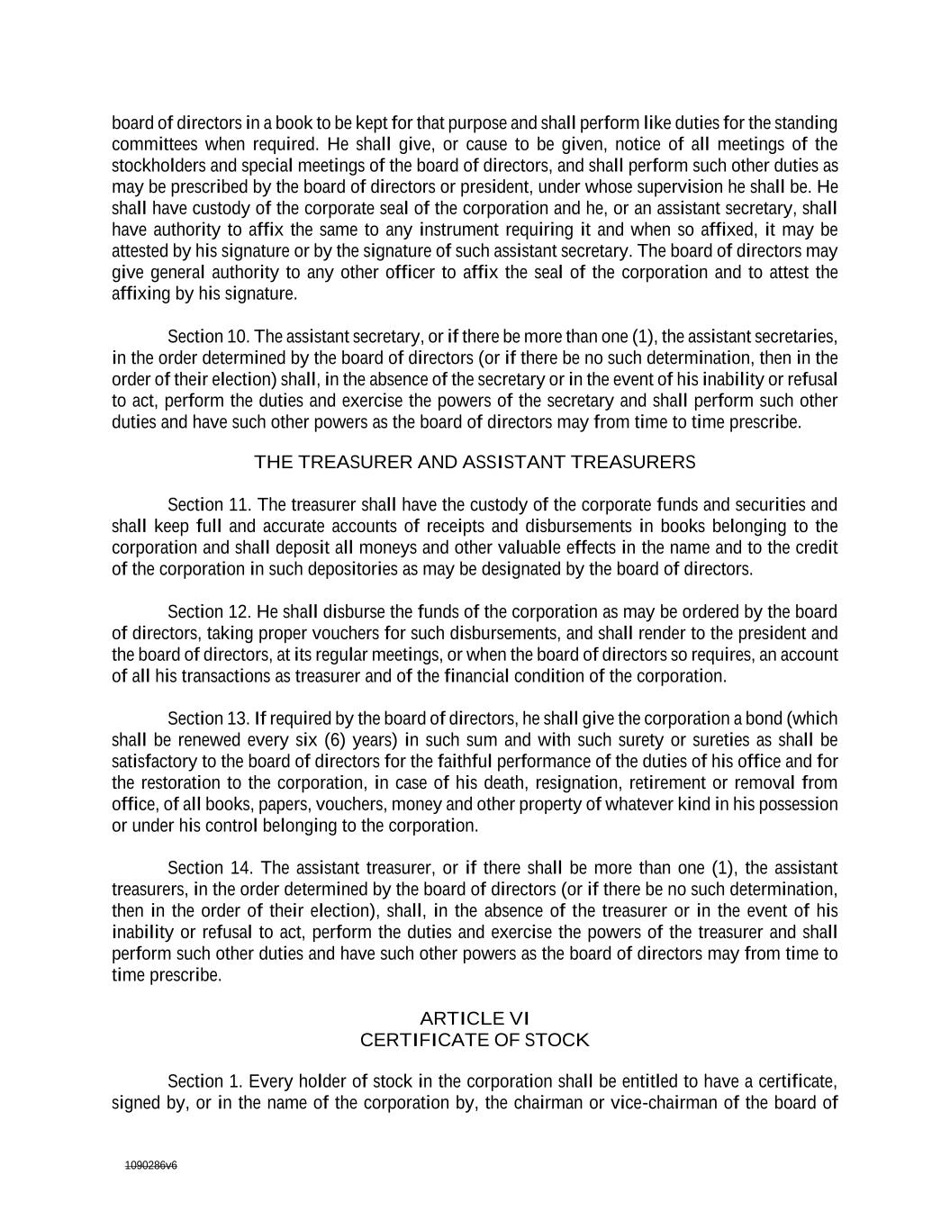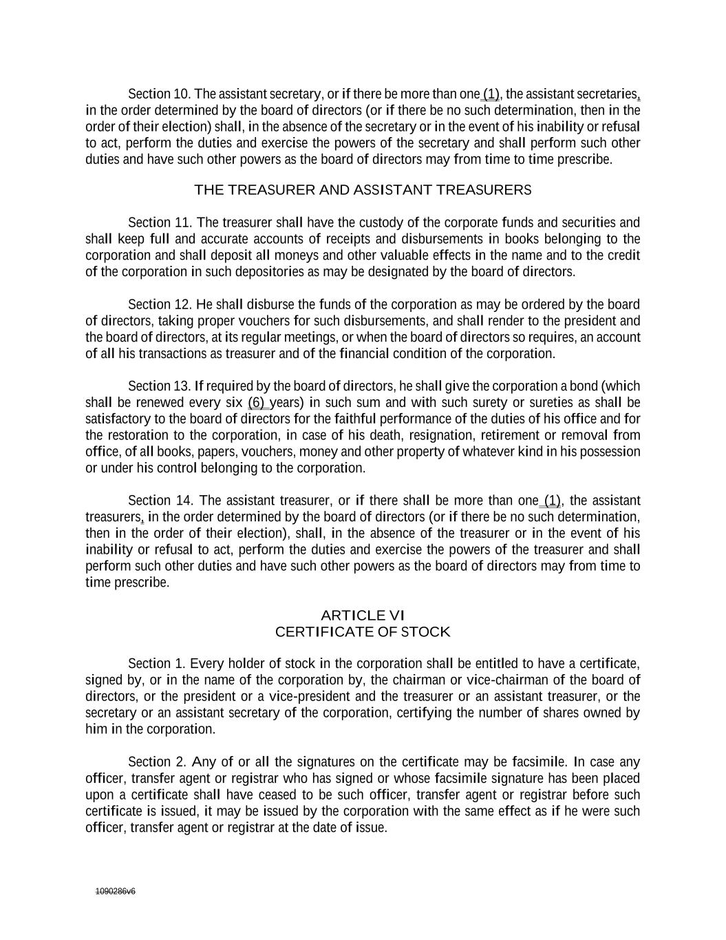 1090286v6 Section 10. The assistant secretary, or if there be more than one (1), the assistant secretaries, in the order determined by the board of directors (or if there be no such determination, then in the order of their election) shall, in the absence of the secretary or in the event of his inability or refusal to act, perform the duties and exercise the powers of the secretary and shall perform such other duties and have such other powers as the board of directors may from time to time prescribe. THE TREASURER AND ASSISTANT TREASURERS Section 11. The treasurer shall have the custody of the corporate funds and securities and shall keep full and accurate accounts of receipts and disbursements in books belonging to the corporation and shall deposit all moneys and other valuable effects in the name and to the credit of the corporation in such depositories as may be designated by the board of directors. Section 12. He shall disburse the funds of the corporation as may be ordered by the board of directors, taking proper vouchers for such disbursements, and shall render to the president and the board of directors, at its regular meetings, or when the board of directors so requires, an account of all his transactions as treasurer and of the financial condition of the corporation. Section 13. If required by the board of directors, he shall give the corporation a bond (which shall be renewed every six (6) years) in such sum and with such surety or sureties as shall be satisfactory to the board of directors for the faithful performance of the duties of his office and for the restoration to the corporation, in case of his death, resignation, retirement or removal from office, of all books, papers, vouchers, money and other property of whatever kind in his possession or under his control belonging to the corporation. Section 14. The assistant treasurer, or if there shall be more than one (1), the assistant treasurers, in the order determined by the board of directors (or if there be no such determination, then in the order of their election), shall, in the absence of the treasurer or in the event of his inability or refusal to act, perform the duties and exercise the powers of the treasurer and shall perform such other duties and have such other powers as the board of directors may from time to time prescribe. ARTICLE VI CERTIFICATE OF STOCK Section 1. Every holder of stock in the corporation shall be entitled to have a certificate, signed by, or in the name of the corporation by, the chairman or vice-chairman of the board of directors, or the president or a vice-president and the treasurer or an assistant treasurer, or the secretary or an assistant secretary of the corporation, certifying the number of shares owned by him in the corporation. Section 2. Any of or all the signatures on the certificate may be facsimile. In case any officer, transfer agent or registrar who has signed or whose facsimile signature has been placed upon a certificate shall have ceased to be such officer, transfer agent or registrar before such certificate is issued, it may be issued by the corporation with the same effect as if he were such officer, transfer agent or registrar at the date of issue.