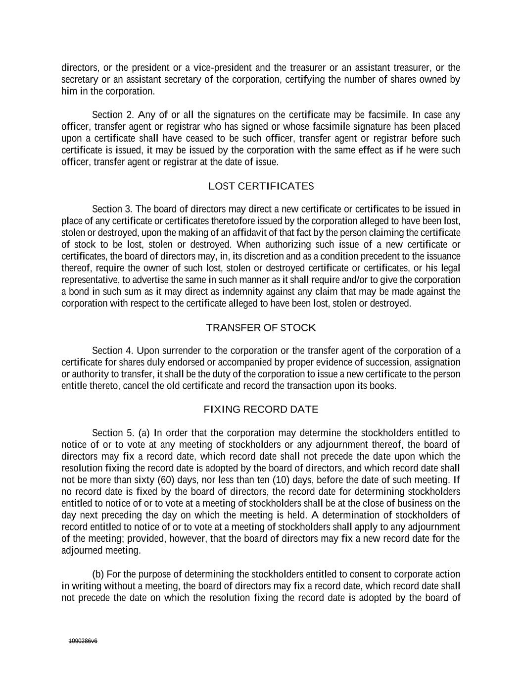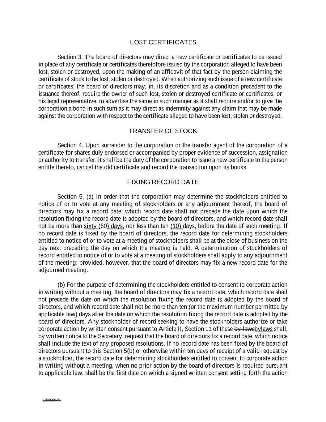 1090286v6 LOST CERTIFICATES Section 3. The board of directors may direct a new certificate or certificates to be issued in place of any certificate or certificates theretofore issued by the corporation alleged to have been lost, stolen or destroyed, upon the making of an affidavit of that fact by the person claiming the certificate of stock to be lost, stolen or destroyed. When authorizing such issue of a new certificate or certificates, the board of directors may, in, its discretion and as a condition precedent to the issuance thereof, require the owner of such lost, stolen or destroyed certificate or certificates, or his legal representative, to advertise the same in such manner as it shall require and/or to give the corporation a bond in such sum as it may direct as indemnity against any claim that may be made against the corporation with respect to the certificate alleged to have been lost, stolen or destroyed. TRANSFER OF STOCK Section 4. Upon surrender to the corporation or the transfer agent of the corporation of a certificate for shares duly endorsed or accompanied by proper evidence of succession, assignation or authority to transfer, it shall be the duty of the corporation to issue a new certificate to the person entitle thereto, cancel the old certificate and record the transaction upon its books. FIXING RECORD DATE Section 5. (a) In order that the corporation may determine the stockholders entitled to notice of or to vote at any meeting of stockholders or any adjournment thereof, the board of directors may fix a record date, which record date shall not precede the date upon which the resolution fixing the record date is adopted by the board of directors, and which record date shall not be more than sixty (60) days, nor less than ten (10) days, before the date of such meeting. If no record date is fixed by the board of directors, the record date for determining stockholders entitled to notice of or to vote at a meeting of stockholders shall be at the close of business on the day next preceding the day on which the meeting is held. A determination of stockholders of record entitled to notice of or to vote at a meeting of stockholders shall apply to any adjournment of the meeting; provided, however, that the board of directors may fix a new record date for the adjourned meeting. (b) For the purpose of determining the stockholders entitled to consent to corporate action in writing without a meeting, the board of directors may fix a record date, which record date shall not precede the date on which the resolution fixing the record date is adopted by the board of directors, and which record date shall not be more than ten (or the maximum number permitted by applicable law) days after the date on which the resolution fixing the record date is adopted by the board of directors. Any stockholder of record seeking to have the stockholders authorize or take corporate action by written consent pursuant to Article II, Section 11 of these by-lawsbylaws shall, by written notice to the Secretary, request that the board of directors fix a record date, which notice shall include the text of any proposed resolutions. If no record date has been fixed by the board of directors pursuant to this Section 5(b) or otherwise within ten days of receipt of a valid request by a stockholder, the record date for determining stockholders entitled to consent to corporate action in writing without a meeting, when no prior action by the board of directors is required pursuant to applicable law, shall be the first date on which a signed written consent setting forth the action