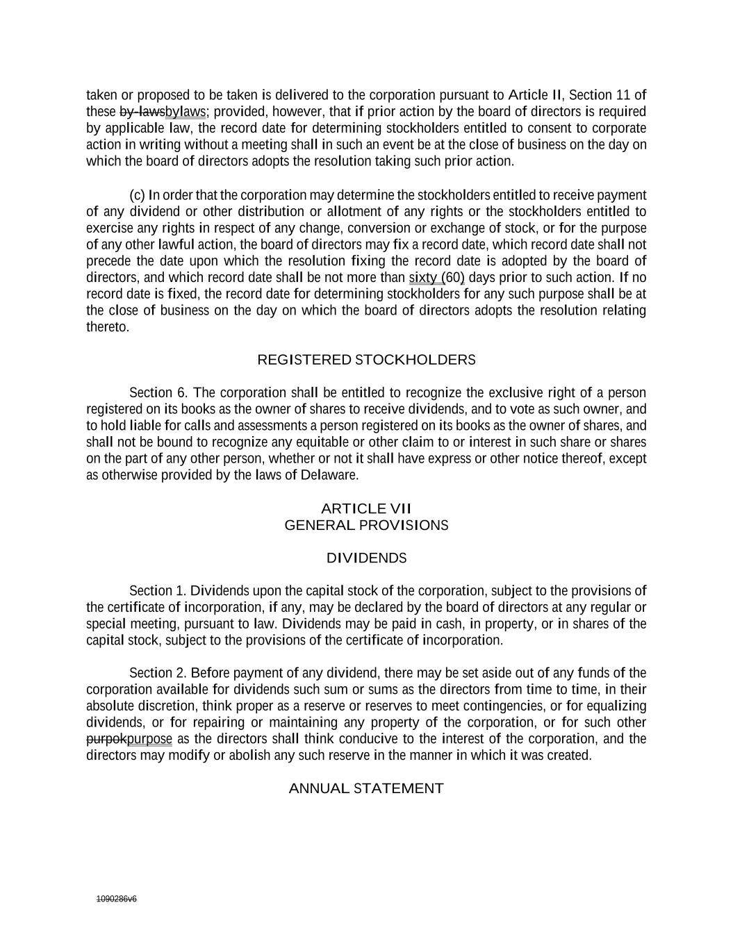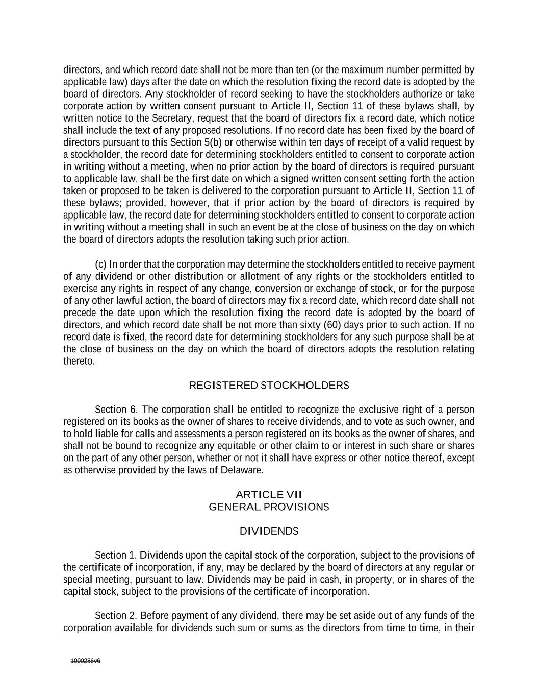 1090286v6 taken or proposed to be taken is delivered to the corporation pursuant to Article II, Section 11 of these by-lawsbylaws; provided, however, that if prior action by the board of directors is required by applicable law, the record date for determining stockholders entitled to consent to corporate action in writing without a meeting shall in such an event be at the close of business on the day on which the board of directors adopts the resolution taking such prior action. (c) In order that the corporation may determine the stockholders entitled to receive payment of any dividend or other distribution or allotment of any rights or the stockholders entitled to exercise any rights in respect of any change, conversion or exchange of stock, or for the purpose of any other lawful action, the board of directors may fix a record date, which record date shall not precede the date upon which the resolution fixing the record date is adopted by the board of directors, and which record date shall be not more than sixty (60) days prior to such action. If no record date is fixed, the record date for determining stockholders for any such purpose shall be at the close of business on the day on which the board of directors adopts the resolution relating thereto. REGISTERED STOCKHOLDERS Section 6. The corporation shall be entitled to recognize the exclusive right of a person registered on its books as the owner of shares to receive dividends, and to vote as such owner, and to hold liable for calls and assessments a person registered on its books as the owner of shares, and shall not be bound to recognize any equitable or other claim to or interest in such share or shares on the part of any other person, whether or not it shall have express or other notice thereof, except as otherwise provided by the laws of Delaware. ARTICLE VII GENERAL PROVISIONS DIVIDENDS Section 1. Dividends upon the capital stock of the corporation, subject to the provisions of the certificate of incorporation, if any, may be declared by the board of directors at any regular or special meeting, pursuant to law. Dividends may be paid in cash, in property, or in shares of the capital stock, subject to the provisions of the certificate of incorporation. Section 2. Before payment of any dividend, there may be set aside out of any funds of the corporation available for dividends such sum or sums as the directors from time to time, in their absolute discretion, think proper as a reserve or reserves to meet contingencies, or for equalizing dividends, or for repairing or maintaining any property of the corporation, or for such other purpokpurpose as the directors shall think conducive to the interest of the corporation, and the directors may modify or abolish any such reserve in the manner in which it was created. ANNUAL STATEMENT