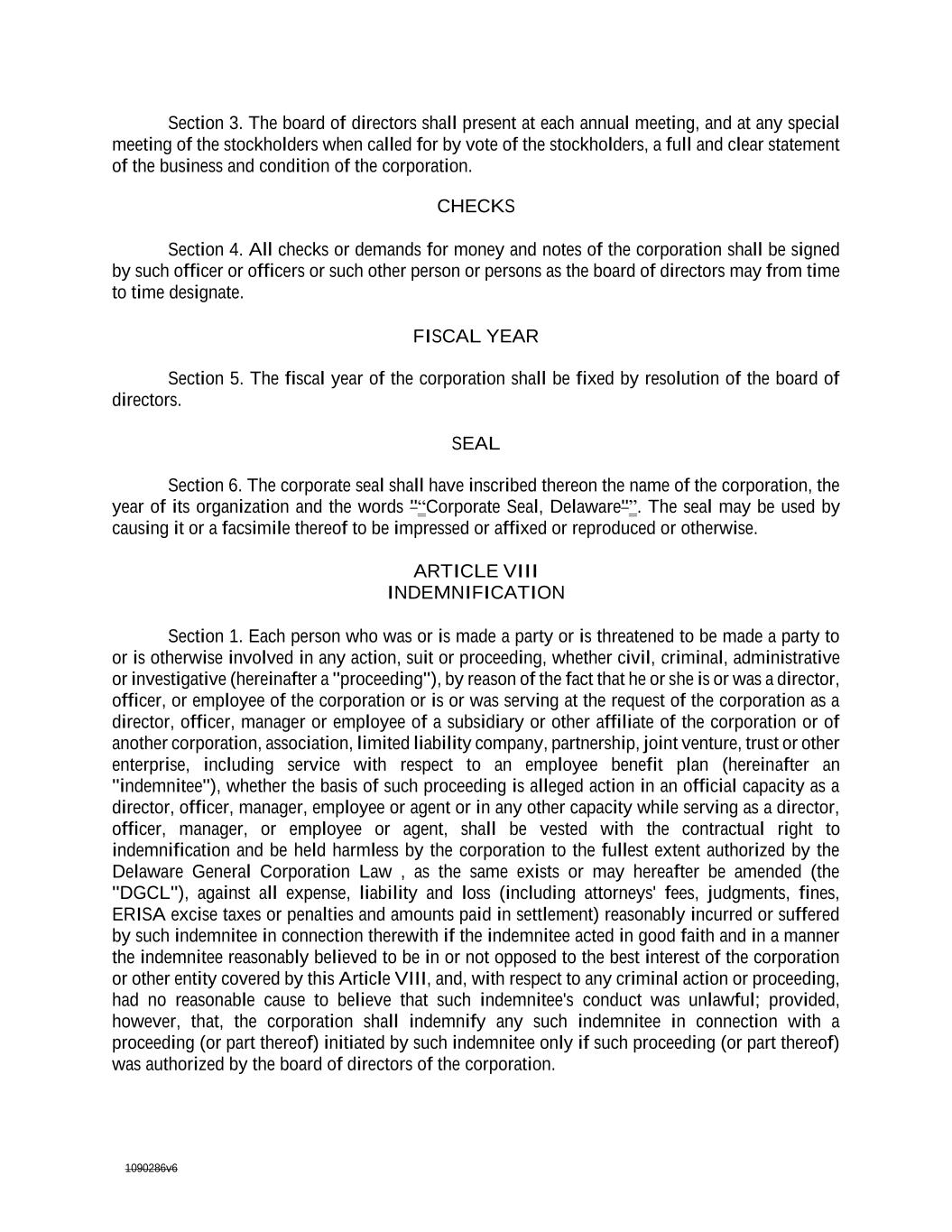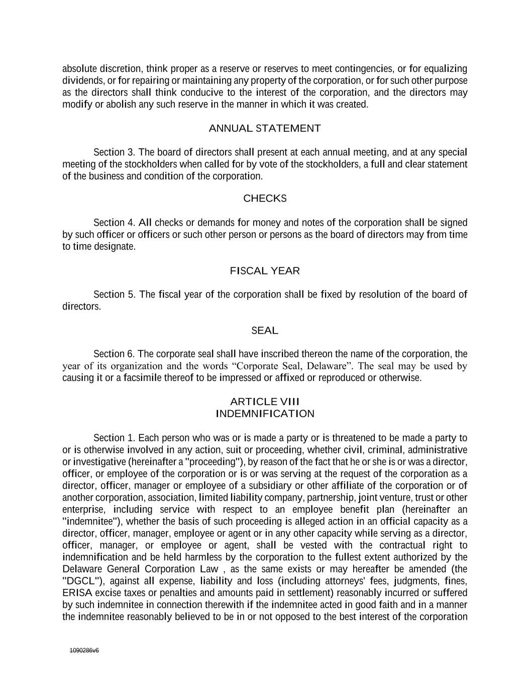 1090286v6 Section 3. The board of directors shall present at each annual meeting, and at any special meeting of the stockholders when called for by vote of the stockholders, a full and clear statement of the business and condition of the corporation. CHECKS Section 4. All checks or demands for money and notes of the corporation shall be signed by such officer or officers or such other person or persons as the board of directors may from time to time designate. FISCAL YEAR Section 5. The fiscal year of the corporation shall be fixed by resolution of the board of directors. SEAL Section 6. The corporate seal shall have inscribed thereon the name of the corporation, the year of its organization and the words "“Corporate Seal, Delaware"”. The seal may be used by causing it or a facsimile thereof to be impressed or affixed or reproduced or otherwise. ARTICLE VIII INDEMNIFICATION Section 1. Each person who was or is made a party or is threatened to be made a party to or is otherwise involved in any action, suit or proceeding, whether civil, criminal, administrative or investigative (hereinafter a "proceeding"), by reason of the fact that he or she is or was a director, officer, or employee of the corporation or is or was serving at the request of the corporation as a director, officer, manager or employee of a subsidiary or other affiliate of the corporation or of another corporation, association, limited liability company, partnership, joint venture, trust or other enterprise, including service with respect to an employee benefit plan (hereinafter an "indemnitee"), whether the basis of such proceeding is alleged action in an official capacity as a director, officer, manager, employee or agent or in any other capacity while serving as a director, officer, manager, or employee or agent, shall be vested with the contractual right to indemnification and be held harmless by the corporation to the fullest extent authorized by the Delaware General Corporation Law , as the same exists or may hereafter be amended (the "DGCL"), against all expense, liability and loss (including attorneys' fees, judgments, fines, ERISA excise taxes or penalties and amounts paid in settlement) reasonably incurred or suffered by such indemnitee in connection therewith if the indemnitee acted in good faith and in a manner the indemnitee reasonably believed to be in or not opposed to the best interest of the corporation or other entity covered by this Article VIII, and, with respect to any criminal action or proceeding, had no reasonable cause to believe that such indemnitee's conduct was unlawful; provided, however, that, the corporation shall indemnify any such indemnitee in connection with a proceeding (or part thereof) initiated by such indemnitee only if such proceeding (or part thereof) was authorized by the board of directors of the corporation.