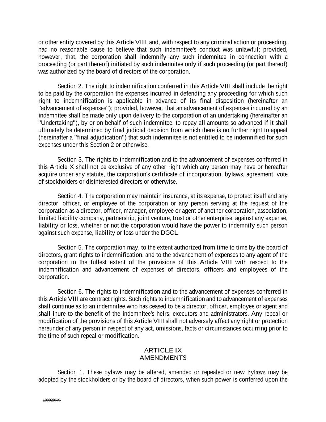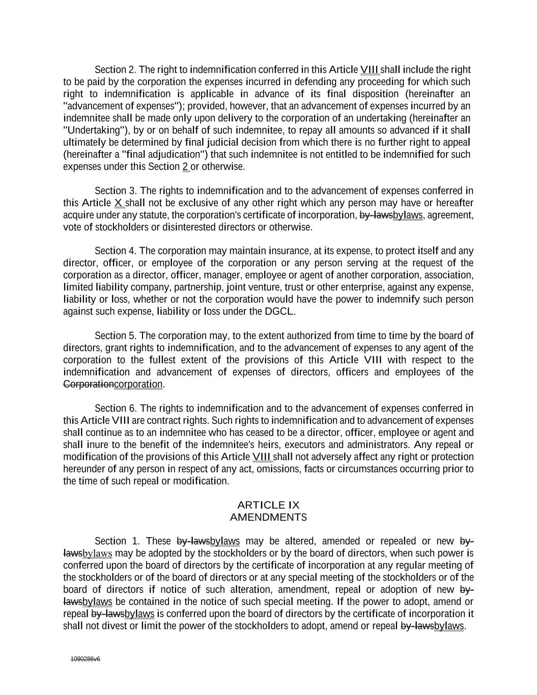 1090286v6 Section 2. The right to indemnification conferred in this Article VIII shall include the right to be paid by the corporation the expenses incurred in defending any proceeding for which such right to indemnification is applicable in advance of its final disposition (hereinafter an "advancement of expenses"); provided, however, that an advancement of expenses incurred by an indemnitee shall be made only upon delivery to the corporation of an undertaking (hereinafter an "Undertaking"), by or on behalf of such indemnitee, to repay all amounts so advanced if it shall ultimately be determined by final judicial decision from which there is no further right to appeal (hereinafter a "final adjudication") that such indemnitee is not entitled to be indemnified for such expenses under this Section 2 or otherwise. Section 3. The rights to indemnification and to the advancement of expenses conferred in this Article X shall not be exclusive of any other right which any person may have or hereafter acquire under any statute, the corporation's certificate of incorporation, by-lawsbylaws, agreement, vote of stockholders or disinterested directors or otherwise. Section 4. The corporation may maintain insurance, at its expense, to protect itself and any director, officer, or employee of the corporation or any person serving at the request of the corporation as a director, officer, manager, employee or agent of another corporation, association, limited liability company, partnership, joint venture, trust or other enterprise, against any expense, liability or loss, whether or not the corporation would have the power to indemnify such person against such expense, liability or loss under the DGCL. Section 5. The corporation may, to the extent authorized from time to time by the board of directors, grant rights to indemnification, and to the advancement of expenses to any agent of the corporation to the fullest extent of the provisions of this Article VIII with respect to the indemnification and advancement of expenses of directors, officers and employees of the Corporationcorporation. Section 6. The rights to indemnification and to the advancement of expenses conferred in this Article VIII are contract rights. Such rights to indemnification and to advancement of expenses shall continue as to an indemnitee who has ceased to be a director, officer, employee or agent and shall inure to the benefit of the indemnitee's heirs, executors and administrators. Any repeal or modification of the provisions of this Article VIII shall not adversely affect any right or protection hereunder of any person in respect of any act, omissions, facts or circumstances occurring prior to the time of such repeal or modification. ARTICLE IX AMENDMENTS Section 1. These by-lawsbylaws may be altered, amended or repealed or new by- lawsbylaws may be adopted by the stockholders or by the board of directors, when such power is conferred upon the board of directors by the certificate of incorporation at any regular meeting of the stockholders or of the board of directors or at any special meeting of the stockholders or of the board of directors if notice of such alteration, amendment, repeal or adoption of new by- lawsbylaws be contained in the notice of such special meeting. If the power to adopt, amend or repeal by-lawsbylaws is conferred upon the board of directors by the certificate of incorporation it shall not divest or limit the power of the stockholders to adopt, amend or repeal by-lawsbylaws.
