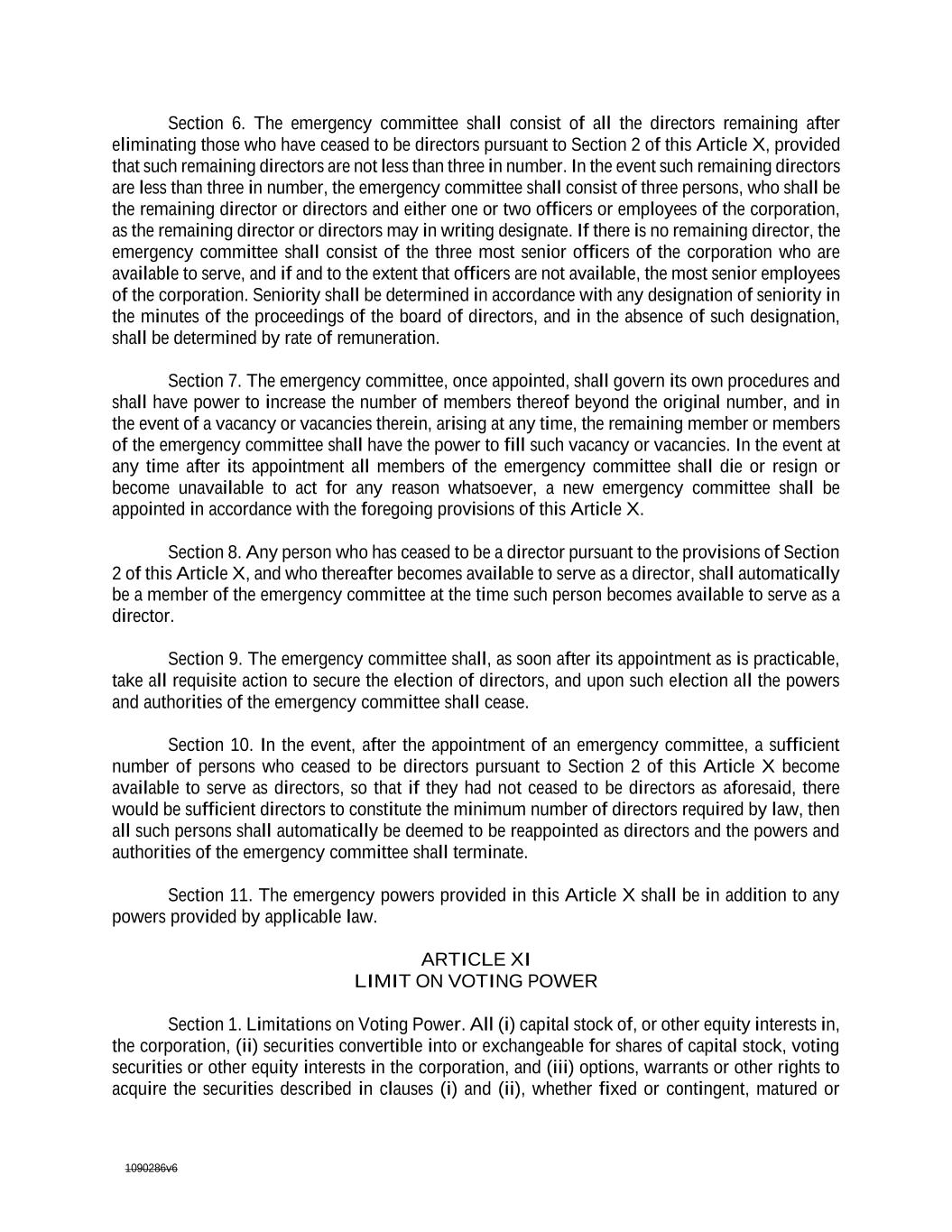 1090286v6 ARTICLE X EMERGENCY PROVISIONS Section 1. The provisions of this Article X shall be operative only during a national emergency declared by the President of the United States or the person performing the President's functions, or in the event of a nuclear, atomic or other attack on the United States or on a locality in which the corporation conducts its principal business or customarily holds meetings of its board of directors or its stockholders, or during the existence of any other catastrophic event or similar emergency, as a result of which a quorum of the board of directors cannot readily be assembled for action. Said provisions in such event shall override all other bylaws of the corporation in conflict with any provisions of this Article X and shall remain operative during such emergency, but thereafter shall be inoperative; provided, that, all actions taken in good faith pursuant to such provisions shall thereafter remain in full force and effect unless and until revoked by action taken pursuant to the provisions of the by-lawsbylaws other than those contained in this Article X. Section 2. All directors who are not available to perform their duties as directors by reason of physical or mental incapacity or for any other reason or who are unwilling to perform their duties or whose whereabouts are unknown shall automatically cease to be directors, with like effect as if such persons had resigned as directors, so long as such unavailability continues. Section 3. The authorized number of directors shall be the number of directors remaining after eliminating those who have ceased to be directors pursuant to Section 2 of this Article X, or the minimum number required by applicable law, whichever number is greater. Section 4. The number of directors necessary to constitute a quorum shall be one-third of the authorized number of directors as specified in Section 3 of this Article X, or such other minimum number as, pursuant to the law or lawful decree then in force, it is possible for the bylaws of a corporation to specify. Section 5. In the event the number of directors remaining after eliminating those who have ceased to be directors pursuant to Section 2 of this Article X is less than the minimum number of authorized directors required by law, then until the appointment of additional directors to make up such required minimum, all the powers and authorities which the board of directors could by law delegate, including all powers and authorities which the board of directors could delegate to a committee, shall be automatically vested in an emergency committee, and the emergency committee shall thereafter manage the affairs of the corporation pursuant to such powers and authorities and shall have all other powers and authorities as may by law or lawful decree be conferred on any person or body of persons during a period of emergency. Section 6. The emergency committee shall consist of all the directors remaining after eliminating those who have ceased to be directors pursuant to Section 2 of this Article X, provided that such remaining directors are not less than three in number. In the event such remaining directors are less than three in number, the emergency committee shall consist of three persons, who shall be the remaining director or directors and either one or two officers or employees of the corporation, as the remaining director or directors may in writing designate. If there is no remaining director, the emergency committee shall consist of the three most senior officers of the corporation
