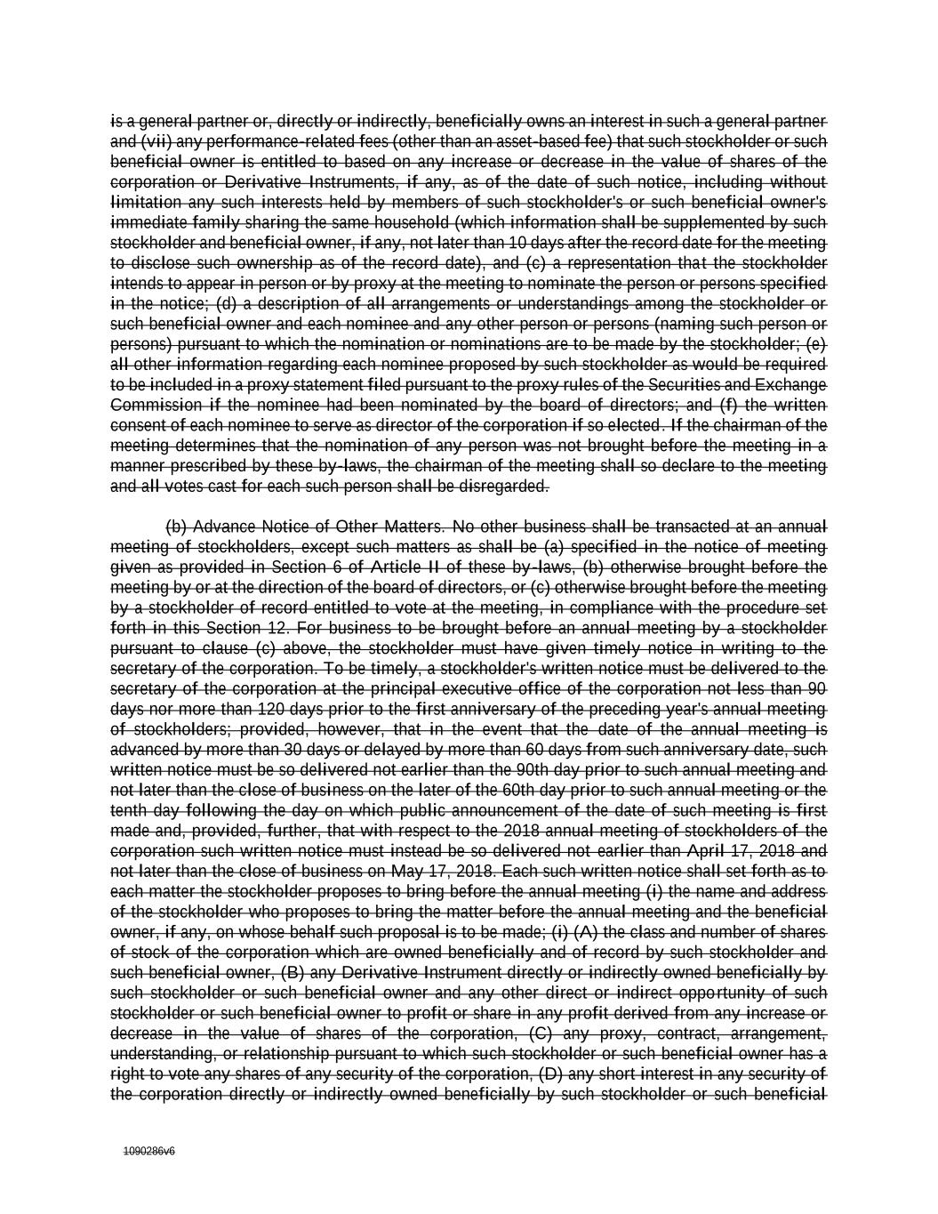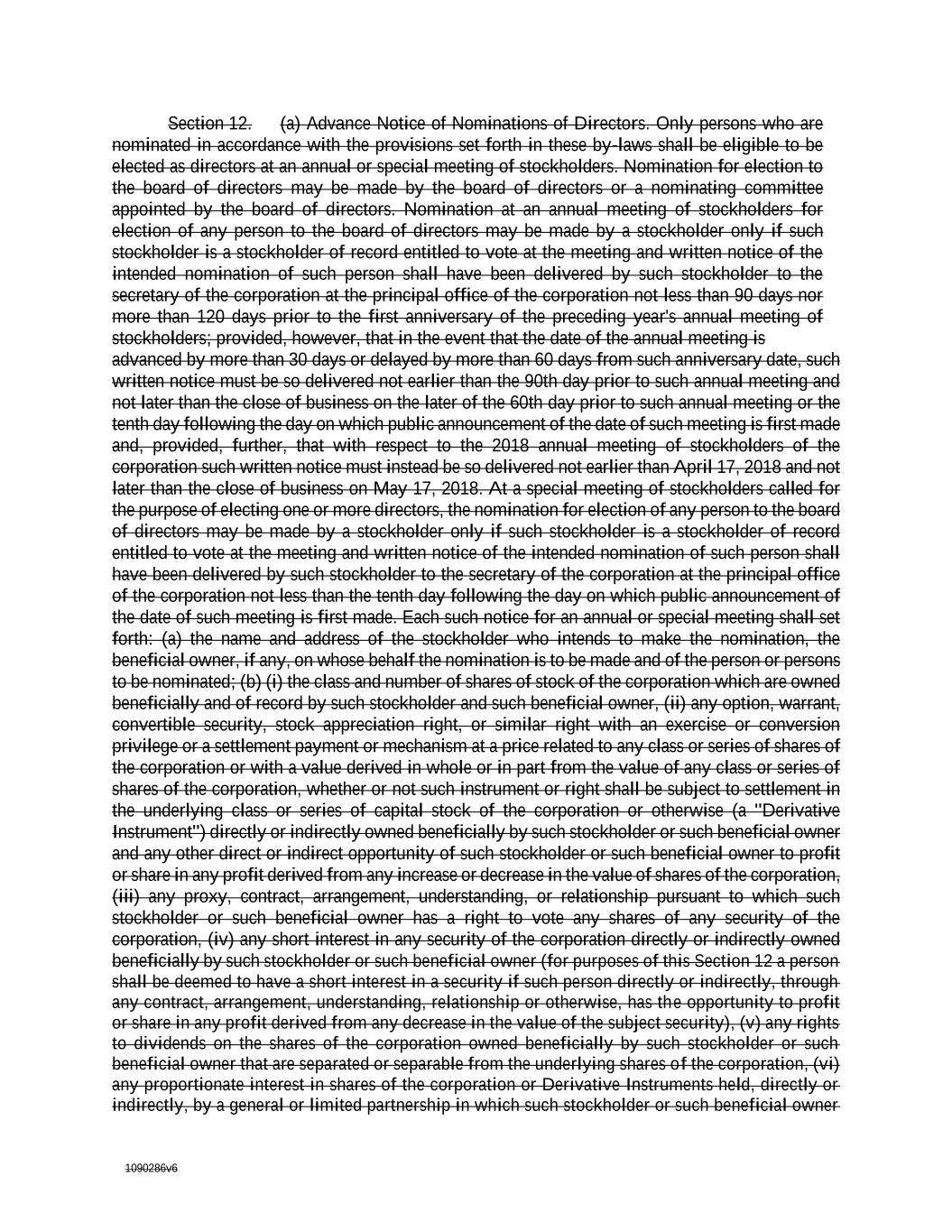 1090286v6 Section 12. (a) Advance Notice of Nominations of Directors. Only persons who are nominated in accordance with the provisions set forth in these by-laws shall be eligible to be elected as directors at an annual or special meeting of stockholders. Nomination for election to the board of directors may be made by the board of directors or a nominating committee appointed by the board of directors. Nomination at an annual meeting of stockholders for election of any person to the board of directors may be made by a stockholder only if such stockholder is a stockholder of record entitled to vote at the meeting and written notice of the intended nomination of such person shall have been delivered by such stockholder to the secretary of the corporation at the principal office of the corporation not less than 90 days nor more than 120 days prior to the first anniversary of the preceding year's annual meeting of stockholders; provided, however, that in the event that the date of the annual meeting is advanced by more than 30 days or delayed by more than 60 days from such anniversary date, such written notice must be so delivered not earlier than the 90th day prior to such annual meeting and not later than the close of business on the later of the 60th day prior to such annual meeting or the tenth day following the day on which public announcement of the date of such meeting is first made and, provided, further, that with respect to the 2018 annual meeting of stockholders of the corporation such written notice must instead be so delivered not earlier than April 17, 2018 and not later than the close of business on May 17, 2018. At a special meeting of stockholders called for the purpose of electing one or more directors, the nomination for election of any person to the board of directors may be made by a stockholder only if such stockholder is a stockholder of record entitled to vote at the meeting and written notice of the intended nomination of such person shall have been delivered by such stockholder to the secretary of the corporation at the principal office of the corporation not less than the tenth day following the day on which public announcement of the date of such meeting is first made. Each such notice for an annual or special meeting shall set forth: (a) the name and address of the stockholder who intends to make the nomination, the beneficial owner, if any, on whose behalf the nomination is to be made and of the person or persons to be nominated; (b) (i) the class and number of shares of stock of the corporation which are owned beneficially and of record by such stockholder and such beneficial owner, (ii) any option, warrant, convertible security, stock appreciation right, or similar right with an exercise or conversion privilege or a settlement payment or mechanism at a price related to any class or series of shares of the corporation or with a value derived in whole or in part from the value of any class or series of shares of the corporation, whether or not such instrument or right shall be subject to settlement in the underlying class or series of capital stock of the corporation or otherwise (a "Derivative Instrument") directly or indirectly owned beneficially by such stockholder or such beneficial owner and any other direct or indirect opportunity of such stockholder or such beneficial owner to profit or share in any profit derived from any increase or decrease in the value of shares of the corporation, (iii) any proxy, contract, arrangement, understanding, or relationship pursuant to which such stockholder or such beneficial owner has a right to vote any shares of any security of the corporation, (iv) any short interest in any security of the corporation directly or indirectly owned beneficially by such stockholder or such beneficial owner (for purposes of this Section 12 a person shall be deemed to have a short interest in a security if such person directly or indirectly, through any contract, arrangement, understanding, relationship or otherwise, has the opportunity to profit or share in any profit derived from any decrease in the value of the subject security), (v) any rights to dividends on the shares of the corporation owned beneficially by such stockholder or such beneficial owner that are separated or separable from the underlying shares of the corporation, (vi) any proportionate interest in shares of the corporation or Derivative Instruments held, directly or indirectly, by a general or limited partnership in which such stockholder or such beneficial owner