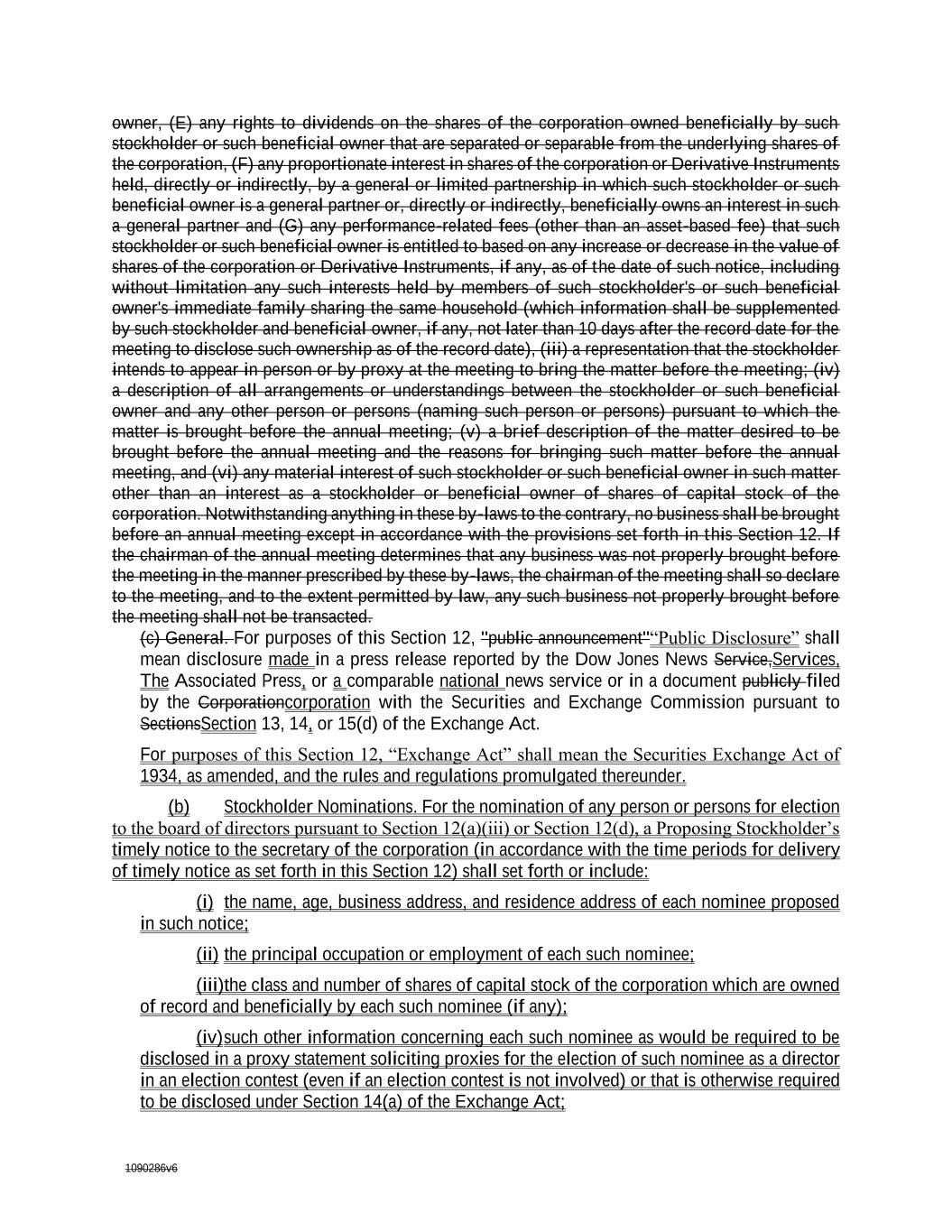 1090286v6 owner, (E) any rights to dividends on the shares of the corporation owned beneficially by such stockholder or such beneficial owner that are separated or separable from the underlying shares of the corporation, (F) any proportionate interest in shares of the corporation or Derivative Instruments held, directly or indirectly, by a general or limited partnership in which such stockholder or such beneficial owner is a general partner or, directly or indirectly, beneficially owns an interest in such a general partner and (G) any performance-related fees (other than an asset-based fee) that such stockholder or such beneficial owner is entitled to based on any increase or decrease in the value of shares of the corporation or Derivative Instruments, if any, as of the date of such notice, including without limitation any such interests held by members of such stockholder's or such beneficial owner's immediate family sharing the same household (which information shall be supplemented by such stockholder and beneficial owner, if any, not later than 10 days after the record date for the meeting to disclose such ownership as of the record date), (iii) a representation that the stockholder intends to appear in person or by proxy at the meeting to bring the matter before the meeting; (iv) a description of all arrangements or understandings between the stockholder or such beneficial owner and any other person or persons (naming such person or persons) pursuant to which the matter is brought before the annual meeting; (v) a brief description of the matter desired to be brought before the annual meeting and the reasons for bringing such matter before the annual meeting, and (vi) any material interest of such stockholder or such beneficial owner in such matter other than an interest as a stockholder or beneficial owner of shares of capital stock of the corporation. Notwithstanding anything in these by-laws to the contrary, no business shall be brought before an annual meeting except in accordance with the provisions set forth in this Section 12. If the chairman of the annual meeting determines that any business was not properly brought before the meeting in the manner prescribed by these by-laws, the chairman of the meeting shall so declare to the meeting, and to the extent permitted by law, any such business not properly brought before the meeting shall not be transacted. (c) General. For purposes of this Section 12, "public announcement"“Public Disclosure” shall mean disclosure made in a press release reported by the Dow Jones News Service,Services, The Associated Press, or a comparable national news service or in a document publicly filed by the Corporationcorporation with the Securities and Exchange Commission pursuant to SectionsSection 13, 14, or 15(d) of the Exchange Act. For purposes of this Section 12, “Exchange Act” shall mean the Securities Exchange Act of 1934, as amended, and the rules and regulations promulgated thereunder. (b) Stockholder Nominations. For the nomination of any person or persons for election to the board of directors pursuant to Section 12(a)(iii) or Section 12(d), a Proposing Stockholder’s timely notice to the secretary of the corporation (in accordance with the time periods for delivery of timely notice as set forth in this Section 12) shall set forth or include: (i) the name, age, business address, and residence address of each nominee proposed in such notice; (ii) the principal occupation or employment of each such nominee; (iii)the class and number of shares of capital stock of the corporation which are owned of record and beneficially by each such nominee (if any); (iv) such other information concerning each such nominee as would be required to be disclosed in a proxy statement soliciting proxies for the election of such nominee as a director in an election contest (even if an election contest is not involved) or that is otherwise required to be disclosed under Section 14(a) of the Exchange Act;