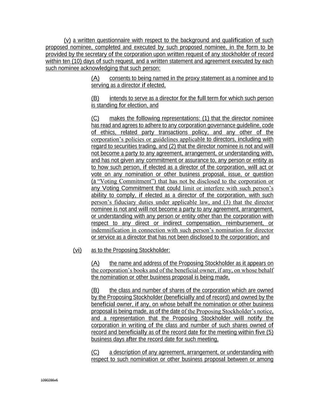 1090286v6 (v) a written questionnaire with respect to the background and qualification of such proposed nominee, completed and executed by such proposed nominee, in the form to be provided by the secretary of the corporation upon written request of any stockholder of record within ten (10) days of such request, and a written statement and agreement executed by each such nominee acknowledging that such person: (A) consents to being named in the proxy statement as a nominee and to serving as a director if elected, (B) intends to serve as a director for the full term for which such person is standing for election, and (C) makes the following representations: (1) that the director nominee has read and agrees to adhere to any corporation governance guideline, code of ethics, related party transactions policy, and any other of the corporation’s policies or guidelines applicable to directors, including with regard to securities trading, and (2) that the director nominee is not and will not become a party to any agreement, arrangement, or understanding with, and has not given any commitment or assurance to, any person or entity as to how such person, if elected as a director of the corporation, will act or vote on any nomination or other business proposal, issue, or question (a “Voting Commitment”) that has not be disclosed to the corporation or any Voting Commitment that could limit or interfere with such person’s ability to comply, if elected as a director of the corporation, with such person’s fiduciary duties under applicable law, and (3) that the director nominee is not and will not become a party to any agreement, arrangement, or understanding with any person or entity other than the corporation with respect to any direct or indirect compensation, reimbursement, or indemnification in connection with such person’s nomination for director or service as a director that has not been disclosed to the corporation; and (vi) as to the Proposing Stockholder: (A) the name and address of the Proposing Stockholder as it appears on the corporation’s books and of the beneficial owner, if any, on whose behalf the nomination or other business proposal is being made, (B) the class and number of shares of the corporation which are owned by the Proposing Stockholder (beneficially and of record) and owned by the beneficial owner, if any, on whose behalf the nomination or other business proposal is being made, as of the date of the Proposing Stockholder’s notice, and a representation that the Proposing Stockholder will notify the corporation in writing of the class and number of such shares owned of record and beneficially as of the record date for the meeting within five (5) business days after the record date for such meeting, (C) a description of any agreement, arrangement, or understanding with respect to such nomination or other business proposal between or among