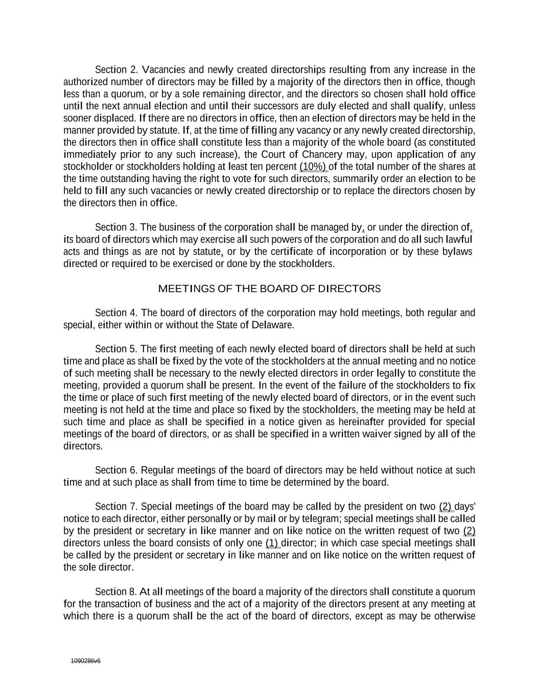 1090286v6 Section 2. Vacancies and newly created directorships resulting from any increase in the authorized number of directors may be filled by a majority of the directors then in office, though less than a quorum, or by a sole remaining director, and the directors so chosen shall hold office until the next annual election and until their successors are duly elected and shall qualify, unless sooner displaced. If there are no directors in office, then an election of directors may be held in the manner provided by statute. If, at the time of filling any vacancy or any newly created directorship, the directors then in office shall constitute less than a majority of the whole board (as constituted immediately prior to any such increase), the Court of Chancery may, upon application of any stockholder or stockholders holding at least ten percent (10%) of the total number of the shares at the time outstanding having the right to vote for such directors, summarily order an election to be held to fill any such vacancies or newly created directorship or to replace the directors chosen by the directors then in office. Section 3. The business of the corporation shall be managed by, or under the direction of, its board of directors which may exercise all such powers of the corporation and do all such lawful acts and things as are not by statute, or by the certificate of incorporation or by these bylaws directed or required to be exercised or done by the stockholders. MEETINGS OF THE BOARD OF DIRECTORS Section 4. The board of directors of the corporation may hold meetings, both regular and special, either within or without the State of Delaware. Section 5. The first meeting of each newly elected board of directors shall be held at such time and place as shall be fixed by the vote of the stockholders at the annual meeting and no notice of such meeting shall be necessary to the newly elected directors in order legally to constitute the meeting, provided a quorum shall be present. In the event of the failure of the stockholders to fix the time or place of such first meeting of the newly elected board of directors, or in the event such meeting is not held at the time and place so fixed by the stockholders, the meeting may be held at such time and place as shall be specified in a notice given as hereinafter provided for special meetings of the board of directors, or as shall be specified in a written waiver signed by all of the directors. Section 6. Regular meetings of the board of directors may be held without notice at such time and at such place as shall from time to time be determined by the board. Section 7. Special meetings of the board may be called by the president on two (2) days' notice to each director, either personally or by mail or by telegram; special meetings shall be called by the president or secretary in like manner and on like notice on the written request of two (2) directors unless the board consists of only one (1) director; in which case special meetings shall be called by the president or secretary in like manner and on like notice on the written request of the sole director. Section 8. At all meetings of the board a majority of the directors shall constitute a quorum for the transaction of business and the act of a majority of the directors present at any meeting at which there is a quorum shall be the act of the board of directors, except as may be otherwise