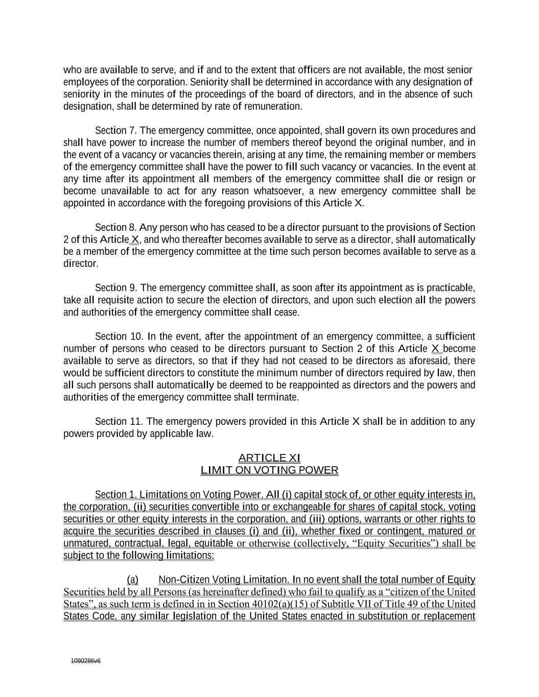 1090286v6 who are available to serve, and if and to the extent that officers are not available, the most senior employees of the corporation. Seniority shall be determined in accordance with any designation of seniority in the minutes of the proceedings of the board of directors, and in the absence of such designation, shall be determined by rate of remuneration. Section 7. The emergency committee, once appointed, shall govern its own procedures and shall have power to increase the number of members thereof beyond the original number, and in the event of a vacancy or vacancies therein, arising at any time, the remaining member or members of the emergency committee shall have the power to fill such vacancy or vacancies. In the event at any time after its appointment all members of the emergency committee shall die or resign or become unavailable to act for any reason whatsoever, a new emergency committee shall be appointed in accordance with the foregoing provisions of this Article X. Section 8. Any person who has ceased to be a director pursuant to the provisions of Section 2 of this Article X, and who thereafter becomes available to serve as a director, shall automatically be a member of the emergency committee at the time such person becomes available to serve as a director. Section 9. The emergency committee shall, as soon after its appointment as is practicable, take all requisite action to secure the election of directors, and upon such election all the powers and authorities of the emergency committee shall cease. Section 10. In the event, after the appointment of an emergency committee, a sufficient number of persons who ceased to be directors pursuant to Section 2 of this Article X become available to serve as directors, so that if they had not ceased to be directors as aforesaid, there would be sufficient directors to constitute the minimum number of directors required by law, then all such persons shall automatically be deemed to be reappointed as directors and the powers and authorities of the emergency committee shall terminate. Section 11. The emergency powers provided in this Article X shall be in addition to any powers provided by applicable law. ARTICLE XI LIMIT ON VOTING POWER Section 1. Limitations on Voting Power. All (i) capital stock of, or other equity interests in, the corporation, (ii) securities convertible into or exchangeable for shares of capital stock, voting securities or other equity interests in the corporation, and (iii) options, warrants or other rights to acquire the securities described in clauses (i) and (ii), whether fixed or contingent, matured or unmatured, contractual, legal, equitable or otherwise (collectively, “Equity Securities”) shall be subject to the following limitations: (a) Non-Citizen Voting Limitation. In no event shall the total number of Equity Securities held by all Persons (as hereinafter defined) who fail to qualify as a “citizen of the United States”, as such term is defined in in Section 40102(a)(15) of Subtitle VII of Title 49 of the United States Code, any similar legislation of the United States enacted in substitution or replacement