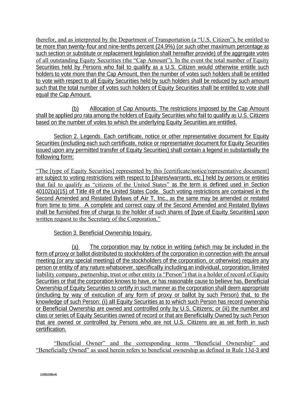 1090286v6 therefor, and as interpreted by the Department of Transportation (a “U.S. Citizen”), be entitled to be more than twenty-four and nine-tenths percent (24.9%) (or such other maximum percentage as such section or substitute or replacement legislation shall hereafter provide) of the aggregate votes of all outstanding Equity Securities (the “Cap Amount”). In the event the total number of Equity Securities held by Persons who fail to qualify as a U.S. Citizen would otherwise entitle such holders to vote more than the Cap Amount, then the number of votes such holders shall be entitled to vote with respect to all Equity Securities held by such holders shall be reduced by such amount such that the total number of votes such holders of Equity Securities shall be entitled to vote shall equal the Cap Amount. (b) Allocation of Cap Amounts. The restrictions imposed by the Cap Amount shall be applied pro rata among the holders of Equity Securities who fail to qualify as U.S. Citizens based on the number of votes to which the underlying Equity Securities are entitled. Section 2. Legends. Each certificate, notice or other representative document for Equity Securities (including each such certificate, notice or representative document for Equity Securities issued upon any permitted transfer of Equity Securities) shall contain a legend in substantially the following form: “The [type of Equity Securities] represented by this [certificate/notice/representative document] are subject to voting restrictions with respect to [shares/warrants, etc.] held by persons or entities that fail to qualify as “citizens of the United States” as the term is defined used in Section 40102(a)(15) of Title 49 of the United States Code. Such voting restrictions are contained in the Second Amended and Restated Bylaws of Air T, Inc., as the same may be amended or restated from time to time. A complete and correct copy of the Second Amended and Restated Bylaws shall be furnished free of charge to the holder of such shares of [type of Equity Securities] upon written request to the Secretary of the Corporation.” Section 3. Beneficial Ownership Inquiry. (a) The corporation may by notice in writing (which may be included in the form of proxy or ballot distributed to stockholders of the corporation in connection with the annual meeting (or any special meeting) of the stockholders of the corporation, or otherwise) require any person or entity of any nature whatsoever, specifically including an individual, corporation, limited liability company, partnership, trust or other entity (a “Person”) that is a holder of record of Equity Securities or that the corporation knows to have, or has reasonable cause to believe has, Beneficial Ownership of Equity Securities to certify in such manner as the corporation shall deem appropriate (including by way of execution of any form of proxy or ballot by such Person) that, to the knowledge of such Person: (i) all Equity Securities as to which such Person has record ownership or Beneficial Ownership are owned and controlled only by U.S. Citizens; or (ii) the number and class or series of Equity Securities owned of record or that are Beneficially Owned by such Person that are owned or controlled by Persons who are not U.S. Citizens are as set forth in such certification. “Beneficial Owner” and the corresponding terms “Beneficial Ownership” and “Beneficially Owned” as used herein refers to beneficial ownership as defined in Rule 13d-3 and