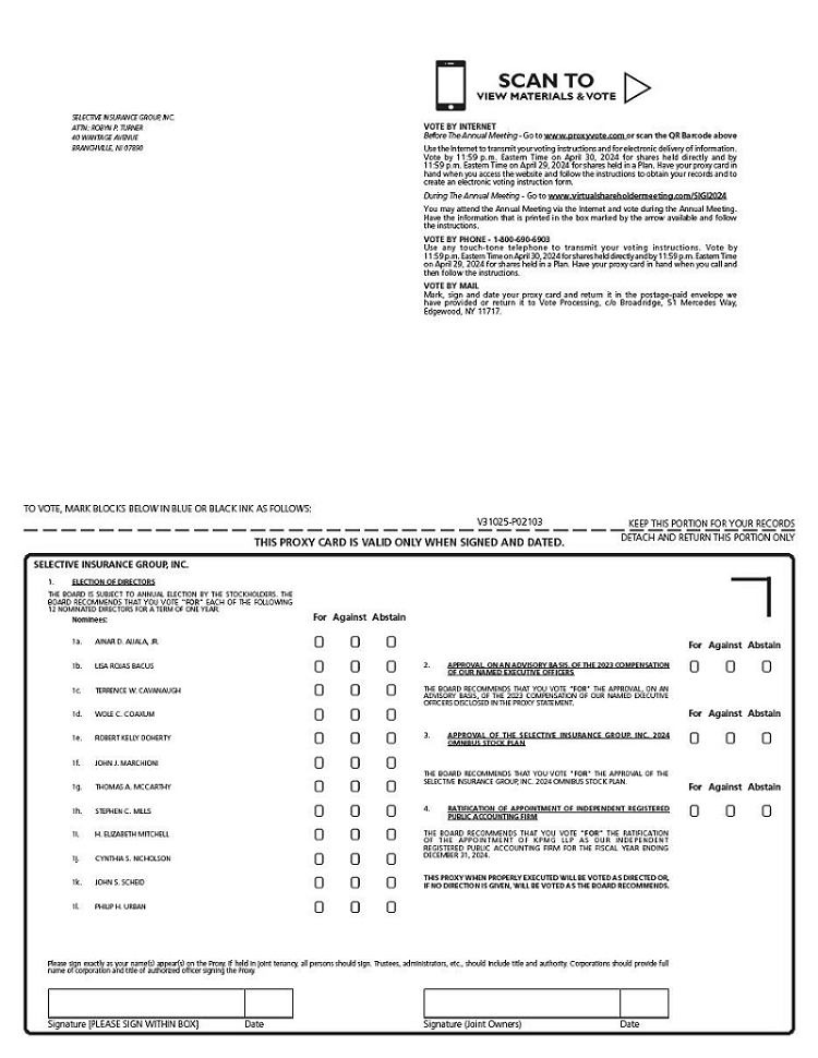 SCAN TO VIEW MATERIALS & VOTESELECTIVE INSURANCE GROUP, INC. ATTN: ROBYN P. TURNER 40 WANTAGE AVENUE BRANCHVILLE, NJ 07890VOTE BY INTERNET Before The Annual Meeting - Go to www.proxyvote.com or scan the QR Barcode above Use the Internet to transmit your voting instructions and for electronic delivery of information. Vote by 11:59 p.m. Eastern Time on April 30, 2024 for shares held directly and by 11:59 p.m. Eastern Time on April 29, 2024 for shares held in a Plan. Have your proxy card in hand when you access the website and follow the instructions to obtain your records and to create an electronic voting instruction form. During The Annual Meeting - Go to www.virtualshareholdermeeting.com/SIGI2024 You may attend the Annual Meeting via the Internet and vote during the Annual Meeting. Have the information that is printed in the box marked by the arrow available and follow the instructions. VOTE BY PHONE - 1-800-690-6903 Use any touch-tone telephone to transmit your voting instructions. Vote by 11:59 p.m. Eastern Time on April 30, 2024 for shares held directly and by 11:59 p.m. Eastern Time on April 29, 2024 for shares held in a Plan. Have your proxy card in hand when you call and then follow the instructions. VOTE BY MAIL Mark, sign and date your proxy card and return it in the postage-paid envelope we have provided or return it to Vote Processing, c/o Broadridge, 51 Mercedes Way, Edgewood, NY 11717.TO VOTE, MARK BLOCKS BELOW IN BLUE OR BLACK INK AS FOLLOWS:V31025-P02103KEEP THIS PORTION FOR YOUR RECORDSSELECTIVE INSURANCE GROUP, INC. 1. ELECTION OF DIRECTORSTHIS PROXY CARD IS VALID ONLY WHEN SIGNED AND DATED.DETACH AND RETURN THIS PORTION ONLYTHE BOARD IS SUBJECT TO ANNUAL ELECTION BY THE STOCKHOLDERS. THE BOARD RECOMMENDS THAT YOU VOTE "FOR" EACH OF THE FOLLOWING 12 NOMINATED DIRECTORS FOR A TERM OF ONE YEAR: Nominees:For Against Abstain1a. AINAR D. AIJALA, JR.1b. LISA ROJAS BACUS1c. TERRENCE W. CAVANAUGH1d. WOLE C. COAXUM1e. ROBERT KELLY DOHERTY1f. JOHN J. MARCHIONI! ! ! ! ! ! ! ! ! ! ! ! ! ! ! ! ! !For Against Abstain2. APPROVAL, ON AN ADVISORY BASIS, OF THE 2023 COMPENSATION OF OUR NAMED EXECUTIVE OFFICERSTHE BOARD RECOMMENDS THAT YOU VOTE “FOR” THE APPROVAL, ON AN ADVISORY BASIS, OF THE 2023 COMPENSATION OF OUR NAMED EXECUTIVE OFFICERS DISCLOSED IN THE PROXY STATEMENT. For Against Abstain3. APPROVAL OF THE SELECTIVE INSURANCE GROUP, INC. 2024 OMNIBUS STOCK PLANTHE BOARD RECOMMENDS THAT YOU VOTE “FOR” THE APPROVAL OF THE1g. THOMAS A. MCCARTHY! ! !SELECTIVE INSURANCE GROUP, INC. 2024 OMNIBUS STOCK PLAN.For Against Abstain1h. STEPHEN C. MILLS1i. H. ELIZABETH MITCHELL1j. CYNTHIA S. NICHOLSON1k. JOHN S. SCHEID1l. PHILIP H. URBAN! ! ! ! ! ! ! ! ! ! ! ! ! ! !4. RATIFICATION OF APPOINTMENT OF INDEPENDENT REGISTERED PUBLIC ACCOUNTING FIRMTHE BOARD RECOMMENDS THAT YOU VOTE “FOR” THE RATIFICATION OF THE APPOINTMENT OF KPMG LLP AS OUR INDEPENDENT REGISTERED PUBLIC ACCOUNTING FIRM FOR THE FISCAL YEAR ENDING DECEMBER 31, 2024.THIS PROXY WHEN PROPERLY EXECUTED WILL BE VOTED AS DIRECTED OR, IF NO DIRECTION IS GIVEN, WILL BE VOTED AS THE BOARD RECOMMENDS.Please sign exactly as your name(s) appear(s) on the Proxy. If held in joint tenancy, all persons should sign. Trustees, administrators, etc., should include title and authority. Corporations should provide full name of corporation and title of authorized officer signing the Proxy.Signature [PLEASE SIGN WITHIN BOX] Date Signature (Joint Owners) Date