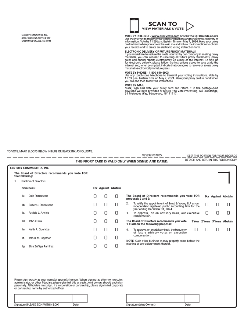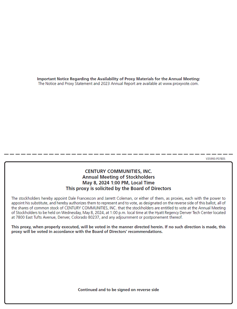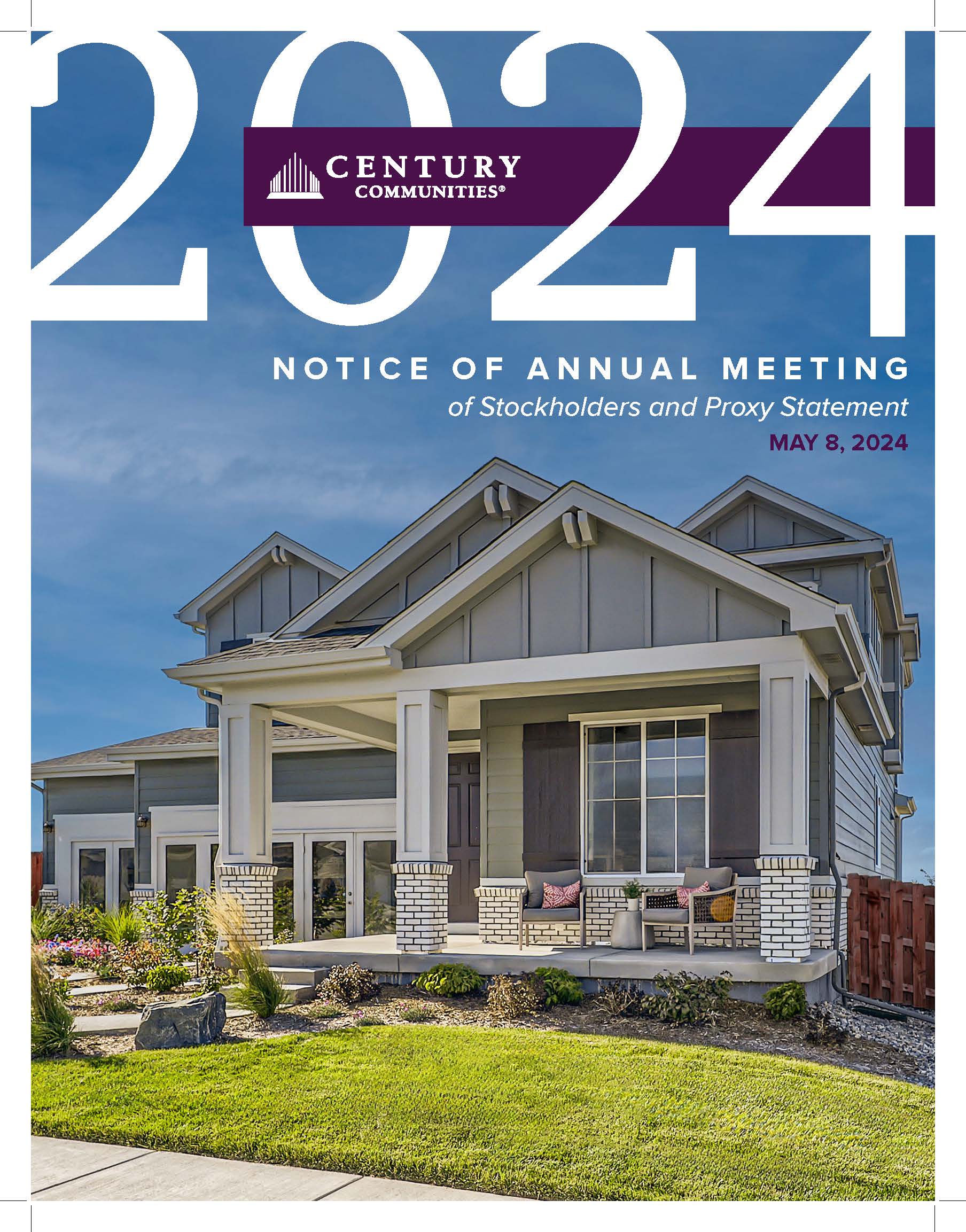 Together with the Board of Directors and the management team at Century Communities, we are pleased to invite you to our 2024 Annual Meeting of Stockholders, which will be held at the Hyatt Regency Denver Tech Center located at 7800 East Tufts Avenue, Denver, Colorado 80237, at 1:00 p.m. local time, on Wednesday, May 8, 2024.