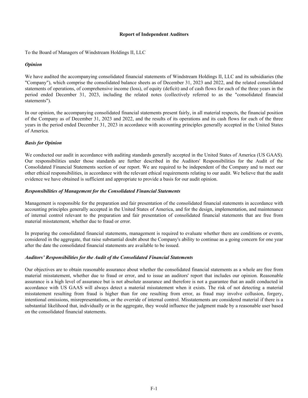 Report of Independent Auditors To the Board of Managers of Windstream Holdings II, LLC Opinion We have audited the accompanying consolidated financial statements of Windstream Holdings II, LLC and its subsidiaries (the "Company"), which comprise the consolidated balance sheets as of December 31, 2023 and 2022, and the related consolidated statements of operations, of comprehensive income (loss), of equity (deficit) and of cash flows for each of the three years in the period ended December 31, 2023, including the related notes (collectively referred to as the "consolidated financial statements"). In our opinion, the accompanying consolidated financial statements present fairly, in all material respects, the financial position of the Company as of December 31, 2023 and 2022, and the results of its operations and its cash flows for each of the three years in the period ended December 31, 2023 in accordance with accounting principles generally accepted in the United States of America. Basis for Opinion We conducted our audit in accordance with auditing standards generally accepted in the United States of America (US GAAS). Our responsibilities under those standards are further described in the Auditors' Responsibilities for the Audit of the Consolidated Financial Statements section of our report. We are required to be independent of the Company and to meet our other ethical responsibilities, in accordance with the relevant ethical requirements relating to our audit. We believe that the audit evidence we have obtained is sufficient and appropriate to provide a basis for our audit opinion. Responsibilities of Management for the Consolidated Financial Statements Management is responsible for the preparation and fair presentation of the consolidated financial statements in accordance with accounting principles generally accepted in the United States of America, and for the design, implementation, and maintenance of internal control relevant to the preparation and fair presentation of consolidated financial statements that are free from material misstatement, whether due to fraud or error. In preparing the consolidated financial statements, management is required to evaluate whether there are conditions or events, considered in the aggregate, that raise substantial doubt about the Company's ability to continue as a going concern for one year after the date the consolidated financial statements are available to be issued. Auditors’ Responsibilities for the Audit of the Consolidated Financial Statements Our objectives are to obtain reasonable assurance about whether the consolidated financial statements as a whole are free from material misstatement, whether due to fraud or error, and to issue an auditors' report that includes our opinion. Reasonable assurance is a high level of assurance but is not absolute assurance and therefore is not a guarantee that an audit conducted in accordance with US GAAS will always detect a material misstatement when it exists. The risk of not detecting a material misstatement resulting from fraud is higher than for one resulting from error, as fraud may involve collusion, forgery, intentional omissions, misrepresentations, or the override of internal control. Misstatements are considered material if there is a substantial likelihood that, individually or in the aggregate, they would influence the judgment made by a reasonable user based on the consolidated financial statements. F-1