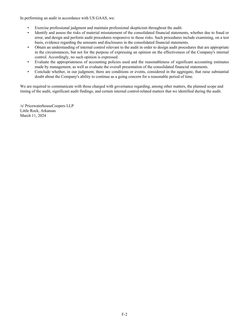 In performing an audit in accordance with US GAAS, we: • Exercise professional judgment and maintain professional skepticism throughout the audit. • Identify and assess the risks of material misstatement of the consolidated financial statements, whether due to fraud or error, and design and perform audit procedures responsive to those risks. Such procedures include examining, on a test basis, evidence regarding the amounts and disclosures in the consolidated financial statements. • Obtain an understanding of internal control relevant to the audit in order to design audit procedures that are appropriate in the circumstances, but not for the purpose of expressing an opinion on the effectiveness of the Company's internal control. Accordingly, no such opinion is expressed. • Evaluate the appropriateness of accounting policies used and the reasonableness of significant accounting estimates made by management, as well as evaluate the overall presentation of the consolidated financial statements. • Conclude whether, in our judgment, there are conditions or events, considered in the aggregate, that raise substantial doubt about the Company's ability to continue as a going concern for a reasonable period of time. We are required to communicate with those charged with governance regarding, among other matters, the planned scope and timing of the audit, significant audit findings, and certain internal control-related matters that we identified during the audit. /s/ PricewaterhouseCoopers LLP Little Rock, Arkansas March 11, 2024 F-2
