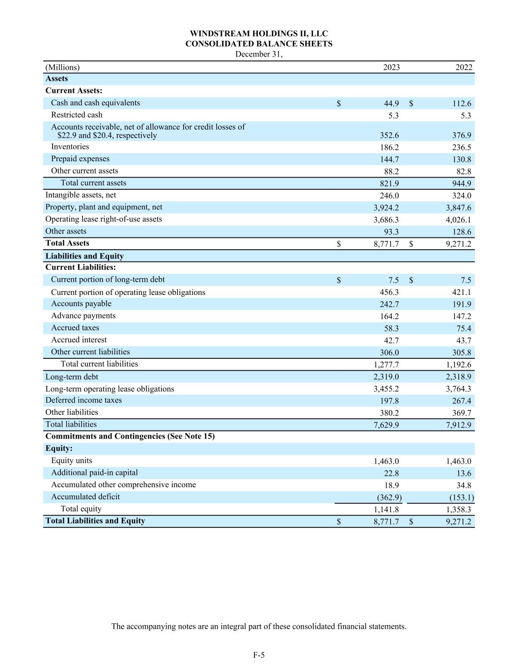 WINDSTREAM HOLDINGS II, LLC CONSOLIDATED BALANCE SHEETS December 31, (Millions) 2023 2022 Assets Current Assets: Cash and cash equivalents $ 44.9 $ 112.6 Restricted cash 5.3 5.3 Accounts receivable, net of allowance for credit losses of $22.9 and $20.4, respectively 352.6 376.9 Inventories 186.2 236.5 Prepaid expenses 144.7 130.8 Other current assets 88.2 82.8 Total current assets 821.9 944.9 Intangible assets, net 246.0 324.0 Property, plant and equipment, net 3,924.2 3,847.6 Operating lease right-of-use assets 3,686.3 4,026.1 Other assets 93.3 128.6 Total Assets $ 8,771.7 $ 9,271.2 Liabilities and Equity Current Liabilities: Current portion of long-term debt $ 7.5 $ 7.5 Current portion of operating lease obligations 456.3 421.1 Accounts payable 242.7 191.9 Advance payments 164.2 147.2 Accrued taxes 58.3 75.4 Accrued interest 42.7 43.7 Other current liabilities 306.0 305.8 Total current liabilities 1,277.7 1,192.6 Long-term debt 2,319.0 2,318.9 Long-term operating lease obligations 3,455.2 3,764.3 Deferred income taxes 197.8 267.4 Other liabilities 380.2 369.7 Total liabilities 7,629.9 7,912.9 Commitments and Contingencies (See Note 15) Equity: Equity units 1,463.0 1,463.0 Additional paid-in capital 22.8 13.6 Accumulated other comprehensive income 18.9 34.8 Accumulated deficit (362.9) (153.1) Total equity 1,141.8 1,358.3 Total Liabilities and Equity $ 8,771.7 $ 9,271.2 The accompanying notes are an integral part of these consolidated financial statements. F-5