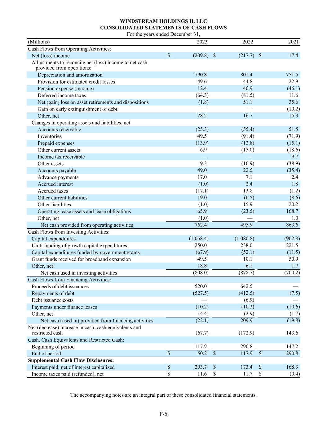 WINDSTREAM HOLDINGS II, LLC CONSOLIDATED STATEMENTS OF CASH FLOWS For the years ended December 31, (Millions) 2023 2022 2021 Cash Flows from Operating Activities: Net (loss) income $ (209.8) $ (217.7) $ 17.4 Adjustments to reconcile net (loss) income to net cash provided from operations: Depreciation and amortization 790.8 801.4 751.5 Provision for estimated credit losses 49.6 44.8 22.9 Pension expense (income) 12.4 40.9 (46.1) Deferred income taxes (64.3) (81.5) 11.6 Net (gain) loss on asset retirements and dispositions (1.8) 51.1 35.6 Gain on early extinguishment of debt — — (10.2) Other, net 28.2 16.7 15.3 Changes in operating assets and liabilities, net Accounts receivable (25.3) (55.4) 51.5 Inventories 49.5 (91.4) (71.9) Prepaid expenses (13.9) (12.8) (15.1) Other current assets 6.9 (15.0) (18.6) Income tax receivable — — 9.7 Other assets 9.3 (16.9) (38.9) Accounts payable 49.0 22.5 (35.4) Advance payments 17.0 7.1 2.4 Accrued interest (1.0) 2.4 1.8 Accrued taxes (17.1) 13.8 (1.2) Other current liabilities 19.0 (6.5) (8.6) Other liabilities (1.0) 15.9 20.2 Operating lease assets and lease obligations 65.9 (23.5) 168.7 Other, net (1.0) — 1.0 Net cash provided from operating activities 762.4 495.9 863.6 Cash Flows from Investing Activities: Capital expenditures (1,058.4) (1,080.8) (962.8) Uniti funding of growth capital expenditures 250.0 238.0 221.5 Capital expenditures funded by government grants (67.9) (52.1) (11.5) Grant funds received for broadband expansion 49.5 10.1 50.9 Other, net 18.8 6.1 1.7 Net cash used in investing activities (808.0) (878.7) (700.2) Cash Flows from Financing Activities: Proceeds of debt issuances 520.0 642.5 — Repayments of debt (527.5) (412.5) (7.5) Debt issuance costs — (6.9) — Payments under finance leases (10.2) (10.3) (10.6) Other, net (4.4) (2.9) (1.7) Net cash (used in) provided from financing activities (22.1) 209.9 (19.8) Net (decrease) increase in cash, cash equivalents and restricted cash (67.7) (172.9) 143.6 Cash, Cash Equivalents and Restricted Cash: Beginning of period 117.9 290.8 147.2 End of period $ 50.2 $ 117.9 $ 290.8 Supplemental Cash Flow Disclosures: Interest paid, net of interest capitalized $ 203.7 $ 173.4 $ 168.3 Income taxes paid (refunded), net $ 11.6 $ 11.7 $ (0.4) The accompanying notes are an integral part of these consolidated financial statements. F-6
