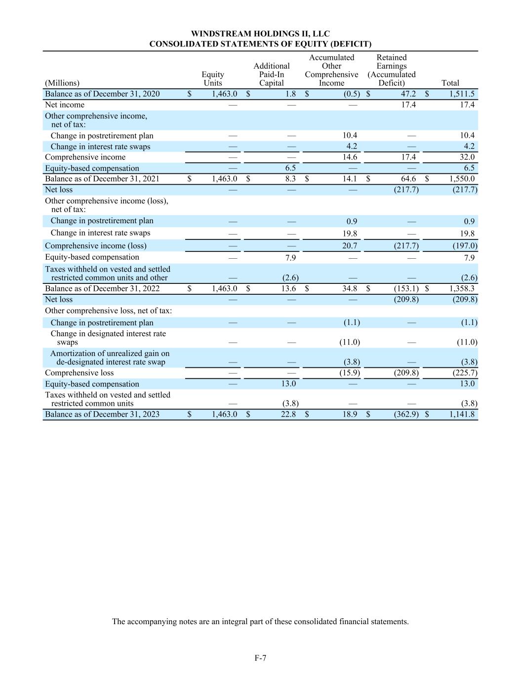 WINDSTREAM HOLDINGS II, LLC CONSOLIDATED STATEMENTS OF EQUITY (DEFICIT) (Millions) Equity Units Additional Paid-In Capital Accumulated Other Comprehensive Income Retained Earnings (Accumulated Deficit) Total Balance as of December 31, 2020 $ 1,463.0 $ 1.8 $ (0.5) $ 47.2 $ 1,511.5 Net income — — — 17.4 17.4 Other comprehensive income, net of tax: Change in postretirement plan — — 10.4 — 10.4 Change in interest rate swaps — — 4.2 — 4.2 Comprehensive income — — 14.6 17.4 32.0 Equity-based compensation — 6.5 — — 6.5 Balance as of December 31, 2021 $ 1,463.0 $ 8.3 $ 14.1 $ 64.6 $ 1,550.0 Net loss — — — (217.7) (217.7) Other comprehensive income (loss), net of tax: Change in postretirement plan — — 0.9 — 0.9 Change in interest rate swaps — — 19.8 — 19.8 Comprehensive income (loss) — — 20.7 (217.7) (197.0) Equity-based compensation — 7.9 — — 7.9 Taxes withheld on vested and settled restricted common units and other — (2.6) — — (2.6) Balance as of December 31, 2022 $ 1,463.0 $ 13.6 $ 34.8 $ (153.1) $ 1,358.3 Net loss — — — (209.8) (209.8) Other comprehensive loss, net of tax: Change in postretirement plan — — (1.1) — (1.1) Change in designated interest rate swaps — — (11.0) — (11.0) Amortization of unrealized gain on de-designated interest rate swap — — (3.8) — (3.8) Comprehensive loss — — (15.9) (209.8) (225.7) Equity-based compensation — 13.0 — — 13.0 Taxes withheld on vested and settled restricted common units — (3.8) — — (3.8) Balance as of December 31, 2023 $ 1,463.0 $ 22.8 $ 18.9 $ (362.9) $ 1,141.8 The accompanying notes are an integral part of these consolidated financial statements. F-7