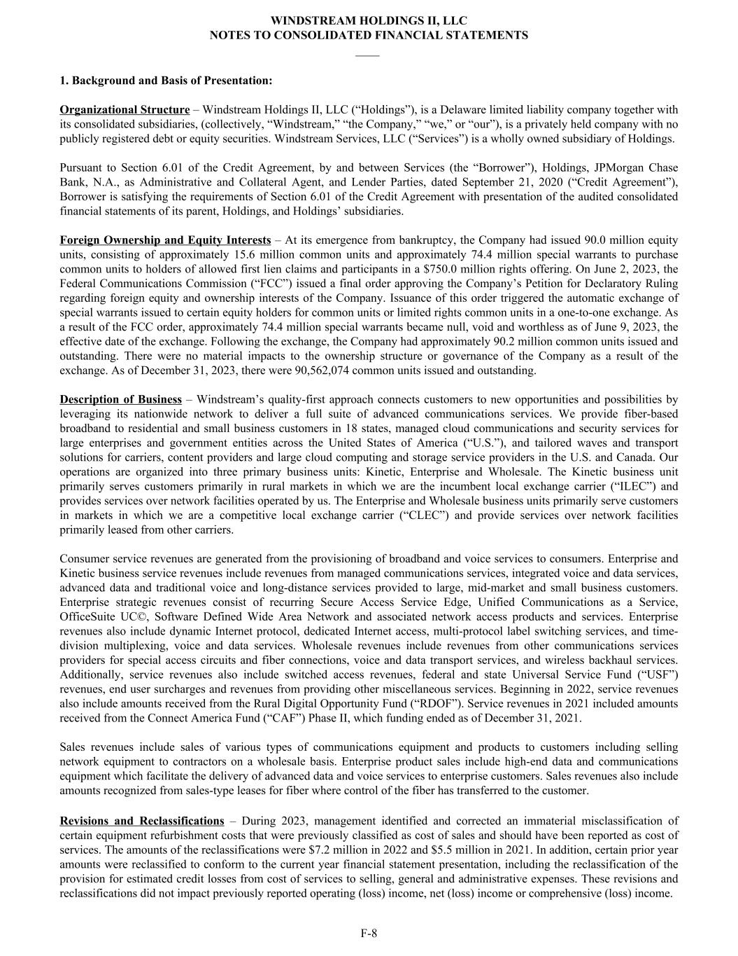 1. Background and Basis of Presentation: Organizational Structure – Windstream Holdings II, LLC (“Holdings”), is a Delaware limited liability company together with its consolidated subsidiaries, (collectively, “Windstream,” “the Company,” “we,” or “our”), is a privately held company with no publicly registered debt or equity securities. Windstream Services, LLC (“Services”) is a wholly owned subsidiary of Holdings. Pursuant to Section 6.01 of the Credit Agreement, by and between Services (the “Borrower”), Holdings, JPMorgan Chase Bank, N.A., as Administrative and Collateral Agent, and Lender Parties, dated September 21, 2020 (“Credit Agreement”), Borrower is satisfying the requirements of Section 6.01 of the Credit Agreement with presentation of the audited consolidated financial statements of its parent, Holdings, and Holdings’ subsidiaries. Foreign Ownership and Equity Interests – At its emergence from bankruptcy, the Company had issued 90.0 million equity units, consisting of approximately 15.6 million common units and approximately 74.4 million special warrants to purchase common units to holders of allowed first lien claims and participants in a $750.0 million rights offering. On June 2, 2023, the Federal Communications Commission (“FCC”) issued a final order approving the Company’s Petition for Declaratory Ruling regarding foreign equity and ownership interests of the Company. Issuance of this order triggered the automatic exchange of special warrants issued to certain equity holders for common units or limited rights common units in a one-to-one exchange. As a result of the FCC order, approximately 74.4 million special warrants became null, void and worthless as of June 9, 2023, the effective date of the exchange. Following the exchange, the Company had approximately 90.2 million common units issued and outstanding. There were no material impacts to the ownership structure or governance of the Company as a result of the exchange. As of December 31, 2023, there were 90,562,074 common units issued and outstanding. Description of Business – Windstream’s quality-first approach connects customers to new opportunities and possibilities by leveraging its nationwide network to deliver a full suite of advanced communications services. We provide fiber-based broadband to residential and small business customers in 18 states, managed cloud communications and security services for large enterprises and government entities across the United States of America (“U.S.”), and tailored waves and transport solutions for carriers, content providers and large cloud computing and storage service providers in the U.S. and Canada. Our operations are organized into three primary business units: Kinetic, Enterprise and Wholesale. The Kinetic business unit primarily serves customers primarily in rural markets in which we are the incumbent local exchange carrier (“ILEC”) and provides services over network facilities operated by us. The Enterprise and Wholesale business units primarily serve customers in markets in which we are a competitive local exchange carrier (“CLEC”) and provide services over network facilities primarily leased from other carriers. Consumer service revenues are generated from the provisioning of broadband and voice services to consumers. Enterprise and Kinetic business service revenues include revenues from managed communications services, integrated voice and data services, advanced data and traditional voice and long-distance services provided to large, mid-market and small business customers. Enterprise strategic revenues consist of recurring Secure Access Service Edge, Unified Communications as a Service, OfficeSuite UC©, Software Defined Wide Area Network and associated network access products and services. Enterprise revenues also include dynamic Internet protocol, dedicated Internet access, multi-protocol label switching services, and time- division multiplexing, voice and data services. Wholesale revenues include revenues from other communications services providers for special access circuits and fiber connections, voice and data transport services, and wireless backhaul services. Additionally, service revenues also include switched access revenues, federal and state Universal Service Fund (“USF”) revenues, end user surcharges and revenues from providing other miscellaneous services. Beginning in 2022, service revenues also include amounts received from the Rural Digital Opportunity Fund (“RDOF”). Service revenues in 2021 included amounts received from the Connect America Fund (“CAF”) Phase II, which funding ended as of December 31, 2021. Sales revenues include sales of various types of communications equipment and products to customers including selling network equipment to contractors on a wholesale basis. Enterprise product sales include high-end data and communications equipment which facilitate the delivery of advanced data and voice services to enterprise customers. Sales revenues also include amounts recognized from sales-type leases for fiber where control of the fiber has transferred to the customer. Revisions and Reclassifications – During 2023, management identified and corrected an immaterial misclassification of certain equipment refurbishment costs that were previously classified as cost of sales and should have been reported as cost of services. The amounts of the reclassifications were $7.2 million in 2022 and $5.5 million in 2021. In addition, certain prior year amounts were reclassified to conform to the current year financial statement presentation, including the reclassification of the provision for estimated credit losses from cost of services to selling, general and administrative expenses. These revisions and reclassifications did not impact previously reported operating (loss) income, net (loss) income or comprehensive (loss) income. WINDSTREAM HOLDINGS II, LLC NOTES TO CONSOLIDAT