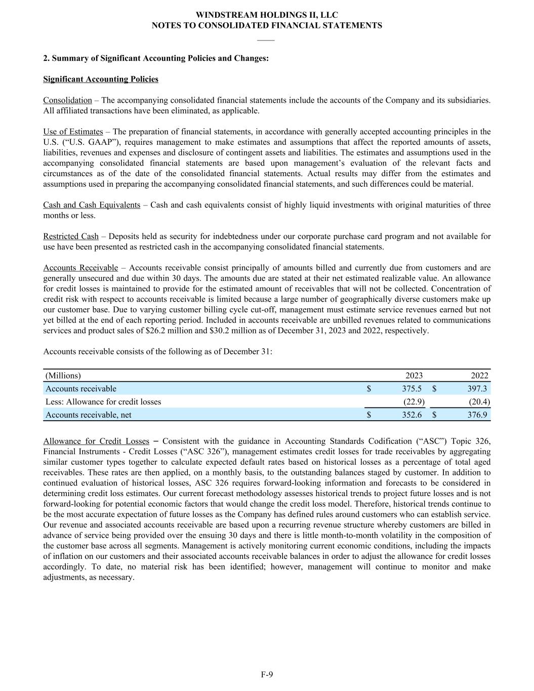 2. Summary of Significant Accounting Policies and Changes: Significant Accounting Policies Consolidation – The accompanying consolidated financial statements include the accounts of the Company and its subsidiaries. All affiliated transactions have been eliminated, as applicable. Use of Estimates – The preparation of financial statements, in accordance with generally accepted accounting principles in the U.S. (“U.S. GAAP”), requires management to make estimates and assumptions that affect the reported amounts of assets, liabilities, revenues and expenses and disclosure of contingent assets and liabilities. The estimates and assumptions used in the accompanying consolidated financial statements are based upon management’s evaluation of the relevant facts and circumstances as of the date of the consolidated financial statements. Actual results may differ from the estimates and assumptions used in preparing the accompanying consolidated financial statements, and such differences could be material. Cash and Cash Equivalents – Cash and cash equivalents consist of highly liquid investments with original maturities of three months or less. Restricted Cash – Deposits held as security for indebtedness under our corporate purchase card program and not available for use have been presented as restricted cash in the accompanying consolidated financial statements. Accounts Receivable – Accounts receivable consist principally of amounts billed and currently due from customers and are generally unsecured and due within 30 days. The amounts due are stated at their net estimated realizable value. An allowance for credit losses is maintained to provide for the estimated amount of receivables that will not be collected. Concentration of credit risk with respect to accounts receivable is limited because a large number of geographically diverse customers make up our customer base. Due to varying customer billing cycle cut-off, management must estimate service revenues earned but not yet billed at the end of each reporting period. Included in accounts receivable are unbilled revenues related to communications services and product sales of $26.2 million and $30.2 million as of December 31, 2023 and 2022, respectively. Accounts receivable consists of the following as of December 31: (Millions) 2023 2022 Accounts receivable $ 375.5 $ 397.3 Less: Allowance for credit losses (22.9) (20.4) Accounts receivable, net $ 352.6 $ 376.9 Allowance for Credit Losses – Consistent with the guidance in Accounting Standards Codification (“ASC”) Topic 326, Financial Instruments - Credit Losses (“ASC 326”), management estimates credit losses for trade receivables by aggregating similar customer types together to calculate expected default rates based on historical losses as a percentage of total aged receivables. These rates are then applied, on a monthly basis, to the outstanding balances staged by customer. In addition to continued evaluation of historical losses, ASC 326 requires forward-looking information and forecasts to be considered in determining credit loss estimates. Our current forecast methodology assesses historical trends to project future losses and is not forward-looking for potential economic factors that would change the credit loss model. Therefore, historical trends continue to be the most accurate expectation of future losses as the Company has defined rules around customers who can establish service. Our revenue and associated accounts receivable are based upon a recurring revenue structure whereby customers are billed in advance of service being provided over the ensuing 30 days and there is little month-to-month volatility in the composition of the customer base across all segments. Management is actively monitoring current economic conditions, including the impacts of inflation on our customers and their associated accounts receivable balances in order to adjust the allowance for credit losses accordingly. To date, no material risk has been identified; however, management will continue to monitor and make adjustments, as necessary. WINDSTREAM HOLDINGS II, LLC NOTES TO CONSOLIDATED FINANCIAL STATEMENTS ____ F-9