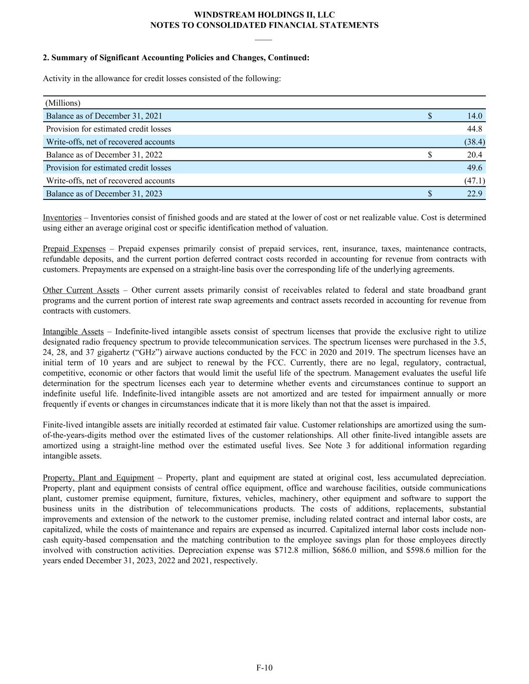 2. Summary of Significant Accounting Policies and Changes, Continued: Activity in the allowance for credit losses consisted of the following: (Millions) Balance as of December 31, 2021 $ 14.0 Provision for estimated credit losses 44.8 Write-offs, net of recovered accounts (38.4) Balance as of December 31, 2022 $ 20.4 Provision for estimated credit losses 49.6 Write-offs, net of recovered accounts (47.1) Balance as of December 31, 2023 $ 22.9 Inventories – Inventories consist of finished goods and are stated at the lower of cost or net realizable value. Cost is determined using either an average original cost or specific identification method of valuation. Prepaid Expenses – Prepaid expenses primarily consist of prepaid services, rent, insurance, taxes, maintenance contracts, refundable deposits, and the current portion deferred contract costs recorded in accounting for revenue from contracts with customers. Prepayments are expensed on a straight-line basis over the corresponding life of the underlying agreements. Other Current Assets – Other current assets primarily consist of receivables related to federal and state broadband grant programs and the current portion of interest rate swap agreements and contract assets recorded in accounting for revenue from contracts with customers. Intangible Assets – Indefinite-lived intangible assets consist of spectrum licenses that provide the exclusive right to utilize designated radio frequency spectrum to provide telecommunication services. The spectrum licenses were purchased in the 3.5, 24, 28, and 37 gigahertz (“GHz”) airwave auctions conducted by the FCC in 2020 and 2019. The spectrum licenses have an initial term of 10 years and are subject to renewal by the FCC. Currently, there are no legal, regulatory, contractual, competitive, economic or other factors that would limit the useful life of the spectrum. Management evaluates the useful life determination for the spectrum licenses each year to determine whether events and circumstances continue to support an indefinite useful life. Indefinite-lived intangible assets are not amortized and are tested for impairment annually or more frequently if events or changes in circumstances indicate that it is more likely than not that the asset is impaired. Finite-lived intangible assets are initially recorded at estimated fair value. Customer relationships are amortized using the sum- of-the-years-digits method over the estimated lives of the customer relationships. All other finite-lived intangible assets are amortized using a straight-line method over the estimated useful lives. See Note 3 for additional information regarding intangible assets. Property, Plant and Equipment – Property, plant and equipment are stated at original cost, less accumulated depreciation. Property, plant and equipment consists of central office equipment, office and warehouse facilities, outside communications plant, customer premise equipment, furniture, fixtures, vehicles, machinery, other equipment and software to support the business units in the distribution of telecommunications products. The costs of additions, replacements, substantial improvements and extension of the network to the customer premise, including related contract and internal labor costs, are capitalized, while the costs of maintenance and repairs are expensed as incurred. Capitalized internal labor costs include non- cash equity-based compensation and the matching contribution to the employee savings plan for those employees directly involved with construction activities. Depreciation expense was $712.8 million, $686.0 million, and $598.6 million for the years ended December 31, 2023, 2022 and 2021, respectively. WINDSTREAM HOLDINGS II, LLC NOTES TO CONSOLIDATED FINANCIAL STATEMENTS ____ F-10