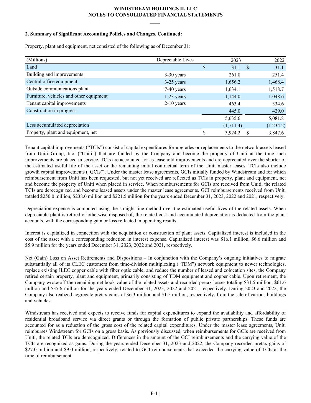 2. Summary of Significant Accounting Policies and Changes, Continued: Property, plant and equipment, net consisted of the following as of December 31: (Millions) Depreciable Lives 2023 2022 Land $ 31.1 $ 31.1 Building and improvements 3-30 years 261.8 251.4 Central office equipment 3-25 years 1,656.2 1,468.4 Outside communications plant 7-40 years 1,634.1 1,518.7 Furniture, vehicles and other equipment 1-23 years 1,144.0 1,048.6 Tenant capital improvements 2-10 years 463.4 334.6 Construction in progress 445.0 429.0 5,635.6 5,081.8 Less accumulated depreciation (1,711.4) (1,234.2) Property, plant and equipment, net $ 3,924.2 $ 3,847.6 Tenant capital improvements (“TCIs”) consist of capital expenditures for upgrades or replacements to the network assets leased from Uniti Group, Inc. (“Uniti”) that are funded by the Company and become the property of Uniti at the time such improvements are placed in service. TCIs are accounted for as leasehold improvements and are depreciated over the shorter of the estimated useful life of the asset or the remaining initial contractual term of the Uniti master leases. TCIs also include growth capital improvements (“GCIs”). Under the master lease agreements, GCIs initially funded by Windstream and for which reimbursement from Uniti has been requested, but not yet received are reflected as TCIs in property, plant and equipment, net and become the property of Uniti when placed in service. When reimbursements for GCIs are received from Uniti, the related TCIs are derecognized and become leased assets under the master lease agreements. GCI reimbursements received from Uniti totaled $250.0 million, $238.0 million and $221.5 million for the years ended December 31, 2023, 2022 and 2021, respectively. Depreciation expense is computed using the straight-line method over the estimated useful lives of the related assets. When depreciable plant is retired or otherwise disposed of, the related cost and accumulated depreciation is deducted from the plant accounts, with the corresponding gain or loss reflected in operating results. Interest is capitalized in connection with the acquisition or construction of plant assets. Capitalized interest is included in the cost of the asset with a corresponding reduction in interest expense. Capitalized interest was $16.1 million, $6.6 million and $5.9 million for the years ended December 31, 2023, 2022 and 2021, respectively. Net (Gain) Loss on Asset Retirements and Dispositions – In conjunction with the Company’s ongoing initiatives to migrate substantially all of its CLEC customers from time-division multiplexing (“TDM”) network equipment to newer technologies, replace existing ILEC copper cable with fiber optic cable, and reduce the number of leased and colocation sites, the Company retired certain property, plant and equipment, primarily consisting of TDM equipment and copper cable. Upon retirement, the Company wrote-off the remaining net book value of the related assets and recorded pretax losses totaling $31.5 million, $61.6 million and $35.6 million for the years ended December 31, 2023, 2022 and 2021, respectively. During 2023 and 2022, the Company also realized aggregate pretax gains of $6.3 million and $1.5 million, respectively, from the sale of various buildings and vehicles. Windstream has received and expects to receive funds for capital expenditures to expand the availability and affordability of residential broadband service via direct grants or through the formation of public private partnerships. These funds are accounted for as a reduction of the gross cost of the related capital expenditures. Under the master lease agreements, Uniti reimburses Windstream for GCIs on a gross basis. As previously discussed, when reimbursements for GCIs are received from Uniti, the related TCIs are derecognized. Differences in the amount of the GCI reimbursements and the carrying value of the TCIs are recognized as gains. During the years ended December 31, 2023 and 2022, the Company recorded pretax gains of $27.0 million and $9.0 million, respectively, related to GCI reimbursements that exceeded the carrying value of TCIs at the time of reimbursement. WINDSTREAM HOLDINGS II, LLC NOTES TO CONSOLIDATED FINANCIAL STATEMENTS ____ F-11